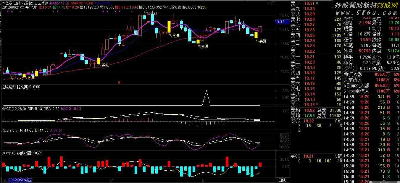 PS:指标不是万能的,不作为买卖依据,只作为参考。 A1:=(REF(O,4)/REF(C,4))>1.05;B:=(REF(C,3)+REF(C,2)+REF(C,1))/(REF(O,3)+REF(O,2)+REF(O,1));B1:=(REF(L,3)+REF(L,2)+REF(L,1))/3;B2:=REF(V,3)+REF(V,2)+REF(V,1)/4;A2:=B1<=REF(L,4);A3:=ABS(B-1)<0.02;A4:=C>B1 AND DYNAINFO(17)>1.1;A5:=REF(V,4)/B2>1.1;挖坑完成:A1 AND A2 AND A3 AND A4 AND A5; |