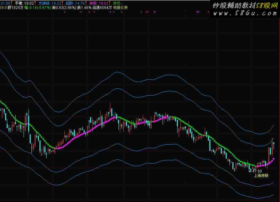 超涨:EMA(EMA(EMA(H,5),5),5)*1.2,COLORFF9900; 压力线:EMA(EMA(EMA(H,5),5),5)*1.12,COLORFF9900; 平衡:EMA(EMA(EMA(C,5),5),5),COLORFFFFFF; 支撑线:EMA(EMA(EMA(L,5),5),5)*0.88,COLORFF9900; 超跌:EMA(EMA(EMA(L,5),5),5)*0.8,COLORFF9900; 持股:IF(平衡>REF(平衡,1) AND C>平衡,EMA(EMA(EMA(C,5),5),5),DRAWNULL),LINETHICK6,POINTDOT, COLORFF00FF; 持币:IF(平衡<REF(平衡,1) AND C<平衡,EMA(EMA(EMA(C,5),5),5),DRAWNULL),LINETHICK6,POINTDOT, COLOR00BB00; DRAWTEXT_FIX(ISLASTBAR AND 平衡>REF(平衡,1) AND C>平衡,0.97,0.85,1,'上涨持股'),COLORYELLOW; DRAWTEXT_FIX(ISLASTBAR AND 平衡<REF(平衡,1) AND C<平衡,0.97,0.05,1,'下跌持币'),COLORWHITE; DRAWTEXT_FIX(ISLASTBAR AND ((平衡<REF(平衡,1) AND C>平衡) OR (平衡<REF(平衡,1) AND C> 平衡)),0.97,0.7,1,'观望'),COLORWHITE; DRAWTEXT_FIX(ISLASTBAR AND C<超跌 AND C=LLV(C,10) AND L=LLV(L,10),0.977,0.1,1,'抢反弹'), COLORWHITE; DRAWTEXT_FIX(ISLASTBAR AND C>超涨 AND C=HHV(C,10) AND H=HHV(H,10),0.97,0.9,1,'清仓'), COLORWHITE;