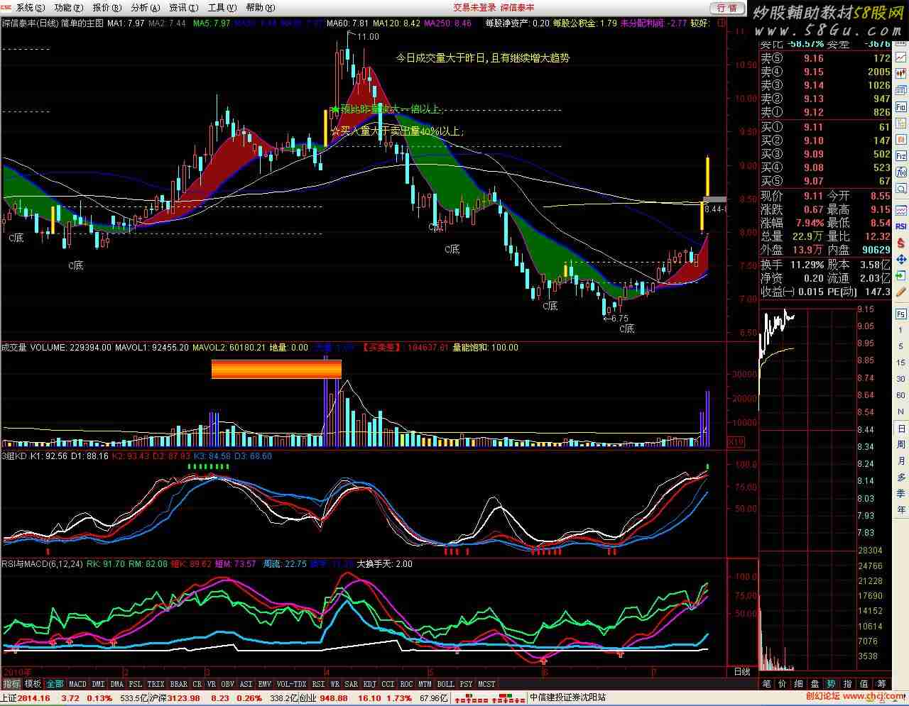 MA1:MA(C,7); MA2:MA(C,20),COLORGRAY,LINETHICK1; DRAWBAND(MA1,RGB(139,10,10),MA2,RGB(0,100,0)); MA5:MA(C,7); MA20:MA(C,20),COLORBLUE,LINETHICK2; MA30:MA(C,30); MA60:MA(C,60); MA120:MA(C,120); MA250:MA(C,250); DRAWTEXT(LAST(C<O,3,0) AND LAST(VOL<REF(VOL,1),3,0),L*0.975,'三阴缩量'); DRAWTEXT(LAST(MA(C,5)<MA(C,10),5,0) AND "CCI.CCI">REF("CCI.CCI",1) AND CROSS("CCI.CCI",-100),L*0.975,'C底'); DRAWKLINE(HIGH,OPEN,LOW,CLOSE); 每股净资产:FINANCE(34),NODRAW;{元>=5} 每股公积金:FINANCE(18),NODRAW;{元>=1} 未分配利润:FINANCE(32),NODRAW;{元>=0.5} 每股现金流:=FINANCE(26)/FINANCE(1),NODRAW;{元>=0.5} 发行总股本:=FINANCE(1)/100000000,NODRAW;{亿<10} 市场流通盘:=FINANCE(7)/100000000,NODRAW;{亿<3} 每股净资产优:=(每股净资产>=5*0.75); 每股公积金优:=(每股公积金>=1*0.75); 未分配利润优:=(未分配利润>=0.5*0.75); 每股现金流优:=(每股现金流>=0.5*0.75); 是小盘股的优:=(发行总股本<12.5 AND 市场流通盘<3.75); 其中一项优:=(每股净资产优 OR每股公积金优 OR未分配利润优 OR每股现金流优) AND 是小盘股的优,NODRAW; 最优的选择:=(每股净资产优 AND 每股公积金优 AND 未分配利润优 AND 每股现金流优 AND 是小盘股的优),NODRAW; 较好:(其中一项优),COLORYELLOW,NODRAW; 成才:(最优的选择),COLORRED,NODRAW; VV2:=IF(CURRBARSCOUNT=1,VOL*240/FROMOPEN/REF(VOL,1)-1,VOL/REF(VOL,1)-1); STICKLINE(VV2>=1,O,C,1,0),COLORYELLOW; AAAE:=(3*C+H+L+O)/6; VAR1:=(8*AAAE+7*REF(AAAE,1)+6*REF(AAAE,2)+5*REF(AAAE,3)+4*REF(AAAE,4)+3*REF(AAAE,5)+2*REF(AAAE,6)+REF(AAAE,8))/36; TJ1:=VOL>=HHV(VOL,3) AND VOL>2*REF(VOL,1) AND CLOSE>VAR1; 将军柱:=FILTER(TJ1,5); TJ2:=IF(BARSLAST(将军柱)=1 AND CLOSE>REF(HIGH,1),1,IF(BARSLAST(将军柱)=2 AND CLOSE>REF(HIGH,2),1,IF(BARSLAST(将军柱)=3 AND CLOSE>REF(HIGH,3),1,0))); STICKLINE(CLOSE,REF(HIGH,BARSLAST(将军柱)),REF(HIGH,BARSLAST(将军柱)),1,0),COLORYELLOW; STICKLINE(CLOSE,REF(LOW,BARSLAST(将军柱)),REF(LOW,BARSLAST(将军柱)),1,0),COLORCYAN; LTB:=FINANCE(7)*100/FINANCE(1); ZGB:=FINANCE(1)/100000000; JJS:=LTB-REF(LTB,1); DRAWTEXT(LTB<REF(LTB,1)*0.95 AND ZGB>REF(ZGB,1),L*0.990,'定向增发'),COLORFFFFFF; DRAWTEXT(ZGB<REF(ZGB,1)*0.95 AND LTB>REF(LTB,1),L*0.990,'回购'),COLORFFFFFF; DRAWTEXT(LTB>REF(LTB,1)*1.05 AND ZGB=REF(ZGB,1),L*0.990,'大小非'),COLORFFFFFF; DRAWTEXT(LTB>REF(LTB,1)*1.05 AND ZGB>REF(ZGB,1),L*0.990,'?公开发行'),COLORFFFFFF; TT:=240/FROMOPEN; 比:=TT; J12:=(HIGH - ((HIGH - LOW) / 3)); J23:=(LOW + ((HIGH - LOW) / 3)); AAA:=CONST(HHV(H,90)); BBB:=CONST(LLV(L,100)); T1:=CLOSE; T37{M9}:=CONST(V*比>REF(V,1) AND MA(V,5)>REF(MA(V,5),1)); T38{M10}:=CONST(V*比<REF(V,1) AND MA(V,5)>REF(MA(V,5),1)); T39{M11}:=CONST(V*比>REF(V,1)AND MA(V,5)<REF(MA(V,5),1)); T40{M12}:=CONST(V*比<REF(V,1)AND MA(V,5)<REF(MA(V,5),1)); T41{M13}:=CONST((((IF((CLOSE = OPEN),1,0) + IF((CLOSE >= J12),1,0)) + IF((CLOSE <= J23),1,0)) > 1)); T42{M14}:=CONST((((AMOUNT / VOL) / 100) > REF(HIGH,1))); T43{M15}:=CONST((((AMOUNT / VOL) / 100) < REF(LOW,1))); TS36:=IF(T1=1,0+0.03,0); TS37:=IF(T37=1,TS36+0.03,TS36); TS38:=IF(T38=1,TS37+0.03,TS37); TS39:=IF(T39=1,TS38+0.03,TS38); TS40:=IF(T40=1,TS39+0.03,TS39); TS41:=IF(T41=1,TS40+0.03,TS40); TS42:=IF(T42=1,TS41+0.03,TS41); TS43:=IF(T43=1,TS42+0.03,TS42); DRAWTEXT(T37=1 AND CURRBARSCOUNT=58,AAA-(AAA*TS37),'今日成交量大于昨日,且有继续增大趋势'),COLORYELLOW ; DRAWTEXT(T38=1 AND CURRBARSCOUNT=58,AAA-(AAA*TS38),'今日成交量小于昨日,但有放大迹象'),COLORFFFF00 ; DRAWTEXT(T39=1 AND CURRBARSCOUNT=58,AAA-(AAA*TS39),'今日成交量大于昨日, 但有缩小迹象'),COLORRED ; DRAWTEXT(T40=1 AND CURRBARSCOUNT=58,AAA-(AAA*TS40),'今日成交量小于昨日,且有缩小迹象'),COLORRED ; ZGD:=HHV(H,80)*0.99; ZGD2:=CONST(ZGD); WJ:=(H+L+C)/3; V1:=IF(H=L,1,H-MAX(O,C)); V2:=IF(H=L,1,MAX(C,O)-WJ); V3:=IF(H=L,1,MIN(O,C)-L); V4:=IF(H=L,1,WJ-MIN(C,O)); V5:=VOL/IF(H=L,4,H-L); V6:=(V1*V5); V7:=(V2*V5); V8:=(V3*V5); V9:=(V4*V5); 买盘1:=DYNAINFO(23)*比; 卖盘1:=DYNAINFO(22)*比; 买盘2:=IF(ISLASTBAR AND C>300,(V9+V8)*TT,(V9+V8)); 卖盘2:=IF(ISLASTBAR AND C>300,(V6+V7)*TT,(V6+V7)); 买盘:=IF(ISLASTBAR AND PERIOD=5 AND C<300,买盘1,买盘2); 卖盘:=IF(ISLASTBAR AND PERIOD=5 AND C<300,卖盘1,卖盘2); {买卖差:=买盘-卖盘;} MFI:=(HIGH-LOW)*1000000/(VOL*比); 绿灯:=MFI>=REF(MFI,1)AND VOL*比>=REF(VOL,1); M1:=CONST(绿灯); 衰退:=MFI<REF(MFI,1)AND VOL*比<REF(VOL,1); M2:=CONST(衰退); 伪装:=MFI>=REF(MFI,1)AND VOL*比<REF(VOL,1); M3:=CONST(伪装); 蛰伏:=MFI<REF(MFI,1)AND VOL*比>=REF(VOL,1); M4:=CONST(蛰伏); 量大:=(卖盘+买盘)/REF(VOL,1)>2; M5:=CONST(量大); 量缩:=REF(VOL,1)/(卖盘+买盘)>1.5; M6:=CONST(量缩); 卖量大:=(卖盘-买盘)/买盘>0.4; M7:=CONST(卖量大); 买量大:=(买盘-卖盘)/卖盘>0.4; M8:=CONST(买量大); TS1:=IF(M1=1,0.03+0.03,0.03); TS2:=IF(M2=1,TS1+0.03,TS1); TS3:=IF(M3=1,TS2+0.03,TS2); TS4:=IF(M4=1,TS3+0.03,TS3); TS5:=IF(M5=1,TS4+0.03,TS4); TS6:=IF(M6=1,TS5+0.03,TS5); TS7:=IF(M7=1,TS6+0.03,TS6); TS8:=IF(M8=1,TS7+0.03,TS7); DRAWTEXT(M5 AND CURRBARSCOUNT=70,ZGD2-(ZGD2*TS5),'★预比昨量放大一倍以上;'),COLORGREEN; DRAWTEXT(M6 AND CURRBARSCOUNT=70,ZGD2-(ZGD2*TS6),'★预比昨缩量一半以上;'),COLORYELLOW; DRAWTEXT(M7 AND CURRBARSCOUNT=70,ZGD2-(ZGD2*TS7),'☆卖出量大于买入量40%以上;'),COLORGREEN; DRAWTEXT(M8 AND CURRBARSCOUNT=70,ZGD2-(ZGD2*TS8),'☆买入量大于卖出量40%以上;'),COLORYELLOW; |
