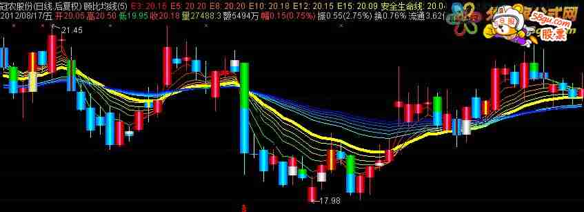 {18日收盘均价为安全生命线} {N 1 60 5}E3:EMA(C,3),COLOR0000FF,LINETHICK1;E5:EMA(C,5),COLOR0033FF,LINETHICK1;E8:EMA(C,8),COLOR0066FF,LINETHICK1;E10:EMA(C,10),COLOR0099FF,LINETHICK1;E12:EMA(C,12),COLOR00CCFF,LINETHICK1;E15:EMA(C,15),COLOR00FFFF,LINETHICK1;安全生命线:EMA(C,18),COLORYELLOW,LINETHICK4;E30:EMA(CLOSE,30),COLORFFFF00,LINETHICK1;E35:EMA(CLOSE,35),COLORFFCC00,LINETHICK1;E40:EMA(CLOSE,40),COLORFF9900,LINETHICK1;E45:EMA(CLOSE,45),COLORFF6600,LINETHICK1;E50:EMA(CLOSE,50),COLORFF3300,LINETHICK1;E55:EMA(CLOSE,55),COLORFF0000,LINETHICK1;IF(E3<=REF(E3,1),E3,DRAWNULL),COLOR00FF00,LINETHICK1;IF(E5<=REF(E5,1),E5,DRAWNULL),COLOR00FF33,LINETHICK1;IF(E8<=REF(E8,1),E8,DRAWNULL),COLOR00FF66,LINETHICK1;IF(E10<=REF(E10,1),E10,DRAWNULL),COLOR00FF99,LINETHICK1;IF(E12<=REF(E12,1),E12,DRAWNULL),COLOR00FFCC,LINETHICK1;IF(E15<=REF(E15,1),E15,DRAWNULL),COLOR00FFFF,LINETHICK1;{KDJ}RSV:=(CLOSE-LLV(LOW,9))/(HHV(HIGH,9)-LLV(LOW,9))*100;KX:=SMA(RSV,3,1);DX:=SMA(KX,3,1);JX:=3*KX-2*DX;M5:MA(CLOSE,N),COLOR000000;VAR1:=IF(CLOSE>OPEN,CLOSE,OPEN);{蓝}STICKLINE(OPEN>=CLOSE,CLOSE,OPEN,3,0),COLORFF7700;STICKLINE(OPEN>=CLOSE,CLOSE,OPEN,2.2,0),COLORFF9900;STICKLINE(OPEN>=CLOSE,CLOSE,OPEN,1.5,0),COLORFFBB00;STICKLINE(OPEN>=CLOSE,CLOSE,OPEN,0.5,0),COLORCYAN;{红}STICKLINE(CLOSE>OPEN,CLOSE,OPEN,3,0),COLOR000099;STICKLINE(CLOSE>OPEN,CLOSE,OPEN,2.2,0),COLOR0000CC;STICKLINE(CLOSE>OPEN,CLOSE,OPEN,1.5,0),COLOR0000FF;STICKLINE(CLOSE>OPEN,CLOSE,OPEN,0.5,0),COLORCC66FF;{绿} STICKLINE(CROSS(M5,EMA(C,3)),VAR1,(OPEN+CLOSE)/2,3,0),COLOR009900;STICKLINE(CROSS(M5,EMA(C,3)),VAR1,(OPEN+CLOSE)/2,2.2,0),COLOR00BB00; STICKLINE(CROSS(M5,EMA(C,3)),VAR1,(OPEN+CLOSE)/2,1.5,0),COLOR00DD00; STICKLINE(CROSS(M5,EMA(C,3)),VAR1,(OPEN+CLOSE)/2,0.5,0),COLOR00FF00;{灰}STICKLINE(CROSS(EMA(C,3),M5),OPEN,(OPEN+CLOSE)/2,3,0),COLOR999999;STICKLINE(CROSS(EMA(C,3),M5),OPEN,(OPEN+CLOSE)/2,2.2,0),COLORBBBBBB; STICKLINE(CROSS(EMA(C,3),M5),OPEN,(OPEN+CLOSE)/2,1.5,0),COLORDDDDDD; STICKLINE(CROSS(EMA(C,3),M5),OPEN,(OPEN+CLOSE)/2,0.5,0),COLORFFFFFF;STICKLINE(CROSS(JX,DX),OPEN,CLOSE,0.5,0),COLORYELLOW;STICKLINE(CROSS(DX,JX),OPEN,CLOSE,0.5,0),COLOR000099;{涨停}STICKLINE(CLOSE>REF(CLOSE,1)*1.0985 AND CLOSE=HIGH,CLOSE,OPEN,3,0),COLOR338888;STICKLINE(CLOSE>REF(CLOSE,1)*1.0985 AND CLOSE=HIGH,CLOSE,OPEN,2.2,0),COLOR33AAAA;STICKLINE(CLOSE>REF(CLOSE,1)*1.0985 AND CLOSE=HIGH,CLOSE,OPEN,1.5,0),COLOR33CCCC;STICKLINE(CLOSE>REF(CLOSE,1)*1.0985 AND CLOSE=HIGH,CLOSE,OPEN,0.5,0),COLORRED;{跌停}STICKLINE(CLOSE<REF(CLOSE,1)*0.9015 AND CLOSE=LOW,CLOSE,OPEN,3,0),COLOR009900;STICKLINE(CLOSE<REF(CLOSE,1)*0.9015 AND CLOSE=LOW,CLOSE,OPEN,2.2,0),COLOR00BB00;STICKLINE(CLOSE<REF(CLOSE,1)*0.9015 AND CLOSE=LOW,CLOSE,OPEN,1.5,0),COLOR00DD00;STICKLINE(CLOSE<REF(CLOSE,1)*0.9015 AND CLOSE=LOW,CLOSE,OPEN,0.5,0),COLORBLUE; |