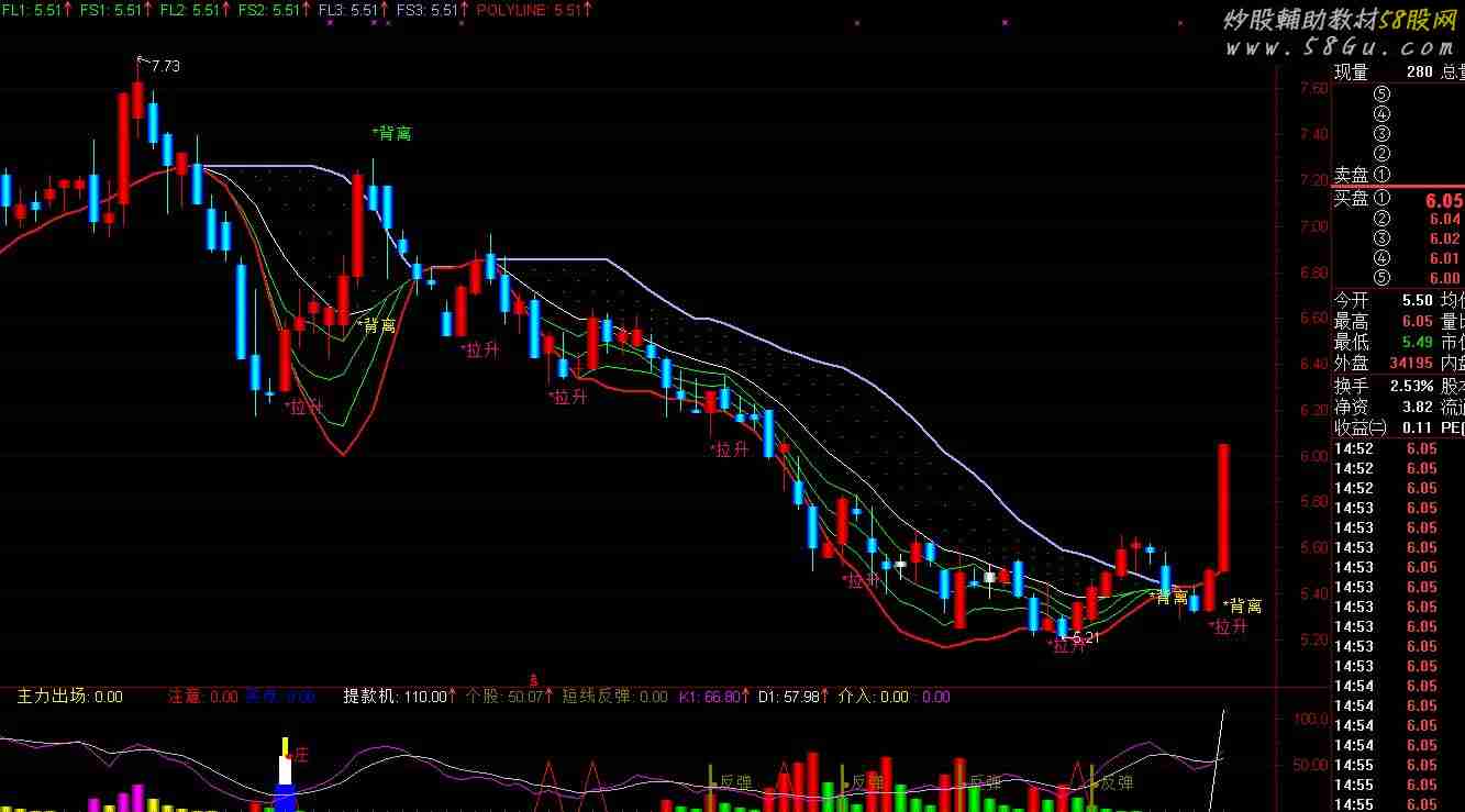 CG:MA((LOW+HIGH+CLOSE*2)/4,N); FL:HHV(CG,3),COLORGREEN,POINTDOT; FS:IF(CG<FL,(CG-(FL-CG)),FL),COLORGREEN,; FL1:HHV(CG,5),COLORGREEN,POINTDOT; FS1:IF(CG<FL1,(CG-(FL1-CG)),FL1),COLORGREEN,; FL2:HHV(CG,7),COLORGREEN,POINTDOT; FS2:IF(CG<FL2,(CG-(FL2-CG)),FL2),COLORGREEN,; FL3:HHV(CG,9),COLORFFABA3,LINETHICK2; FS3:IF(CG<FL3,(CG-(FL3-CG)),FL3),COLORFFABA3,LINETHICK2; ZLZC1:=(HHV(H,144)-((HHV(H,144)-LLV(L,144))*0.618)),POINTDOT,LINETHICK2; ZLZC2:=(HHV(H,144)-((HHV(H,144)-LLV(L,144))*0.5)),POINTDOT,LINETHICK2; ZLZC3:=(HHV(H,144)-((HHV(H,144)-LLV(L,144))*0.382)); POLYLINE:(FS3>MA(FS3,5),FS3),COLOR1010F1,LINETHICK2; STICKLINE(CLOSE> REF(CLOSE,1) ,HIGH,LOW,0,1 ),COLORRED; STICKLINE(CLOSE> REF(CLOSE,1) ,OPEN,CLOSE,3,0 ),COLOR000055; STICKLINE(CLOSE> REF(CLOSE,1) ,OPEN,CLOSE,2.7,0 ),COLOR000077; STICKLINE(CLOSE> REF(CLOSE,1) ,OPEN,CLOSE,2.1,0 ),COLOR000099; STICKLINE(CLOSE> REF(CLOSE,1) ,OPEN,CLOSE,1.5,0 ),COLOR0000BB; STICKLINE(CLOSE> REF(CLOSE,1) ,OPEN,CLOSE,0.9,0 ),COLOR0000DD; STICKLINE(CLOSE> REF(CLOSE,1) ,OPEN,CLOSE,0.3,0 ),COLOR0000FF; STICKLINE(CLOSE= REF(CLOSE,1) ,HIGH,LOW,0,1 ),COLORWHITE; STICKLINE(CLOSE= REF(CLOSE,1) ,OPEN,CLOSE,3,0 ),COLOR555555; STICKLINE(CLOSE= REF(CLOSE,1) ,OPEN,CLOSE,2.7,0 ),COLOR777777; STICKLINE(CLOSE= REF(CLOSE,1) ,OPEN,CLOSE,2.1,0 ),COLOR999999; STICKLINE(CLOSE= REF(CLOSE,1) ,OPEN,CLOSE,1.5,0 ),COLORBBBBBB; STICKLINE(CLOSE= REF(CLOSE,1) ,OPEN,CLOSE,0.9,0 ),COLORDDDDDD; STICKLINE(CLOSE= REF(CLOSE,1) ,OPEN,CLOSE,0.3,0 ),COLORFFFFFF; STICKLINE(CLOSE< REF(CLOSE,1) ,HIGH,LOW,0,1 ),COLORCYAN; STICKLINE(CLOSE< REF(CLOSE,1) ,OPEN,CLOSE,3,0 ),COLOR990000; STICKLINE(CLOSE< REF(CLOSE,1) ,OPEN,CLOSE,2.7,0 ),COLORCC0000; STICKLINE(CLOSE< REF(CLOSE,1) ,OPEN,CLOSE,2.1,0 ),COLORFF4400; STICKLINE(CLOSE< REF(CLOSE,1) ,OPEN,CLOSE,1.5,0 ),COLORFF8800; STICKLINE(CLOSE< REF(CLOSE,1) ,OPEN,CLOSE,0.9,0 ),COLORFFCC00; STICKLINE(CLOSE< REF(CLOSE,1) ,OPEN,CLOSE,0.3,0 ),COLORCYAN; LC:=REF(CLOSE,1);RSI:=((SMA(MAX((CLOSE - LC),0),3,1) / SMA(ABS((CLOSE - LC)),3,1)) * 100); FF:=EMA(CLOSE,3);MA15:=EMA(CLOSE,21);DRAWTEXT(CROSS(FF,MA15),(LOW * 0.98),'*背离'),COLORYELLOW; DRAWTEXT(CROSS(88,RSI),(HIGH * 1.02),'*背离'),COLORGREEN; MTM:=C-REF(C,1);DX:=100*EMA(EMA(MTM,6),6)/EMA(EMA(ABS(MTM),6),6); 买:=IF(LLV(DX,2)=LLV(DX,7) AND COUNT(DX<0,2) AND CROSS(DX,MA(DX,2)),1,0); DRAWTEXT(FILTER(买=1,5),LOW-0.03,'*拉升'),COLORLIMAGENTA;