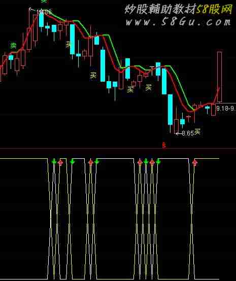 向上红箭头买进,向下绿箭头卖出。WR1:=110*(HHV(HIGH,20)-EMA(C,5))/(HHV(HIGH,20)-LLV(LOW,20));WR2:=110*(HHV(HIGH,5)-EMA(C,1))/(HHV(HIGH,5)-LLV(LOW,5));G:=BARSLAST(CROSS(WR1,WR2))/2+49;XG1:=WR2>G;XG2:=G>WR2;选股:CROSS(XG2,XG1);