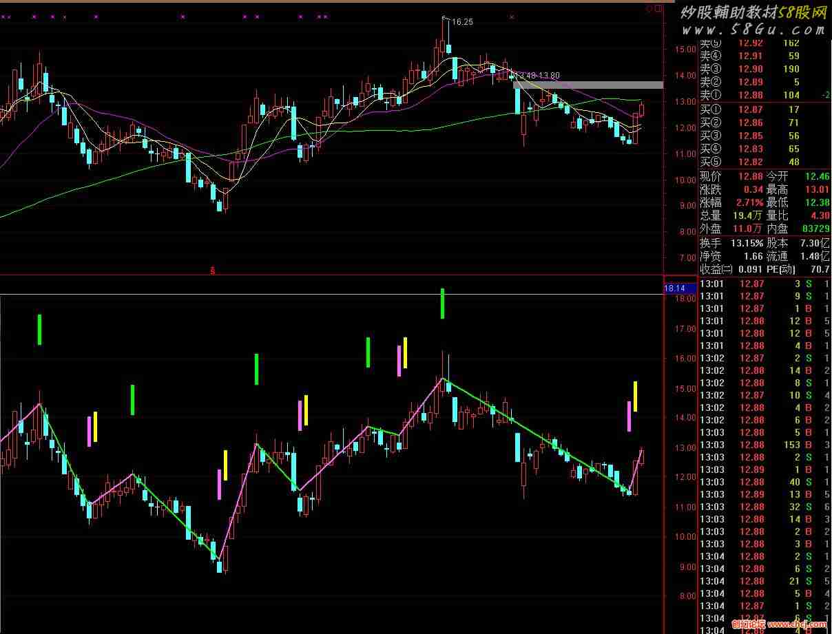 A2:=REF(L,90)-2*REF(L,1); A3:=REF((H+L),1); B2:=FILTER(A2,A3+2); U11:=B2>REF(B2,1); 走势:DRAWLINE(B2,REF(L,1),U11,REF(L,1),1),COLORFFFF00; STICKLINE(走势>REF(走势,1),走势-2,走势-2.1,0.5,0),COLORRED; STICKLINE(走势>REF(走势,1),走势-2.1,走势-2.2,0.9,0),COLORRED; STICKLINE(走势>REF(走势,1),走势-2.2,走势-2.3,1.5,0),COLORRED; STICKLINE(走势>REF(走势,1),走势-2.3,走势-2.5,2.5,0),COLORRED; STICKLINE(走势>REF(走势,1),走势-2.5,走势-4,0.5,1),COLORRED;