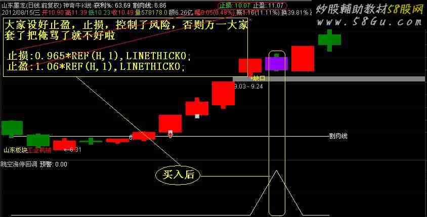 止损就要心狠手辣,木要用自已的资金和明天赌即使卖出后大涨也木后悔. 大家设好止盈,止损,控制了风险,否则万一大家套了把俺骂了就不好啦! 止损:0.965*REF(H,1),LINETHICK0; 止盈:1.06*REF(H,1),LINETHICK0;