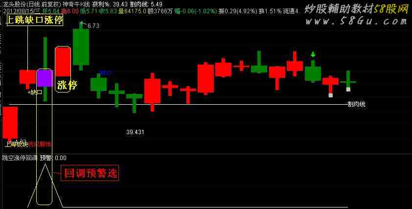 指标指标设计编程的探索 说明:俺今天瞎弄啦跳空涨停回调预警选股,指标设计编程完工。俺请朋友用60%的力气去找失败的情况并且力图优化它。期望高手、大师指教。欢迎朋友指点一、二。 俺也想从创新中受益非浅,同时也让小三厚泽无穷。参看;{有股友敢玩、俺就顺水人情帮他做缺口选股}。如此帖违反版规规定,请大庆老杨版主、戓管理层按版规规定删除处理!!! 指标设计“上跳缺口涨停回调预警选股”条件:(无末来函数) 1:个股趋势向上,中轨大于或等于0。 2:上跳缺口涨停个股(连续三天涨停的不要)。 3:上跳缺口涨停后10个以内交易日(即包括1至10天)股价回调至涨停开盘价上下的正、负1%预警选股。 4:目标1至5天赚10%。 5:刚瞎弄的东东,木经过实战就木放出笼啦,不然别人会说用俺的东东亏钱就木好啦。请朋友凉解! 6:期盼更多的精品! 7:通达信软件