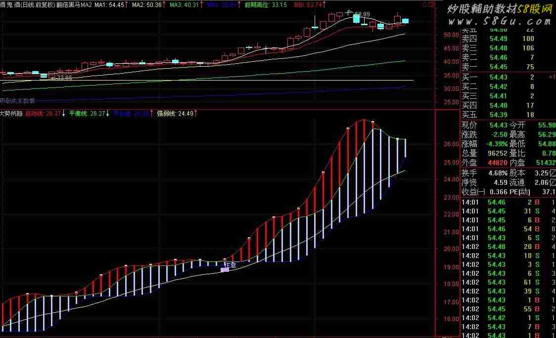 启动线:SUM(EMA((C+L)/2,2),5)/10.158,COLORRED; 平衡线:LLV(SUM( EMA((C+L)/2,2),5)/10.158,4),COLORGREEN; 平台线:LLV(SUM( EMA((C+L)/2,2),5)/10.158,10),COLORBLUE; 强弱线:EMA(启动线,21),COLORYELLOW; STICKLINE(平台线<启动线,启动线,平台线,0.1,0),COLORFFCCAA; STICKLINE(平衡线<启动线,启动线,平衡线,0.1,0),COLORRED; VAR1:=2*MA(LLV((C+L)/2,8)*1.1,13)-EMA((C+L)/2,3)-((C+L)/2)*0.1; VAR2:=IF((EMA((C+L)/2,3)-VAR1)*5>0,POW((EMA((C+L)/2,3)-VAR1)*5,2)/10,-1*POW((EMA((C+L)/2,3)-VAR1)*5,2)/10); VAR3:=IF(VAR2>0,VAR2-0,0); STICKLINE(VAR3>0 AND REF(VAR3,1)=0 AND (C+L)/2>MA((C+L)/2,8), 强弱线,强弱线+0.2,4,0),COLORFFAACC; DRAWTEXT(VAR3>0 AND REF(VAR3,1)=0 AND (C+L)/2>MA((C+L)/2,8), 强弱线+0.35,'注意'),LINETHICK3,COLORFFAACC; |