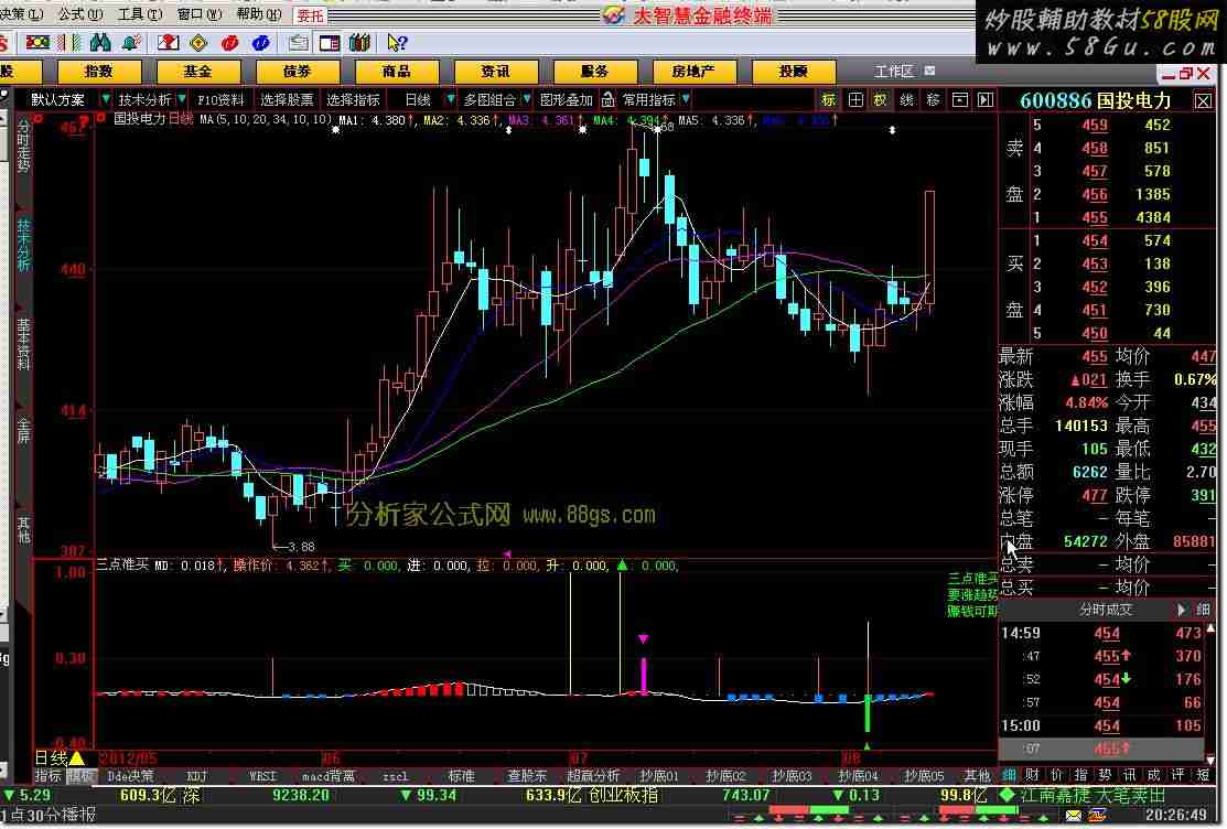 {三点准买} DIF:=EMA(CLOSE,12)-EMA(CLOSE,29); DEA:=EMA(DIF,9); MD:(DIF-DEA)*2; STICKLINE(MD>=REF(MD,1) AND MD>0,0,MD,7,0),COLORRED; STICKLINE(MD<REF(MD,1) AND MD>0,0,MD,7,1),ColorC0C0C0; STICKLINE(MD>REF(MD,1) AND MD<0,0,MD,7,0),ColorFF8000; 蓝柱:=if(MD>REF(MD,1) AND MD<0,8,0); 红柱:=if(MD>=REF(MD,1) AND MD>0,8,0); DRAWTEXTABS(775,0,'三点准买:1,尾盘30分钟日线预选出▲及"买进拉升"信号股;'),Color00FF00; DRAWTEXTABS(775,15,'要涨趋势: 2,查看其周线及大盘均在:兰柱缩短红柱伸高涨势;'),Color00FF00; DRAWTEXTABS(775,30,'赚钱可期:3,末10分钟信号确定并要K线收红又过操作价可买入。'),Color00FF00; 操作价: MA((LOW+HIGH+CLOSE)/3,5),LINETHICK0,Color4080FF; 买:if(cross(c,操作价) and 蓝柱 AND REF("KDJ.J",1)<0 AND "KDJ.J">0,0.8,0),STICK,Color00FF00,linethick1; var1:=4*SMA((CLOSE-LLV(LOW,6))/(HHV(HIGH,6)-LLV(LOW,6))*100,5,1)- 3*SMA(SMA((CLOSE-LLV(LOW,6))/(HHV(HIGH,6)-LLV(LOW,6))*100,5,1),3.2,1); 进: IF(cross(c,操作价) and 蓝柱 and CROSS(var1,8),0.6,0),ColorFFFFFF,STICK,linethick1; MTM:=C-REF(C,1); DX:=EMA(EMA(MTM,6),6)/EMA(EMA(ABS(MTM),6),6); 拉:IF(LLV(DX,2)=LLV(DX,7) AND COUNT(DX<0,2) AND CROSS(DX,MA(DX,2)),0.3,0),Color0080FF,STICK,linethick1; 升:cross(DIF,DEA) and cross(MD,0) and cross(c,操作价) and 红柱,Color00FFFF,STICK,linethick1; {上面信号无未来函数不会漂移} {下面▼▲有未来函数可作趋势研判用,当“▲”和信号同时出现时更准} ▲:(ZIG(3,5)>REF(ZIG(3,5),1)) AND (REF(ZIG(3,5),1)<=REF(ZIG(3,5),2)) AND (REF(ZIG (3,5),2)<=REF(ZIG(3,5),3)),linethick0,Color00FF00; ▼:=(ZIG(3,5)<REF(ZIG(3,5),1)) AND (REF(ZIG(3,5),1)>=REF(ZIG(3,5),2)) AND (REF(ZIG (3,5),2)>=REF(ZIG(3,5),3)); STICKLINE((▲=1),(-0.3),0,4,0),Color00FF00; DRAWTEXT((▲=1),(-0.4),'▲'),Color00FF00,ALIGN1; STICKLINE((▼=1),0.3,0,4,0),COLORff00ff; DRAWTEXT((▼=1),0.5,'▼'),COLORff00ff,ALIGN1;