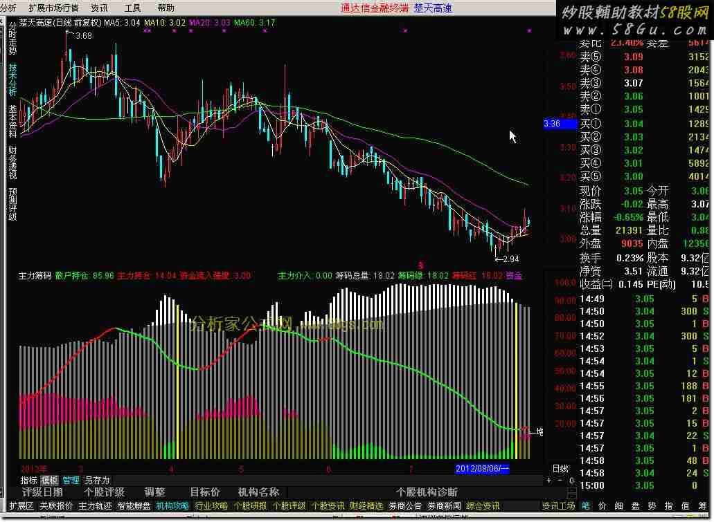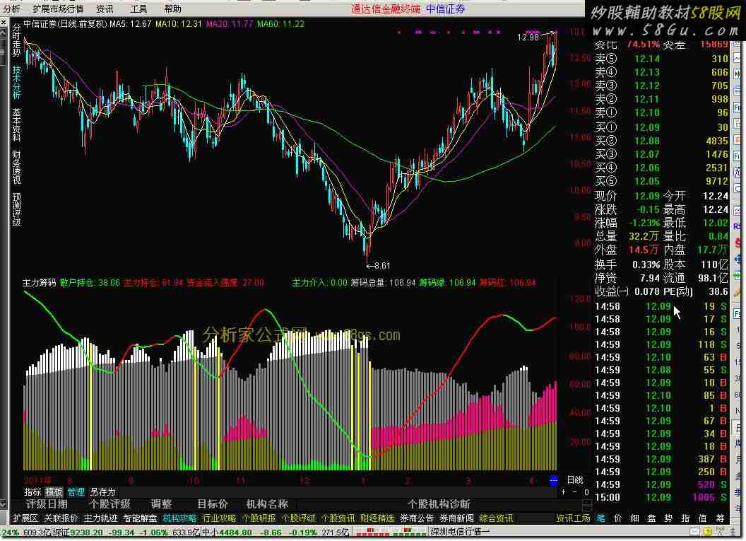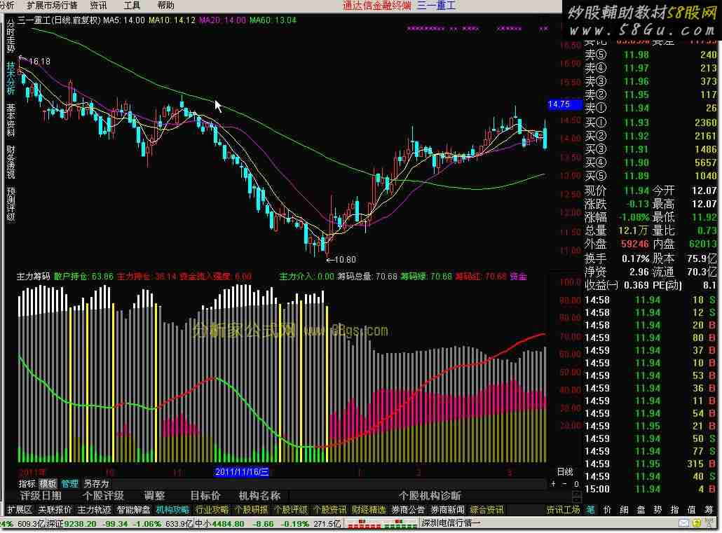 主力筹码:=IF(C<0,0,EMA(WINNER(CLOSE)*70,3));散户筹码:=IF(C<0,0,EMA((WINNER(CLOSE*1.1)-WINNER(CLOSE*0.9))*80,3));散户持仓:IF(C<0,0,散户筹码/(主力筹码+散户筹码)*100),COLORGREEN,NODRAW;主力持仓:IF(C<0,0,主力筹码/(主力筹码+散户筹码)*100),COLORRED,NODRAW;散户资金:=IF(C<0,0,EMA(散户持仓,89));主力资金:=IF(C<0,0,EMA(主力持仓,89));资金流入强度:IF(C<0,0,INTPART(主力持仓-主力资金)),NODRAW,COLOR0000FF;SH8:=IF(C<0,0,EMA(散户持仓,8));STICKLINE(CLOSE>0,散户持仓,主力持仓,1,0),COLORGRAY;STICKLINE(散户资金>REF(散户资金,1),散户持仓,散户资金,1,0),COLORWHITE;STICKLINE(CLOSE>0,主力持仓,0,1,0),COLORBROWN;STICKLINE(主力持仓>75,主力持仓,0,1,0),COLORRED;STICKLINE(主力资金>REF(主力资金,1),主力持仓,主力资金,1,0),COLORLIMAGENTA;STICKLINE(散户持仓>=90,主力持仓,0,1,0),COLORGREEN;STICKLINE(REF(散户持仓,1)>90 AND 散户持仓<90,0,散户持仓,1,0),COLORYELLOW;主力介入:REF(散户持仓,1)>90 AND 散户持仓<90,NODRAW;筹码总量:IF(C<0,0,MA(主力筹码+散户筹码,13)),NODRAW;筹码绿:IF(CLOSE>0,筹码总量,DRAWNULL),COLORGREEN,LINETHICK2;筹码红:IF(筹码总量>REF(筹码总量,1),筹码总量,DRAWNULL),COLORRED,LINETHICK2;资金流入:IF(主力资金>REF(主力资金,1),主力持仓,DRAWNULL),COLORMAGENTA,NODRAW;DRAWTEXT(筹码总量>REF(筹码总量,1) AND SH8<REF(SH8,1) AND ISLASTBAR,筹码总量,'←增量资金');选股:COUNT(主力介入=1,3) AND 筹码红 AND 资金流入,NODRAW,COLORYELLOW;   |