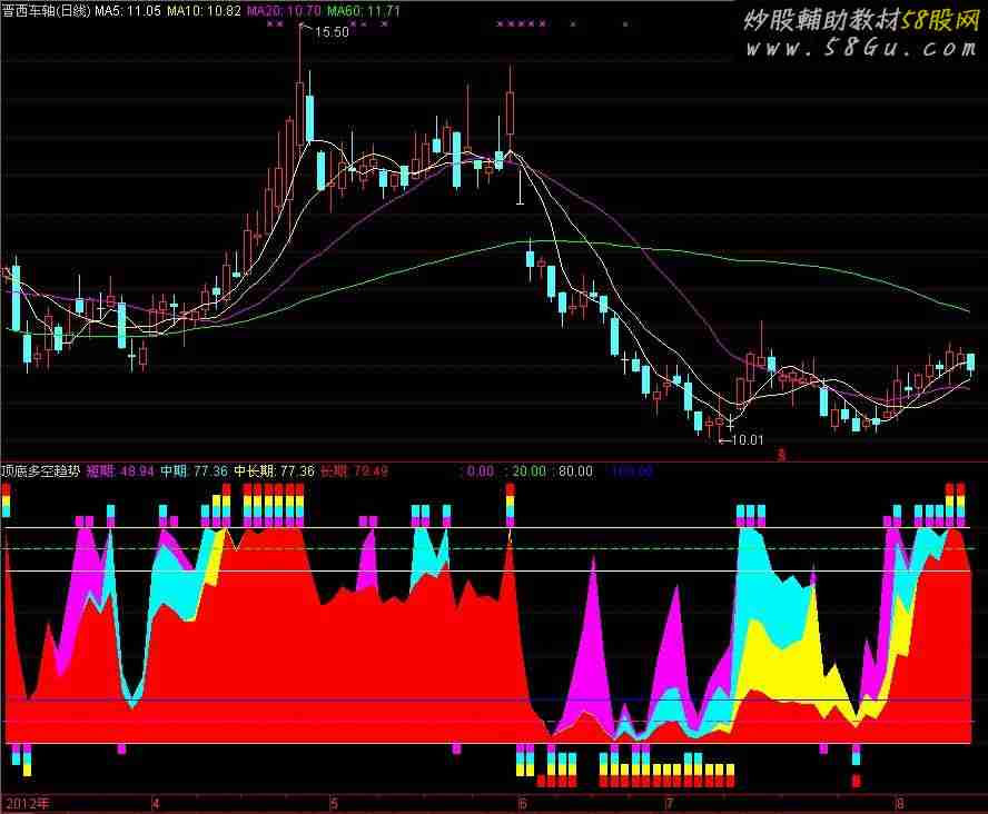 根据大家常用的多空线指标进行美化,分别在上下两处标识出顶底识别的讯号,可为操盘提供参考依据。(具体使用方法自己研究)仅供参考!!! 短期:100*(C-LLV(L,5))/(HHV(C,5)-LLV(L,5)),COLORFF00FF;中期:100*(C-LLV(L,10))/(HHV(C,10)-LLV(L,10)),COLORFFFF00;中长期:100*(C-LLV(L,20))/(HHV(C,20)-LLV(L,20)),COLOR00FFFF;长期:100*(C-LLV(L,30))/(HHV(C,30)-LLV(L,30)),COLOR0000FF;DRAWBAND(短期,RGB(250,0,250),0,RGB(0,0,0));DRAWBAND(中期,RGB(0,250,250),0,RGB(0,0,0));DRAWBAND(中长期,RGB(250,250,0),0,RGB(0,0,0));DRAWBAND(长期,RGB(250,0,0),0,RGB(0,0,0));STICKLINE(短期>=90,100,105,2,0),COLORFF00FF;STICKLINE(短期<=10,0,-5,2,0),COLORFF00FF;STICKLINE(中期>=90,105,110,2,0),COLORFFFF00;STICKLINE(中期<=10,-5,-10,2,0),COLORFFFF00;STICKLINE(中长期>=90,110,115,2,0),COLOR00FFFF;STICKLINE(中长期<=10,-10,-15,2,0),COLOR00FFFF;STICKLINE(长期>=90,115,120,2,0),COLOR0000FF;STICKLINE(长期<=10,-15,-20,2,0),COLOR0000FF;0;STICKLINE(C>0,10,10,2,0),COLORFF00FF;20;80;STICKLINE(C>0,90,90,2,0),COLOR00FF00;100; |