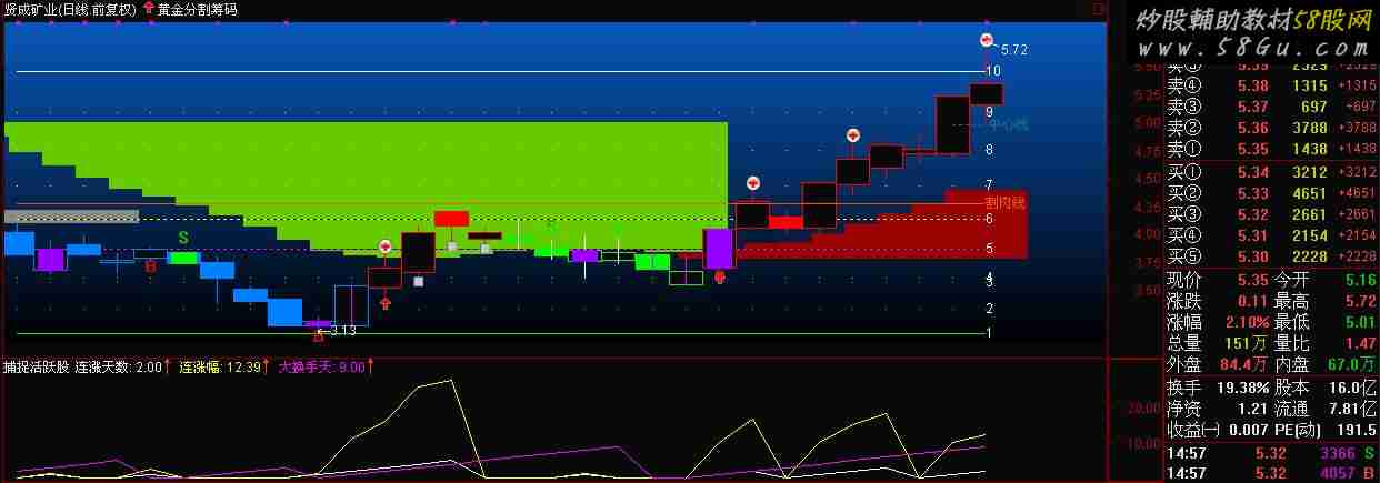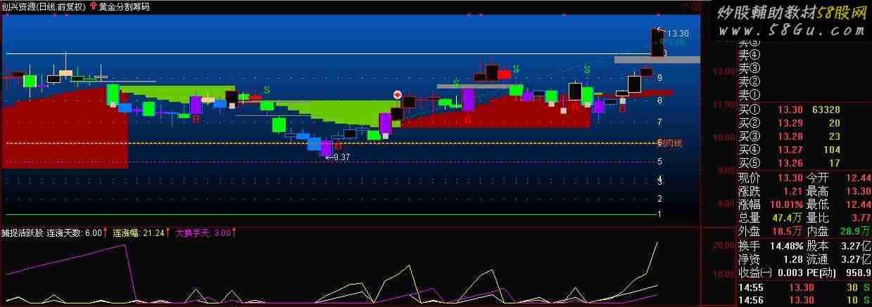说明;纯粹娱乐 ^o^,交流是为了更好的赚钱。 捕捉活跃股源码(换手率跟踪或排序指标) 连涨天数:BARSLASTCOUNT(C>REF(C,1)); 连涨幅:IF(C>REF(C,1),(C-REF(C,连涨天数))/REF(C,连涨天数)*100,0); 换手:=V/CAPITAL*100; 大换手天:BARSLASTCOUNT(换手>4);