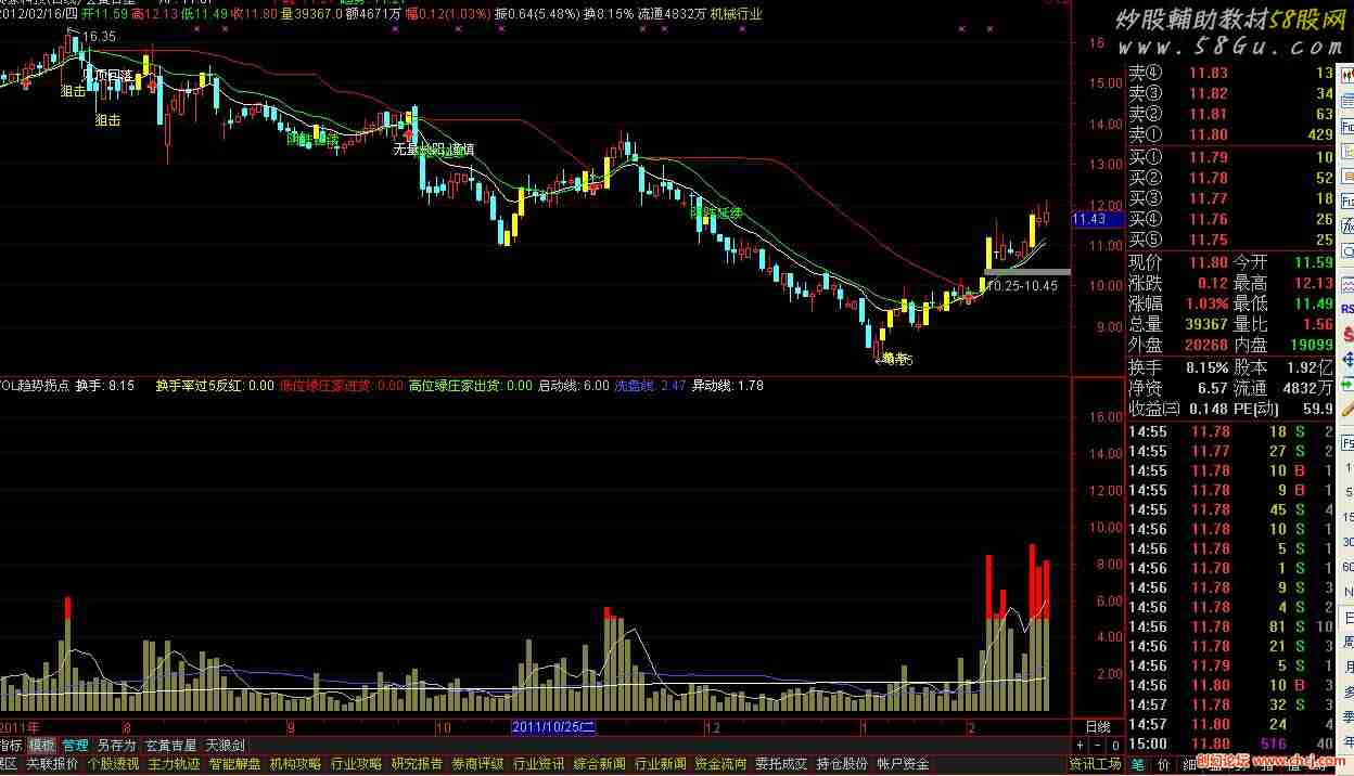 M1:=5;M2:=35;M3:=135; 换手:VOL/CAPITAL*100,NODRAW; STICKLINE(C,0,换手,2,0),COLOR408080; {累计:SUM(换手,3),LINESTICK;} STICKLINE(换手>5,5,换手,2,0),COLORRED;