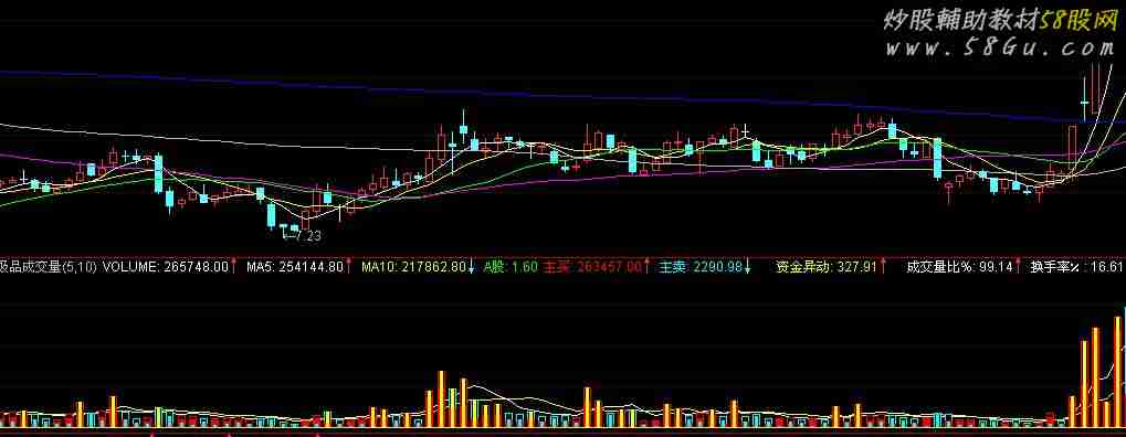 1.A股指流通股多少亿手;(判断大盘和小盘的依据) 2.柱状图中红线框指总成交量,红色填满区域代表主动买入估算,绿色填满区域代表主动卖出估算。(单位:金额) 3.资金异动指近期此股有无异常资金进出,柱状图以黄色柱状显示; 4.五角星代表五日均量上穿13日均量,量能放大。换手率就不说了,大家都知道。 5.长时间无黄柱或希希拉拉,说明无大资金进入,股票将继续原有趋势;有黄色柱状出现,此时有资金进入,连续黄柱出现,说明明显有庄家进入,可跟进待涨。 6.当天成交量上85%以上,第二天很大可能有新高,新高就是我们超短线族的获利! 参数:M1 最小2 最大500 缺损 5 M2 最小2 最大500 缺损 10VOLUME:VOL,VOLSTICK;MA5:MA(VOLUME,M1);MA10:MA(VOLUME,M2);{VAR1:=DYNAINFO(17)*REF(MA(VOL,5),1);VAR2:=DYNAINFO(7)=CLOSE AND DYNAINFO(10)=AMOUNT;预测:=IF(DYNAINFO(7)=CLOSE AND DYNAINFO(10)=AMOUNT,VAR1,VAR2)/10000;预测量:STICKLINE(IF(DYNAINFO(7)=CLOSE AND DYNAINFO(10)=AMOUNT,VAR1,VAR2),VAR1,0,7,1),COLORGRAY;}AA:=VOL/((HIGH-LOW)*2-ABS(CLOSE-OPEN));主买:IF(CLOSE>OPEN,AA*(HIGH-LOW),IF(CLOSE<OPEN,AA*((HIGH-OPEN)+(CLOSE-LOW)),VOL /2)),POINTDOT,COLORRED;主卖:IF(CLOSE>OPEN,AA*((HIGH-CLOSE)+(OPEN-LOW)),IF(CLOSE<OPEN,AA*(HIGH-LOW),VOL /2)),COLORCYAN,POINTDOT;STICKLINE(C>=REF(C,1) ,0,VOL,2.2,1),COLORRED;STICKLINE(C<REF(C,1),0,VOL,2.2,1),COLORCYAN;STICKLINE(主买>0,0,主买,2.2,0),COLORRED;资金异动:VOL/MA(VOL,55)*100,COLORYELLOW;STICKLINE(主卖>0,0,主卖,0.8,0),COLORCYAN;STICKLINE(资金异动>100 ,0,VOL,0.1,0),COLORYELLOW;成交量比%:主买/VOL*100,COLORWHITE,NODRAW;换手率%:VOL/CAPITAL*100,POINTDOT,COLORWHITE;  |
