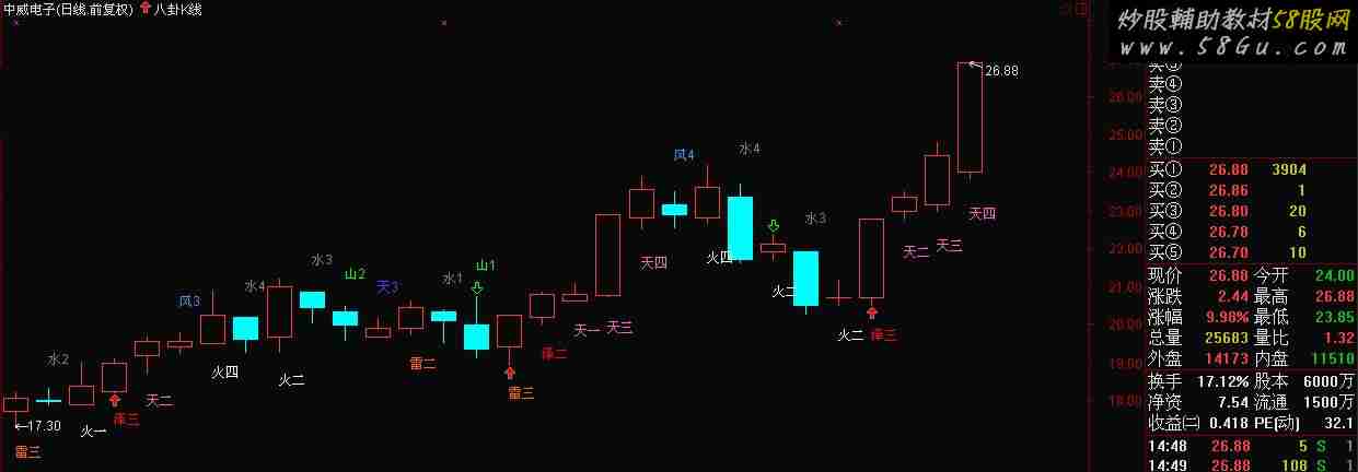 原理简介:k线上方标注的为,山,地,雷依次表示 顶部转势头 加速下跌相对低位后面的1234代表强度都1最强 4最弱,山变地,地变雷 ,强度越大越易变化。K线下方标注为,泽,天,风依次表示底部转势,加速上涨,相对高位。后面的一二三四代表强度,一最弱,四最强,泽变天,天变风。 六者循环生生不息,即山—地——雷——泽——天——风。 另水火两卦,分别表示有利调整 不利调整。有利调整路线风——火——泽 不利调整路线 雷——水——山既调整后继续上涨,调整后继续下跌。 最后,这其实是先天八卦阴阳循环最浅显的道理,不能作为买卖依据。最后用在周线上。 但是结合K线进行买卖,效果不错。K线为主,八卦为辅助,切记。阳:=C-REF(C,1)>0 OR (C-REF(C,1)=0 AND C>O); 阴:=C-REF(C,1)<0 OR (C-REF(C,1)=0 AND C<=O); 乾:=阳 AND REF(阳,1) AND REF(阳,2); 兑:=阳 AND REF(阳,1) AND REF(阴,2); 离:=阳 AND REF(阴,1) AND REF(阳,2); 震:=阳 AND REF(阴,1) AND REF(阴,2); 巽:=阴 AND REF(阳,1) AND REF(阳,2); 坎:=阴 AND REF(阳,1) AND REF(阴,2); 艮:=阴 AND REF(阴,1) AND REF(阳,2); 坤:=阴 AND REF(阴,1) AND REF(阴,2);