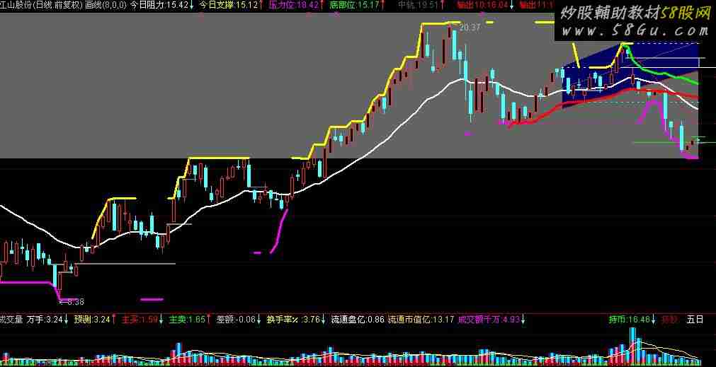 换手率%:VOL/CAPITAL*100,POINTDOT,COLORYELLOW,NODRAW; 流通盘亿:CAPITAL/1000000,POINTDOT,NODRAW; 流通市值亿:(CAPITAL/100*C)/10000,POINTDOT,COLOR33CCFF,NODRAW; 成交额千万:AMOUNT/10000000,POINTDOT,NODRAW; STICKLINE(CLOSE=REF(CLOSE,1),0,VOL,3.5,0),COLORWHITE; STICKLINE(CLOSE>REF(CLOSE,1),0,VOL,3.5,0),COLORRED; STICKLINE(CLOSE<REF(CLOSE,1),0,VOL,3.5,0),COLORGREEN; STICKLINE(CURRBARSCOUNT=1 AND PERIOD=5,AA,1 , 3.5 , 0 ) , COLORYELLOW ; STICKLINE(CURRBARSCOUNT=1 AND PERIOD=5,AA,1 , 3.2 , 0 ) , COLOR0088FF ; STICKLINE(CURRBARSCOUNT=1 AND PERIOD=5,AA,1 , 2.7 , 0 ) , COLOR00AAFF ; STICKLINE(CURRBARSCOUNT=1 AND PERIOD=5,AA,1 , 2.1 , 0 ) , COLOR00CCFF ; STICKLINE(CURRBARSCOUNT=1 AND PERIOD=5,AA,1 , 1.5 , 0 ) , COLOR22FFFF ; STICKLINE(CURRBARSCOUNT=1 AND PERIOD=5,AA,1 , 0.9 , 0 ) , COLOR66FFFF ; STICKLINE(CURRBARSCOUNT=1 AND PERIOD=5,AA,1 , 0.3 , 0 ) , COLOR99FFFF ; STICKLINE(主动买>0,0,主动买,3.2,0),COLOR000033; STICKLINE(主动买>0,0,主动买,2.7,0),COLOR000066; STICKLINE(主动买>0,0,主动买,2.1,0),COLOR000099; STICKLINE(主动买>0,0,主动买,1.5,0),COLOR0000CC; STICKLINE(主动买>0,0,主动买,0.9,0),COLOR0000FF; STICKLINE(主动买>0,0,主动买,0.3,0),COLORCC66FF; STICKLINE(主动卖<0,VOL,主动买,3.2,0),COLOR990000; STICKLINE(主动卖<0,VOL,主动买,2.7,0),COLORCC0000; STICKLINE(主动卖<0,VOL,主动买,2.1,0),COLORFF4400; STICKLINE(主动卖<0,VOL,主动买,1.5,0),COLORFF8800; STICKLINE(主动卖<0,VOL,主动买,0.9,0),COLORFFCC00; STICKLINE(主动卖<0,VOL,主动买,0.3,0),COLORCYAN; 持币:IF(SAR(10,2,20)>=H,SAR(10,2,20),DRAWNULL),CIRCLEDOT,COLORGREEN; 持股:IF(SAR(10,2,20)<=L,SAR(10,2,20),DRAWNULL),CIRCLEDOT,COLOR000099; 五日: MA(V,5) COLORWHITE; 十日: MA(V,10) COLORYELLOW;