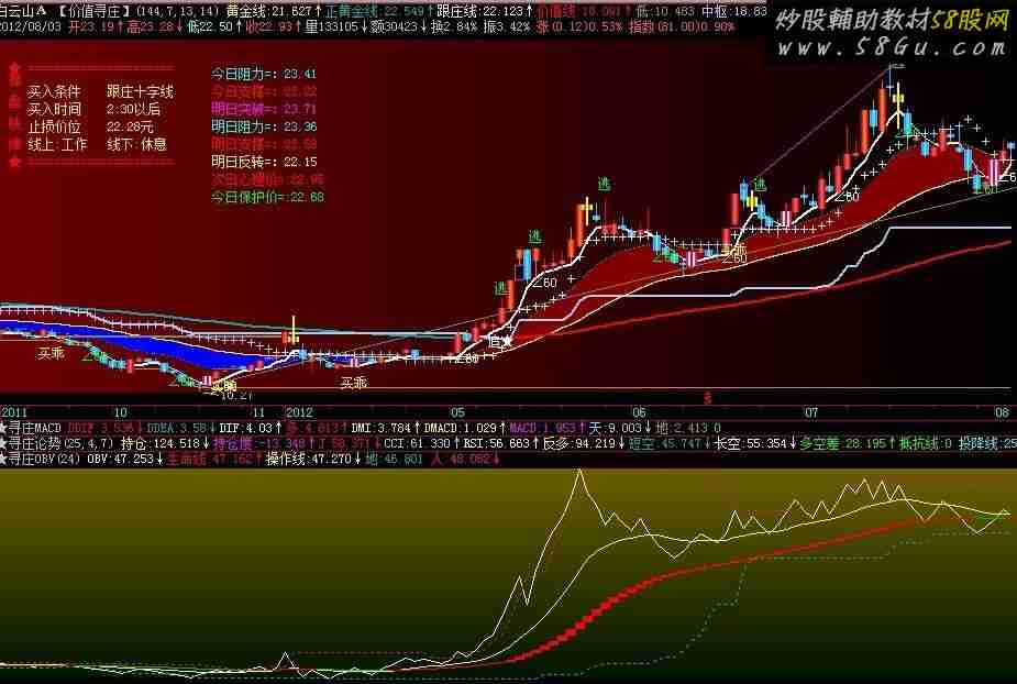 关注操作线,生命线下不操作,触地二到三次才能抄底。 N:=24;均价:=(2*C+(C+H+L+O)/4+O)/4;R:=(2*L+3*均价)/5;R1:=(2*H+3*均价)/5;OBV:SUM(IF(CLOSE>(R+R1)/2,VOL,IF(CLOSE<(R+R1)/2,-VOL,0)),0)/1000000,COLORWHITE;M3:=EMA(OBV,3);M5:=EMA(OBV,5);M8:=EMA(OBV,8);M13:=EMA(OBV,13);M21:=EMA(OBV,21);M34:=EMA(OBV,34);M55:=EMA(OBV,55);M89:=EMA(OBV,89);M144:=EMA(OBV,144);M233:=EMA(OBV,233);生命线:Ema((M3+M5+M8+M13+M21+M34+M55)/7,(3+5+8+13+21+34+55)/7),COLORRED,LINETHICK;操作线:EMA(生命线+(eMA(OBV,2)-生命线),14),COLORYELLOW;STICKLINE(生命线<REF(生命线,1),REF(生命线,1),生命线,10,0),COLOR00bb00;STICKLINE(生命线>=REF(生命线,1),REF(生命线,1),生命线,10,0),COLORRED;天:=REF(HHV(OBV,N),1),COLORGREEN;地:REF(LLV(OBV,N),1),COLORAAAA00;人:REF(HHV(OBV,n*2/3),1),COLOR7F00FF; |