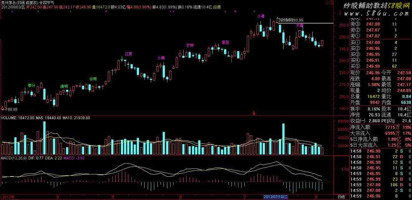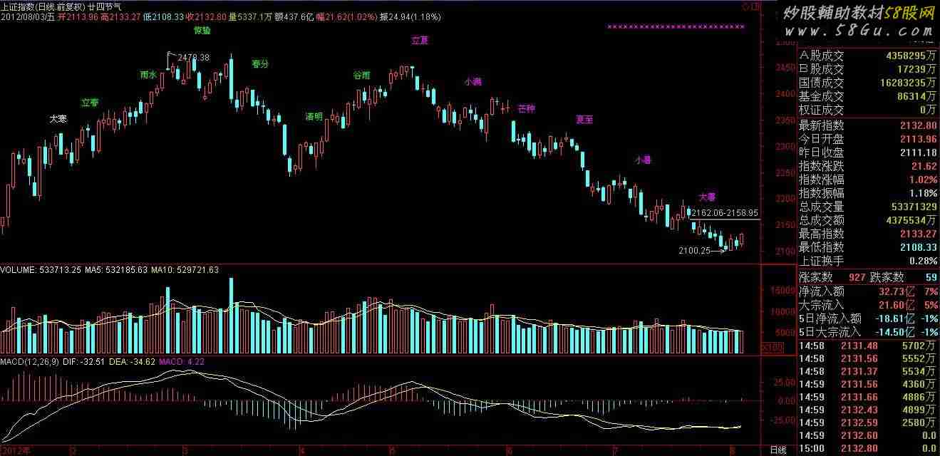 用法:廿四节气指标,来源码于网上,经过琪新简单编辑而成,用于观察大盘及个股随节气变化的规律,寻找可能的时间窗口,对个股的操作具有一定的参考意义,但由于个股主力的操盘手法不一,加之骗线等尔虞我诈行为,该指标有时可能反应不会灵敏,具体使用时还要参考其它指标综合判断为好。转载下段关于廿四节气指标的应用:二十四节气与江恩时间周期{廿四节气主图指标}立春:=FILTER(MONTH=2 AND (DAY=3 OR DAY=5 ),2);雨水:=FILTER(MONTH=2 AND (DAY=18 OR DAY=20),2);惊蛰:=FILTER(MONTH=3 AND (DAY=5 OR DAY=7 ),2);春分:=FILTER(MONTH=3 AND (DAY=20 OR DAY=22),2);清明:=FILTER(MONTH=4 AND (DAY=4 OR DAY=6 ),2);谷雨:=FILTER(MONTH=4 AND (DAY=19 OR DAY=21),2);立夏:=FILTER(MONTH=5 AND (DAY=6 OR DAY=8 ),2);小满:=FILTER(MONTH=5 AND (DAY=20 OR DAY=22),2);芒种:=FILTER(MONTH=6 AND (DAY=5 OR DAY=7 ),2);夏至:=FILTER(MONTH=6 AND (DAY=20 OR DAY=22),2);小暑:=FILTER(MONTH=7 AND (DAY=6 OR DAY=8 ),2);大署:=FILTER(MONTH=7 AND (DAY=22 OR DAY=24),2);立秋:=FILTER(MONTH=8 AND (DAY=7 OR DAY=9 ),2);处暑:=FILTER(MONTH=8 AND (DAY=22 OR DAY=24),2);白露:=FILTER(MONTH=9 AND (DAY=7 OR DAY=9 ),2);秋分:=FILTER(MONTH=9 AND (DAY=22 OR DAY=24),2);寒露:=FILTER(MONTH=10 AND (DAY=7 OR DAY=9 ),2);霜降:=FILTER(MONTH=10 AND (DAY=22 OR DAY=24),2);立冬:=FILTER(MONTH=11 AND (DAY=7 OR DAY=9 ),2);小雪:=FILTER(MONTH=11 AND (DAY=22 OR DAY=24),2);大雪:=FILTER(MONTH=12 AND (DAY=6 OR DAY=8 ),2);冬至:=FILTER(MONTH=12 AND (DAY=21 OR DAY=23),2);小寒:=FILTER(MONTH=1 AND (DAY=5 OR DAY=7 ),2);大寒:=FILTER(MONTH=1 AND (DAY=19 OR DAY=21),2);DRAWTEXT(立春=1,HIGH*1.02,'立春'),COLORGREEN;DRAWTEXT(雨水=1,HIGH*1.02,'雨水'),COLORGREEN;DRAWTEXT(惊蛰=1,HIGH*1.02,'惊蛰'),COLORGREEN;DRAWTEXT(春分=1,HIGH*1.02,'春分'),COLORGREEN;DRAWTEXT(清明=1,HIGH*1.02,'清明'),COLORGREEN;DRAWTEXT(谷雨=1,HIGH*1.02,'谷雨'),COLORGREEN;DRAWTEXT(立夏=1,HIGH*1.02,'立夏'),COLORMAGENTA;DRAWTEXT(小满=1,HIGH*1.02,'小满'),COLORMAGENTA;DRAWTEXT(芒种=1,HIGH*1.02,'芒种'),COLORMAGENTA;DRAWTEXT(夏至=1,HIGH*1.02,'夏至'),COLORMAGENTA;DRAWTEXT(小暑=1,HIGH*1.02,'小暑'),COLORMAGENTA;DRAWTEXT(大署=1,HIGH*1.02,'大署'),COLORMAGENTA;DRAWTEXT(立秋=1,HIGH*1.02,'立秋'),COLORYELLOW;DRAWTEXT(处暑=1,HIGH*1.02,'处暑'),COLORYELLOW;DRAWTEXT(白露=1,HIGH*1.02,'白露'),COLORYELLOW;DRAWTEXT(秋分=1,HIGH*1.02,'秋分'),COLORYELLOW;DRAWTEXT(寒露=1,HIGH*1.02,'寒露'),COLORYELLOW;DRAWTEXT(霜降=1,HIGH*1.02,'霜降'),COLORYELLOW;DRAWTEXT(立冬=1,HIGH*1.02,'立冬'),COLORWHITE;DRAWTEXT(小雪=1,HIGH*1.02,'小雪'),COLORWHITE;DRAWTEXT(大雪=1,HIGH*1.02,'大雪'),COLORWHITE;DRAWTEXT(冬至=1,HIGH*1.02,'冬至'),COLORWHITE;DRAWTEXT(小寒=1,HIGH*1.02,'小寒'),COLORWHITE;DRAWTEXT(大寒=1,HIGH*1.02,'大寒'),COLORWHITE; 经过实践总结,我们发现,中国农历的二十四节气对应的时间,行情往往也会出现一些波动和转折,尤其是春分、夏至、秋分、冬至前后变盘的机会比较大。比如,国内股市的高点基本上发生在第二季度,其中又以6月中下旬见高点的机会比较多,这刚好与夏至的时间比较接近。再比如,1996年1月19日的历史低点512点,正好对应农历的大寒;1997年5月高点1510点,对应农历的立夏;1998年8月18日最低1043点,接近立秋;2003年11月低点1307点,接近立冬,2008年11月低点1664点,接近立冬,也正是立冬那天开始拉起,等等等等不一而足。 投资大师江恩对于市场的循环周期也有深入的研究,他认为,一年的循环是地球围绕太阳运行一周的时间,将地球的轨迹按比例分割,选取一年的春分作为分割的起点,因为春分是太阳回归的时间,日、夜时间均等。分割的比例主要依据神奇数字,比如一分为二、为三、为八等,另外加入了一分为四,时间上与中国的二十四节气基本相对应。其中四等分就是春分、夏至、秋分、冬至,八等分是在四等分的基础上加入立春、立夏、立秋和立冬。江恩利用这个循环周期理论对美国外汇市场的走势进行分析,基本吻合,行情往往在各节气附近出现转折。 前面我们对于中国股市的转折也曾进行过简单分析,确实存在转折机会。2004年的八等分点依次是:立春2004-2-4、春分2004-3-20、立夏2004-5-5、夏至2004-6-21、立秋2004-8-7、秋分2004-9-23、立冬2004-11-7、冬至2004-12-21,上述节气通常会对应一定的转折机会,可留心关注。  |