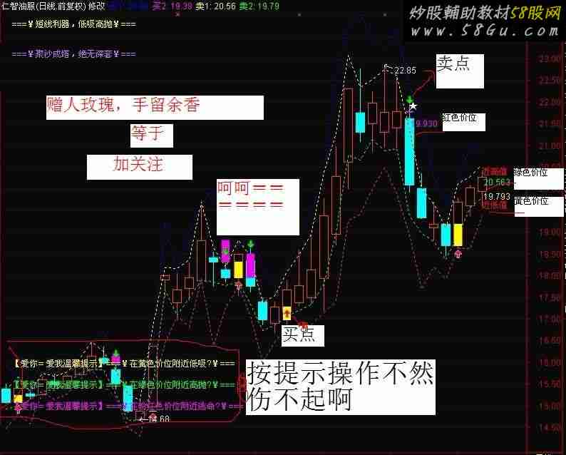 今天在软件区看到一大智慧主图公式甚感新颖,随蒙发出修改滴想法,现付诸行动修改为通达信滴主图,以造福广大通达信用户,指标滴实战性偶木有检验,但融入了偶滴实战性较强滴买卖点,据此操作 钞票大大滴有,如果你受益咧,别忘记回报偶哦==={加关注}而已,举手之劳,何以为报哈!!!PT:=REF(HIGH,1)-REF(LOW,1);CDP:=(HIGH + LOW + CLOSE)/3;买1:CDP+PT,COLORBLUE,DOTLINE;买2:CDP-PT,COLORFF00FF,DOTLINE;卖1:2*CDP-LOW,COLORYELLOW,DOTLINE;卖2:2*CDP-HIGH,DOTLINE;近高值:=IF(买1>卖1,卖1,买1);近低值:=IF(买2<卖2,卖2,买2);DRAWTEXT(ISLASTBAR,H,'近高值'),COLORRED ;DRAWNUMBER(ISLASTBAR,C,近高值),COLORGREEN; DRAWTEXT(ISLASTBAR,L,'近低值'),COLORRED ;DRAWNUMBER(ISLASTBAR,O,近低值),COLORYELLOW; AA:=(C-REF(C,1))/REF(C,1)*100;DRAWTEXT(AA<-5,H,'★'),COLORWHITE;DRAWNUMBER(AA<-5,O,L)COLORFF00FF; VAR1:=CLOSE>REF(CLOSE,1) AND CLOSE>REF(CLOSE,2);VAR2:=REF(VAR1,1) AND CLOSE<=REF(CLOSE,1) AND CLOSE>=REF(CLOSE,2);VAR3:=REF(VAR2,1) AND CLOSE>=REF(CLOSE,1) AND CLOSE<=REF(CLOSE,2);VAR4:=REF(VAR3,1) AND CLOSE<=REF(CLOSE,1) AND CLOSE>=REF(CLOSE,2);VAR5:=REF(VAR4,1) AND CLOSE>=REF(CLOSE,1) AND CLOSE<=REF(CLOSE,2);VAR6:=REF(VAR5,1) AND CLOSE<=REF(CLOSE,1) AND CLOSE>=REF(CLOSE,2);VAR7:=REF(VAR6,1) AND CLOSE>=REF(CLOSE,1) AND CLOSE<=REF(CLOSE,2);VAR8:=REF(VAR7,1) AND CLOSE<=REF(CLOSE,1) AND CLOSE>=REF(CLOSE,2);VAR9:=REF(VAR8,1) AND CLOSE>=REF(CLOSE,1) AND CLOSE<=REF(CLOSE,2);VARA:=REF(VAR9,1) AND CLOSE<=REF(CLOSE,1) AND CLOSE>=REF(CLOSE,2);VARB:=REF(VARA,1) AND CLOSE>=REF(CLOSE,1) AND CLOSE<=REF(CLOSE,2);VARC:=REF(VARB,1) AND CLOSE<=REF(CLOSE,1) AND CLOSE>=REF(CLOSE,2);VARD:=CLOSE<REF(CLOSE,1) AND CLOSE<REF(CLOSE,2);VARE:=REF(VARD,1) AND CLOSE>=REF(CLOSE,1) AND CLOSE<=REF(CLOSE,2);VARF:=REF(VARE,1) AND CLOSE<=REF(CLOSE,1) AND CLOSE>=REF(CLOSE,2);VAR10:=REF(VARF,1) AND CLOSE>=REF(CLOSE,1) AND CLOSE<=REF(CLOSE,2);VAR11:=REF(VAR10,1) AND CLOSE<=REF(CLOSE,1) AND CLOSE>=REF(CLOSE,2);VAR12:=REF(VAR11,1) AND CLOSE>=REF(CLOSE,1) AND CLOSE<=REF(CLOSE,2);VAR13:=REF(VAR12,1) AND CLOSE<=REF(CLOSE,1) AND CLOSE>=REF(CLOSE,2);VAR14:=REF(VAR13,1) AND CLOSE>=REF(CLOSE,1) AND CLOSE<=REF(CLOSE,2);VAR15:=REF(VAR14,1) AND CLOSE<=REF(CLOSE,1) AND CLOSE>=REF(CLOSE,2);VAR16:=REF(VAR15,1) AND CLOSE>=REF(CLOSE,1) AND CLOSE<=REF(CLOSE,2);VAR17:=REF(VAR16,1) AND CLOSE<=REF(CLOSE,1) AND CLOSE>=REF(CLOSE,2);VAR18:=REF(VAR17,1) AND CLOSE>=REF(CLOSE,1) AND CLOSE<=REF(CLOSE,2);VAR19:=REF(VARD OR VARE OR VARF OR VAR10 OR VAR11 OR VAR12 OR VAR13 ORVAR14 OR VAR15 OR VAR16 OR VAR17 OR VAR18,1) AND VAR1;VAR1A:=REF(VAR1 OR VAR2 OR VAR3 OR VAR4 OR VAR5 OR VAR6 OR VAR7 ORVAR8 OR VAR9 OR VARA OR VARB OR VARC,1) AND VARD;STICKLINE(VAR19,REF(CLOSE,1),REF(CLOSE,2),2,0),COLOR00FFFF;{黄色}STICKLINE(VAR1A,REF(CLOSE,1),REF(CLOSE,2),2,0),COLORFF00FF;{粉红色}DRAWICON(VAR19,REF(CLOSE,1)*0.99,1);DRAWICON(VAR1A,REF(CLOSE,1)*1.01,2);DRAWTEXT_FIX(CURRBARSCOUNT=1,0.02,0.01,0,'===¥短线利器,低吸高抛¥==='),COLORYELLOW;DRAWTEXT_FIX(CURRBARSCOUNT=1,0.02,0.08,0,'===¥聚沙成塔,绝无深套¥==='),COLORFF6EC7;DRAWTEXT_FIX(CURRBARSCOUNT=1,0.02,0.8,0,'【爱你=爱我温馨提示】===¥在黄色价位附近低吸?¥==='),COLORYELLOW;DRAWTEXT_FIX(CURRBARSCOUNT=1,0.02,0.85,0,'【爱你=爱我温馨提示】===¥在绿色价位附近高抛?¥==='),COLORGREEN;DRAWTEXT_FIX(CURRBARSCOUNT=1,0.02,0.9,0,'【爱你=爱我温馨提示】===¥在粉红色价位附近逃命?¥==='),COLORFF00FF; |