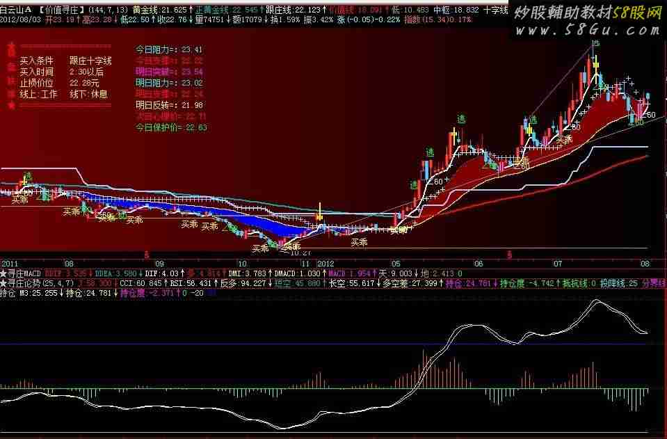 重点关注红柱,上穿-20,0轴和20均价:=(2*C+(C+H+L+O)/4+O)/4;R:=(2*L+3*均价)/5;R1:=(2*H+3*均价)/5;M3:=EMA((R+r1)/2,3);M5:=EMA((R+r1)/2,5);M8:=EMA((R+r1)/2,8),COLORWHITE;M13:=EMA((R+r1)/2,13);M21:=EMA((R+r1)/2,21),COLORYELLOW;M34:=EMA((R+r1)/2,34);M55:=EMA((R+r1)/2,55);M89:=EMA((R+r1)/2,89);M144:=EMA((R+r1)/2,144);M233:=EMA((R+r1)/2,233);M377:=EMA((R+r1)/2,377);黄金线:=Ema((M3+M5+M8+M13+M21+M34+M55)/7,(3+5+8+13+21+34+55)/7),COLORYELLOW,LINETHICK2;价值线:=Ema((M3+M5+M8+M13+M21+M34+M55+M89+M144+M233)/10,(3+5+8+13+21+34+55+89+144+233)/10),COLOR7F00FF;正黄金线:=EMA(黄金线+(eMA((R+r1)/2,2)-黄金线),13),COLORAAAA00;FSS:=2*正黄金线-ref(正黄金线,1);持仓:(FSS-价值线)/价值线*100;m3:EMA(持仓,3);持仓度:5*(持仓-M3),COLORSTICK;0;-20;20; |