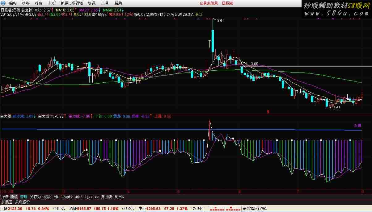 筹峰:=((COST(85)+COST(15))/2+COST(50))/2,COLOR9900FF; 成本线:MA(筹峰*0.80,10),COLORFF6600,LINETHICK2; 主力成本:(C-成本线)/成本线*100,LINETHICK1,COLORFFFFFF; 主力线:MA(主力成本,5),COLORFF00FF; 下跌:IF(主力成本<REF(主力成本,1) AND 主力成本<主力线 AND ((主力线<REF(主力线,1) AND MA (C,5)<REF(MA(C,5),1)) OR MA(C,20)<REF(MA(C,20),1)) AND C<=REF(C,1),主力成本,0), COLOR00AA00,LINETHICK2,STICK; 震荡:IF((主力成本<REF(主力成本,1) AND 主力线>REF(主力线,1)) OR (主力成本>REF(主力成本,1) AND 主力线<REF(主力线,1)) OR (主力成本<REF(主力成本,1) AND 主力线<REF(主力线,1) AND (主力成本>主力线 OR MA(C,5)>REF(MA(C,5),1))) OR (主力线>REF(主力线,1) AND 主力成本>REF(主力成本,1) AND 主力成本<主力线),主力成本,0),COLORFF9900, LINETHICK2,STICK; 反弹:IF(主力线>REF(主力线,1) AND MA(C,20)<REF(MA(C,20),1) AND (主力成本>主力线 OR 主力成本>REF(主力成本,1)),主力成本,0),COLORFF00AA,LINETHICK2,STICK; 上涨:IF(主力成本>主力线 AND 主力成本>REF(主力成本,1) AND 主力线>REF(主力线,1) AND MA (C,20)>REF(MA(C,20),1),主力成本,0),COLOR0000FF,LINETHICK2,STICK; DRAWTEXT_FIX(ISLASTBAR AND 下跌=主力成本,0.97,0.05,1,'下跌'),COLORFFFFFF; DRAWTEXT_FIX(ISLASTBAR AND 震荡=主力成本 AND REF(下跌,1)=REF(主力成本,1),0.97,0.05,1, '下跌中震荡'),COLORFFFF00; DRAWTEXT_FIX(ISLASTBAR AND 震荡=主力成本 AND REF(上涨,1)=REF(主力成本,1),0.97,0.05,1, '上涨中震荡'),COLORFFFF00; DRAWTEXT_FIX(ISLASTBAR AND 震荡=主力成本 AND REF(震荡,1)=REF(主力成本,1),0.97,0.05,1, '震荡'),COLORFFFF00; DRAWTEXT_FIX(ISLASTBAR AND 反弹=主力成本 AND 震荡!=主力成本,0.97,0.05,1,'反弹'), COLORFF00CC; DRAWTEXT_FIX(ISLASTBAR AND 上涨=主力成本,0.97,0.05,1,'上涨'),COLOR00FFFF;