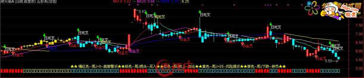 ZJ:=MA("KDJ.J#WEEK"(9,3,3) ,5); AAA:=ZJ<0 AND ZJ<REF(ZJ,1); BB:=ZJ<0 AND ZJ>=REF(ZJ,1); DD:=ZJ>=0 AND ZJ>=REF(ZJ,1); EE:= ZJ>85; FF:=ZJ<REF(ZJ,1) AND ZJ>0; STICKLINE(AAA,C,O,3,0),COLOR2737FF; STICKLINE(AAA,H,L,0,0),COLOR2737FF; STICKLINE(AAA,C,O,1.9,0),COLOR226CFF; STICKLINE(AAA,C,O,1.0,0),COLOR3EA6FF; STICKLINE(AAA,C,O,0.2,0),COLOR17FFF6; STICKLINE(BB,C,O,3,0),COLOR990099; STICKLINE(BB,H,L,0,0),COLORFF00FF; STICKLINE(BB,C,O,1.9,0),COLORBB00CC; STICKLINE(BB,C,O,1.0,0),COLORDD00DD; STICKLINE(BB,C,O,0.2,0),COLORFF88FF; STICKLINE(DD,C,O,3,0),COLOR000099; STICKLINE(DD,H,L,0,0),COLOR0000FF; STICKLINE(DD,C,O,1.9,0),COLOR0000CC; STICKLINE(DD,C,O,1.0,0),COLOR0000DD; STICKLINE(DD,C,O,0.2,0),COLOR7788FF; STICKLINE(EE,C,O,3,0),COLOR00AAAA; STICKLINE(EE,H,L,0,0),COLOR00FFFF; STICKLINE(EE,C,O,1.9,0),COLOR00CCCC; STICKLINE(EE,C,O,1.0,0),COLOR00DDDD; STICKLINE(EE,C,O,0.2,0),COLOR00FFFF; STICKLINE(FF,C,O,3,0),COLOR888800; STICKLINE(FF,H,L,0,0),COLORFFFF00; STICKLINE(FF,C,O,1.9,0),COLORCCCC00; STICKLINE(FF,C,O,1.0,0),COLORDDDD00; STICKLINE(FF,C,O,0.2,0),COLORFFFF00; YK:=MA("KDJ.K#MONTH"(9,3,3),20),LINETHICK0; YD:=MA("KDJ.D#MONTH"(9,3,3),20),LINETHICK0; YJ:=MA("KDJ.J#MONTH"(9,3,3),20); ZK:=MA("KDJ.K#WEEK"(9,3,3) ,5),LINETHICK0; ZD:=MA("KDJ.D#WEEK"(9,3,3) ,5),LINETHICK0; RSV:=(CLOSE-LLV(LOW,9))/(HHV(HIGH,9)-LLV(LOW,9))*100; K:=SMA(RSV,3,1),LINETHICK0; D:=SMA(K,3,1),LINETHICK0; J:=3*K-2*D,LINETHICK0; RJC:DRAWICON(CROSS(K,D),L*0.98,1); DRAWTEXT(RJC,L*0.98,'日金叉'),COLOR0000FF; RSC:DRAWICON(CROSS(D,K),H*1.03,2),; DRAWTEXT(RSC,H*1.03,'日死叉'),COLORFFFFFF; ZJC: DRAWICON (CROSS(ZK,ZD), L*0.98,1); DRAWTEXT(ZJC,L*0.98,'周金叉'),COLORFF00FF; ZSC: DRAWICON (CROSS(ZD,ZK), H*1.03,2),; DRAWTEXT(ZSC,H*1.03,'周死叉'),COLOR00FFFF; YJC: DRAWICON (CROSS(YK,YD), L*0.98,1); DRAWTEXT(YJC,L*0.98,'月金叉'),COLORFF0000; YSC: DRAWICON (CROSS(YD,YK), H*1.03,2); DRAWTEXT(YSC,H*1.03,'月死叉'),COLORADEAEA; MA10:MA(C,10),COLORRED,LINETHICK1; IF(MA10<REF(MA10,1),MA10,DRAWNULL),COLORFFFF00,LINETHICK1; MA20:MA(C,20),COLORFF00FF,LINETHICK1; IF(MA20<REF(MA20,1),MA20,DRAWNULL),COLORFFFFFF,LINETHICK1; MA55:MA(C,55),COLORFF0000,LINETHICK1; IF(MA55<REF(MA55,1),MA55,DRAWNULL),COLOR00FFFF,LINETHICK1; TT:=IF(ISLASTBAR,240/FROMOPEN,1); NN:=120; HH:=HHV(V*TT,NN); LL:=LLV(V,NN); 最高:=CONST(HH); 最低:=CONST(LL); 最高2:=CONST(HHV(H,NN)); 最低2:=CONST(LLV(L,NN)); PP:=IF((最高2*0.9-(最高2-最低2)*0.5)>CONST(LLV(L,20)),0.9,IF((最高2*0.9-(最高2-最低2)*0.5)>CONST(LLV(L,50)),0.7,0.6)),NODRAW; RCC1:=最高2*0.9-(最高2-最低2)*PP; 最低3:=MIN(RCC1,最低2); AA:=最低3; STICKLINE(AAA,AA-0.000*AA,AA-0.040*AA,2.5,0),COLOR3EA6FF; STICKLINE(BB,AA-0.000*AA,AA-0.040*AA,2.5,0),COLORFF00FF; STICKLINE(DD,AA-0.000*AA,AA-0.040*AA,2.5,0),COLOR0000FF; STICKLINE(EE,AA-0.000*AA,AA-0.040*AA,2.5,1),COLOR00FFFF; STICKLINE(FF,AA-0.000*AA,AA-0.040*AA,2.5,1),COLORFFFF00; DRAWTEXT_FIX(1,0.2,0.86,0,'★★ 橘红色--周J<0--底部警示★★粉色--周J拐头--买入★★红色--周J向上--加仓★★黄色--周J>85--风险提示★★青色--周J下跌--持币★★'),COLOR00FFFF; |