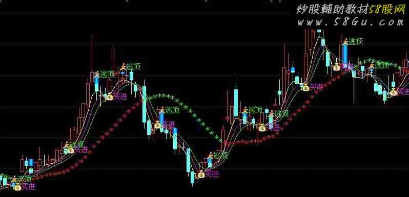 O1:(SUM(EMA((CLOSE+LOW)/2,1)/3,3)),COLOR00FFFF,LINETHICK1;O2:EMA(O1,3),COLORFF00FF,LINETHICK1;O3:EMA(O2,3),COLOR00FF00,LINETHICK1;MMM:=MA(CLOSE,20);DRAWTEXT((CLOSE<MMM),MMM,'*'),COLOR00FF00,LINETHICK5;DRAWTEXT((CLOSE>MMM),MMM,'*'),COLOR0000FF,LINETHICK5;VAR1:=CLOSE>REF(CLOSE,1) AND CLOSE>REF(CLOSE,2);VAR2:=REF(VAR1,1) AND CLOSE<=REF(CLOSE,1) AND CLOSE>=REF(CLOSE,2);VAR3:=REF(VAR2,1) AND CLOSE>=REF(CLOSE,1) AND CLOSE<=REF(CLOSE,2);VAR4:=REF(VAR3,1) AND CLOSE<=REF(CLOSE,1) AND CLOSE>=REF(CLOSE,2);VAR5:=REF(VAR4,1) AND CLOSE>=REF(CLOSE,1) AND CLOSE<=REF(CLOSE,2);VAR6:=REF(VAR5,1) AND CLOSE<=REF(CLOSE,1) AND CLOSE>=REF(CLOSE,2);VAR7:=REF(VAR6,1) AND CLOSE>=REF(CLOSE,1) AND CLOSE<=REF(CLOSE,2);VAR8:=REF(VAR7,1) AND CLOSE<=REF(CLOSE,1) AND CLOSE>=REF(CLOSE,2);VAR9:=REF(VAR8,1) AND CLOSE>=REF(CLOSE,1) AND CLOSE<=REF(CLOSE,2);VARA:=REF(VAR9,1) AND CLOSE<=REF(CLOSE,1) AND CLOSE>=REF(CLOSE,2);VARB:=REF(VARA,1) AND CLOSE>=REF(CLOSE,1) AND CLOSE<=REF(CLOSE,2);VARC:=REF(VARB,1) AND CLOSE<=REF(CLOSE,1) AND CLOSE>=REF(CLOSE,2);VARD:=CLOSE<REF(CLOSE,1) AND CLOSE<REF(CLOSE,2);VARE:=REF(VARD,1) AND CLOSE>=REF(CLOSE,1) AND CLOSE<=REF(CLOSE,2);VARF:=REF(VARE,1) AND CLOSE<=REF(CLOSE,1) AND CLOSE>=REF(CLOSE,2);VAR10:=REF(VARF,1) AND CLOSE>=REF(CLOSE,1) AND CLOSE<=REF(CLOSE,2);VAR11:=REF(VAR10,1) AND CLOSE<=REF(CLOSE,1) AND CLOSE>=REF(CLOSE,2);VAR12:=REF(VAR11,1) AND CLOSE>=REF(CLOSE,1) AND CLOSE<=REF(CLOSE,2);VAR13:=REF(VAR12,1) AND CLOSE<=REF(CLOSE,1) AND CLOSE>=REF(CLOSE,2);VAR14:=REF(VAR13,1) AND CLOSE>=REF(CLOSE,1) AND CLOSE<=REF(CLOSE,2);VAR15:=REF(VAR14,1) AND CLOSE<=REF(CLOSE,1) AND CLOSE>=REF(CLOSE,2);VAR16:=REF(VAR15,1) AND CLOSE>=REF(CLOSE,1) AND CLOSE<=REF(CLOSE,2);VAR17:=REF(VAR16,1) AND CLOSE<=REF(CLOSE,1) AND CLOSE>=REF(CLOSE,2);VAR18:=REF(VAR17,1) AND CLOSE>=REF(CLOSE,1) AND CLOSE<=REF(CLOSE,2);VAR19:=REF(VARD OR VARE OR VARF OR VAR10 OR VAR11 OR VAR12 OR VAR13 ORVAR14 OR VAR15 OR VAR16 OR VAR17 OR VAR18,1) AND VAR1;VAR1A:=REF(VAR1 OR VAR2 OR VAR3 OR VAR4 OR VAR5 OR VAR6 OR VAR7 ORVAR8 OR VAR9 OR VARA OR VARB OR VARC,1) AND VARD;STICKLINE(VAR1A,REF(CLOSE,1),REF(CLOSE,2),3.2,0),COLORFF3300;STICKLINE(VAR1A,REF(CLOSE,1),REF(CLOSE,2),2.7,0),COLORFF5500;STICKLINE(VAR1A,REF(CLOSE,1),REF(CLOSE,2),2.1,0),COLORFF7700;STICKLINE(VAR1A,REF(CLOSE,1),REF(CLOSE,2),1.5,0),COLORFF9900;STICKLINE(VAR1A,REF(CLOSE,1),REF(CLOSE,2),0.9,0),COLORFFBB00;STICKLINE(VAR1A,REF(CLOSE,1),REF(CLOSE,2),0.3,0),COLORFFDD00;DRAWTEXT(FILTER(VAR19=1,5),LOW,' 买进'),COLORFF00FF;DRAWICON(FILTER(VAR19=1,5),LOW,9);DRAWTEXT(FILTER(VAR1A=1,5),HIGH,' 逃顶'),COLOR00FF00;DRAWICON(FILTER(VAR1A=1,5),HIGH,15);  |