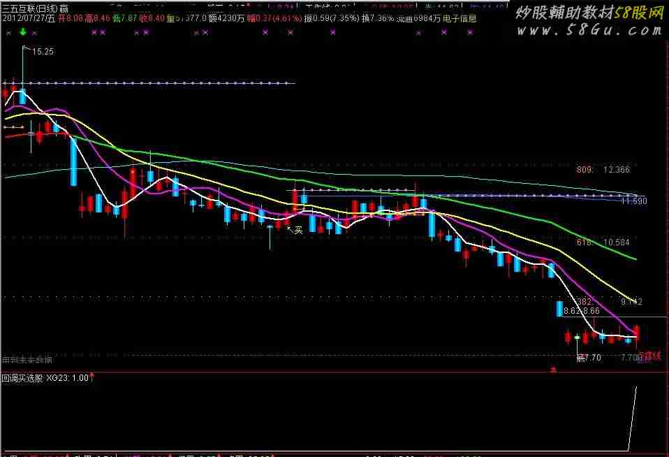 操作说明:回调买选股顾名思义就是:当信号出现后先不要急于买入,等待股价回调后结合基本面和消息面再跟踪买入必有收获。虽然有失败案例,但是失败的时候非常少,基本上信号出现后再经过回调以接近“阶段性”底部,风险不大,一个好的选股公式要经得起时间和成功率的考验。大盘现在不好,放出此选股公式希望能给坛友们带来盈利。此选股公式信号不多,坛友们结合其它选股公式组成综合选股公式进行选股。涨幅%:=(C-REF(C,1))/REF(C,1)*100,LINETHICK0; RSV5:=(CLOSE-LLV(LOW,15))/(HHV(HIGH,15)-LLV(LOW,15))*100; VAR7:=SMA(RSV5,3,1); VAR8:=SMA(VAR7,3,1); BUY1:=COUNT(VAR7<16 AND VAR8<21,3)=1 ; XG23:BUY1 AND COUNT(BUY1,15)=1 AND 涨幅%>3.7;