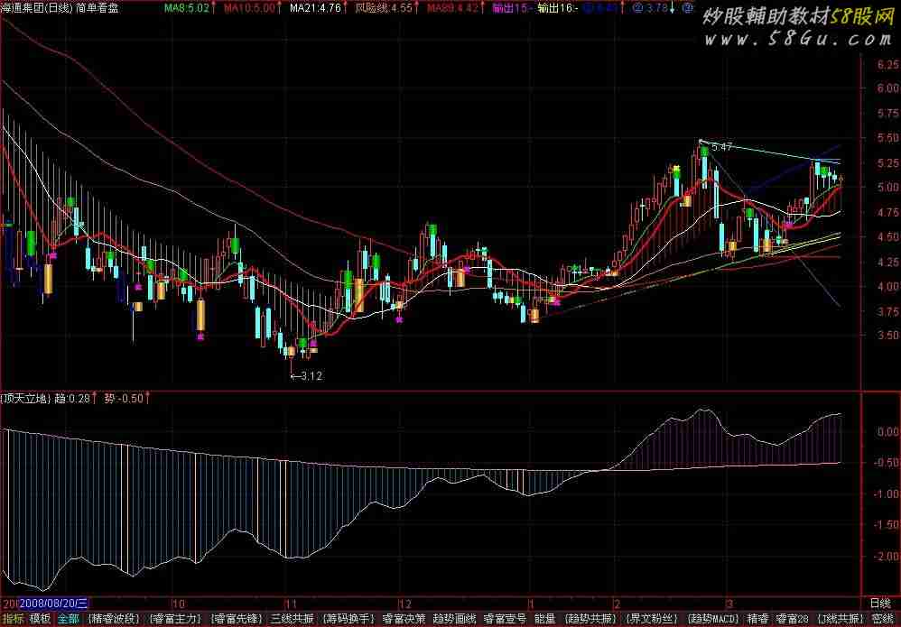 MA8:IF(EMA(C,8) >=MA(C,10),EMA(C,8),DRAWNULL)COLORGREEN; MA10:IF(MA(C,10)>=MA(C,14),MA(C,10),MA(C,14))COLORRED, LINETHICK2; MA21:MA(C,21),COLORWHITE; 风险线:MA(C,60)COLOR067EEC; MA89:MA(C,89),COLORRED; 买线:=EMA(CLOSE,2); 卖线:=EMA(SLOPE(CLOSE,21)*20+CLOSE,42); IF(CROSS(买线,卖线),L-0.02,DRAWNULL),CROSSDOT,LINETHICK3,COLORMAGENTA; IF(CROSS(80,RSI)*30,H+0.02,DRAWNULL),CROSSDOT,LINETHICK3,COLORYELLOW; {趋势画线} M:=5; A1:=BACKSET(ISLASTBAR,PEAKBARS(1,M,1)+1); A2:=A1>REF(A1,1); B1:=BACKSET(ISLASTBAR,PEAKBARS(1,M,2)+1); B2:=B1>REF(B1,1); C1:=BACKSET(ISLASTBAR,PEAKBARS(1,M,3)+1); C2:=C1>REF(C1,1); A11:=BACKSET(ISLASTBAR,TROUGHBARS(2,M,1)+1); A21:=A11>REF(A11,1); B11:=BACKSET(ISLASTBAR,TROUGHBARS(2,M,2)+1); B21:=B11>REF(B11,1); C11:=BACKSET(ISLASTBAR,TROUGHBARS(2,M,3)+1); C21:=C11>REF(C11,1); ①:DRAWLINE(B2,H,A2,H,1),COLORBLUE; ②:DRAWLINE(C2,H,B2,H,1),COLORCC6633; ③:IF(A1,PEAK(1,M,1),DRAWNULL),COLORFFAA00; ④:DRAWLINE(C2,H,A2,H,1),COLORLIBLUE; ⑤:DRAWLINE(B21,L,A21,L,1),COLORYELLOW; ⑥:DRAWLINE(C21,L,B21,L,1),COLOR00FF00; ⑦:DRAWLINE(C21,L,A21,L,1),COLORBROWN; ⑧:IF(A11,TROUGH(2,M,1),DRAWNULL),COLORRED; |