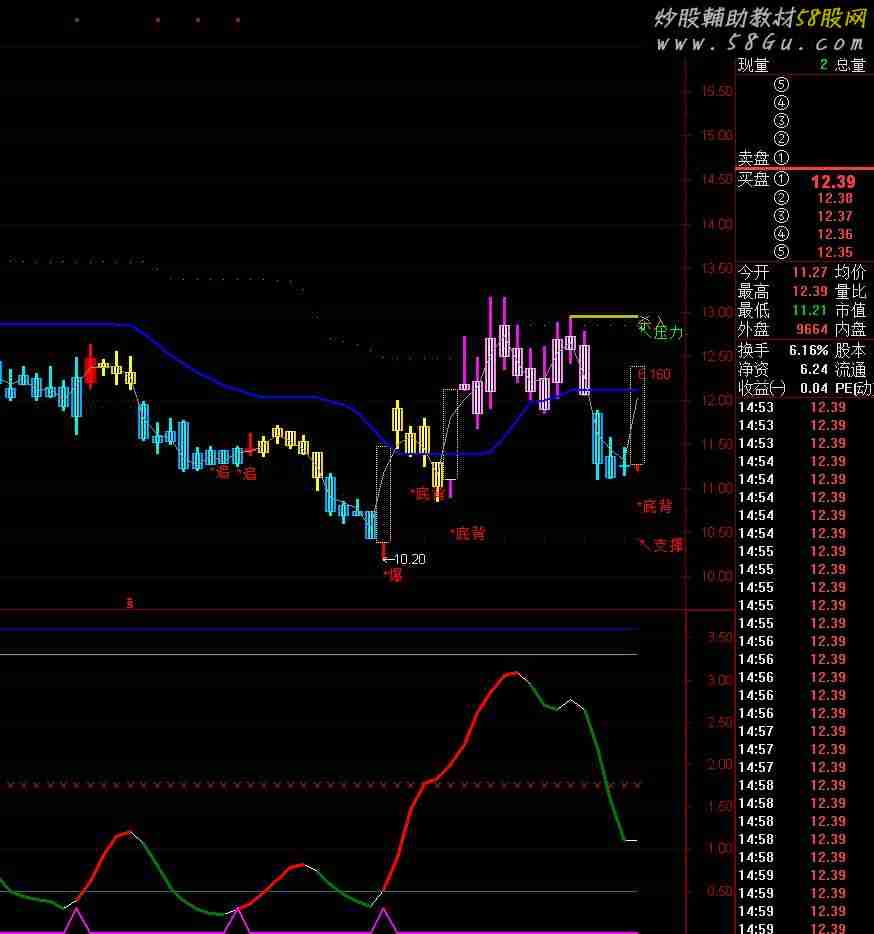 VAR2:=LLV(LOW,10); VAR3:=HHV(HIGH,25); 趋势:= EMA((CLOSE-VAR2)/(VAR3-VAR2)*4,4); 波段:MA(趋势,3); 预警: 3.3,COLORLIGREEN; 撤离: 3.6,COLORBLUE; 关注:0.5,COLORLICYAN; 强弱线:1.75,COLORRED,CROSSDOT; IF(波段>REF(波段,1),波段,DRAWNULL),LINETHICK3,COLORRED; IF(波段<REF(波段,1),波段,DRAWNULL),LINETHICK3,COLOR007700; 准备:IF((波段>REF(波段,1)) AND (REF(波段,1)<REF(波段,2)) AND (波段<1),0.3,0),LINETHICK2,COLORMAGENTA;