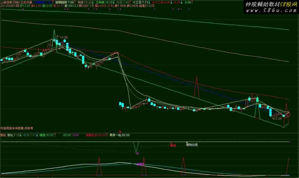 VAR3:=EMA(100*(CLOSE-LLV(LOW,100))/(HHV(HIGH,100)-LLV(LOW,100)),18)/4;VAR4:=IF(DATE<1091231,IF(VAR3>23.16,VAR3,0),0);VAR5:=VAR3<10;VAR6:=VAR3<2;VAR7:=VAR5 OR VAR6;长期趋势: ZIG(3,19), , COLORBLUE;短期趋势: ZIG(3,6.5), , COLORYELLOW;年线: EMA(CLOSE,250), , COLOR0099FF;三年线: EMA(CLOSE,725), , COLORGREEN;九日: EMA(CLOSE,9), , COLOR009090;十三日: EMA(CLOSE,13), , COLORB0FFFF;七十二日: EMA(CLOSE,72), , COLORRED;IF(CROSS(ZIG(3,13),REF(ZIG(3,13),1)),长期趋势+1,长期趋势-1), COLORRED;IF(CROSS(REF(ZIG(3,13),1),ZIG(3,13)),长期趋势+1,长期趋势-1), COLORGREEN;  |