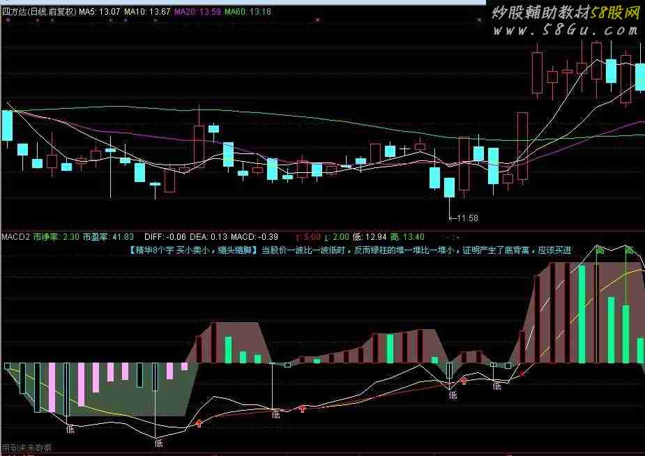 SJV:=FINANCE(34);{每股净资产}市净率:C/SJV,NODRAW,COLOR00FF00;每股税后利润:=(FINANCE(1)/FINANCE(29));市盈率:C/FINANCE(33),NODRAW,COLORFFFF00;DIF:=EMA(CLOSE,10)-EMA(CLOSE,22);DE:=EMA(DIF,7.5);MACDA:=2*(DIF-DE),;HZL:=CROSS(MACDA,0);LZH:=CROSS(0,MACDA);BC:=BARSLAST(HZL OR LZH)+1;ZGHZ:=IF(MACDA>0,HHV(MACDA,BC),0);ZGLZ:=IF(MACDA<0,LLV(MACDA,BC),0);DRAWBAND(ZGHZ,RGB(105,77,77),0,RGB(77,77,77));DRAWBAND(ZGLZ,RGB(80,0,0),0,RGB(66,88,66));DIFF:EMA(CLOSE,10)-EMA(CLOSE,22),COLORFFFFFF;DEA:EMA(DIFF,7.5),COLOR00FFFF;MACD:2*(DIFF-DEA), COLORSTICK,LINETHICK0;STICKLINE(MACD>0 AND MACD>REF(MACD,1),0,MACD,1.5,1),COLORRED;STICKLINE(MACD>0 AND MACD<REF(MACD,1),0,MACD,1.5,0),COLOR90FF00;STICKLINE(MACD<0 AND MACD<REF(MACD,1),0,MACD,1.5,1),COLOREFFF00;STICKLINE(MACD<0 AND MACD>REF(MACD,1),0,MACD,1.5,0),COLORFFAAFF;↑:TROUGHBARS(3,3,1),COLOR0000FF,NODRAW;↓:PEAKBARS(3,3,1),COLOR00FF00,NODRAW;低:IF(↑=0,DIFF,IF(↓<↑,TROUGH(3,3,1),REF(TROUGH(3,3,1),1))),COLOR00FFFF,NODRAW;高:IF(↓=0,DIFF,IF(↑<↓,PEAK(3,3,1),REF(PEAK(3,3,1),1))),COLOR00FF00,NODRAW;STICKLINE(↑=0 AND DIFF<0 AND DIFF<DEA,0,DIFF,0,0),COLORFFAAFF;STICKLINE(↓=0 AND DIFF>0 AND DIFF>DEA,DIFF,0,0,0),COLOR00FF00;DRAWTEXT(↑=0 AND DIFF<0 AND DIFF<DEA,DIFF,'低'),COLORFFAAFF;DRAWTEXT(↓=0 AND DIFF>0 AND DIFF>DEA,DIFF,'高'),COLOR00FF00;低位金叉:=CROSS(DIFF,DEA) AND DIFF<-0.1;JCCOUNT:=COUNT(CROSS(DIFF,DEA),BARSLAST(DEA>=0));二次金叉:=CROSS(DIFF,DEA) AND DEA<0 AND COUNT(JCCOUNT=2,21)=1;AA1:=BARSLAST(REF(CROSS(DIFF,DEA),1));底背离:=(REF(L,AA1+1)>L OR REF(C,AA1+1)>C) AND (L,DIFF)>REF((L,DIFF),AA1+1) AND CROSS(DIFF,DEA);DRAWLINE(AA1=0,DEA,底背离,DEA,0),COLOR0000FF,LINETHICK1;AA2:=BARSLAST(REF(CROSS(DEA,DIFF),1));顶背离:=(REF(C,AA2+1)<C OR REF(H,AA2+1)<H) AND REF((H,DIFF),AA2+1)>(H,DIFF) AND CROSS(DEA,DIFF);DRAWLINE(AA2=0,DEA,顶背离,DEA,0),COLORGREEN,LINETHICK1;DRAWICON(CROSS(DIFF,DEA) AND DIFF>0,DEA,36);DRAWICON(CROSS(DEA,DIFF) AND DIFF>0,DEA,37);DRAWICON(CROSS(DIFF,DEA) AND DIFF<0,DEA,1);DRAWICON(二次金叉,DEA*0.9,36) ;解盘1:=CONST(IF(MACD>0,1,0));解盘2:=CONST(IF(MACD<0,1,0));解盘A:=IF(解盘1=1,'【精华8个字 买小卖小,缩头缩脚】 当股价一波比一波高时,反而红柱的堆,一堆比一堆小,证明产生了顶背离现象,应该及时卖出',IF(解盘2=1,'【精华8个字 买小卖小,缩头缩脚】 当股价一波比一波低时,反而绿柱的堆一堆比一堆小,证明产生了底背离,应该买进',DRAWNULL));DRAWTEXT_FIX((解盘1=1 OR 解盘2=1),0.16,0,0,解盘A),COLORFFEE00; |