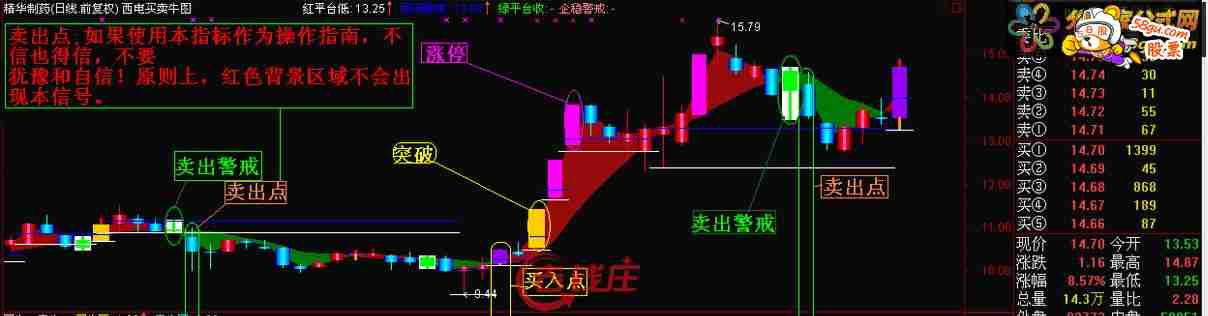 DRAWBAND(MA(C,2),RGB(150,10,10),MA(C,7),RGB(0,120,0)); STICKLINE(CLOSE>= REF(CLOSE,1) ,HIGH,LOW,0,1 ),COLORRED; STICKLINE(CLOSE>= REF(CLOSE,1) ,OPEN,CLOSE,3,0 ),COLOR000066; STICKLINE(CLOSE>= REF(CLOSE,1) ,OPEN,CLOSE,2.6,0 ),COLOR000099; STICKLINE(CLOSE>= REF(CLOSE,1) ,OPEN,CLOSE,2,0 ),COLOR0000CC; STICKLINE(CLOSE>= REF(CLOSE,1) ,OPEN,CLOSE,1.2,0 ),COLOR0000FF; STICKLINE(CLOSE>= REF(CLOSE,1) ,OPEN,CLOSE,0.4,0 ),COLORCC66FF; STICKLINE(CLOSE< REF(CLOSE,1) ,HIGH,LOW,0,1 ),COLORCYAN; STICKLINE(CLOSE< REF(CLOSE,1) ,OPEN,CLOSE,3,0 ),COLORCC0000; STICKLINE(CLOSE< REF(CLOSE,1) ,OPEN,CLOSE,2.6,0 ),COLORFF4400; STICKLINE(CLOSE< REF(CLOSE,1) ,OPEN,CLOSE,2,0 ),COLORFF8800; STICKLINE(CLOSE< REF(CLOSE,1) ,OPEN,CLOSE,1.2,0 ),COLORFFCC00; STICKLINE(CLOSE< REF(CLOSE,1) ,OPEN,CLOSE,0.4,0 ),COLORCYAN; TYX3:=MA(REF(HHV((C+L+O+H)/4,30),1),3); STICKLINE(CROSS(MA(C,2),MA(C,7)),H,C,0.05,0),COLOR0000FF; STICKLINE(CROSS(MA(C,2),MA(C,7)),C,O,3,0),COLORFF0099 ; STICKLINE(CROSS(MA(C,2),MA(C,7)),O,L,0.05,0), COLOR0099FF; XG1:=CROSS(MA(C,7),MA(C,2)); STICKLINE(XG1,H,L,3.5,0),LINETHICK1,COLORWHITE; STICKLINE(XG1,H,L,0.2,0),COLORGREEN; STICKLINE(XG1,O,C,3,0),LINETHICK1,COLORGREEN; STICKLINE((C-REF(C,1))*100/REF(C,1)>=(10-0.01*100/REF(C,1)),OPEN,CLOSE,3,0),COLORFF00FF; STICKLINE((REF(C,1)-C)*100/REF(C,1)>=(10-0.01*100/REF(C,1)),OPEN,CLOSE,3,0),COLORWHITE; STICKLINE(REF(COUNT(C<TYX3,5)=5,1) AND C>TYX3 AND C>O,C,O,3.5,0),COLOR00CCFF; P:=8; KE:=V*(H-L)/REF(C,1); KEP:=KE=HHV(KE,P); KUD:=BARSLAST(KEP); {红平台收:IF(IF(KUD=0,C>REF(C,1),REF(C,KUD)>REF(REF(C,1),KUD)),IF(KUD=0,C,REF(C,KUD)),DRAWNULL),POINTDOT,COLORYELLOW;} 红平台低:IF(IF(KUD=0,C>REF(C,1),REF(C,KUD)>REF(REF(C,1),KUD)),IF(KUD=0,L,REF(L,KUD)),DRAWNULL),POINTDOT,COLORWHITE; 回调警戒:IF(IF(KUD=0,C>REF(C,1),REF(C,KUD)>REF(REF(C,1),KUD)),IF(KUD=0,C-(C-REF(C,1))*0.618,REF(C-(C-REF(C,1))*0.618,KUD)),DRAWNULL),POINTDOT,COLORBLUE; 绿平台收:IF(IF(KUD=0,C<REF(C,1),REF(C,KUD)<REF(REF(C,1),KUD)),IF(KUD=0,C,REF(C,KUD)),DRAWNULL),POINTDOT,COLORGREEN; 企稳警戒:IF(IF(KUD=0,C<REF(C,1),REF(C,KUD)<REF(REF(C,1),KUD)),IF(KUD=0,C+(REF(C,1)-C)*0.618,REF(C+(REF(C,1)-C)*0.618,KUD)),DRAWNULL),POINTDOT,COLORLIRED; {STICKLINE(IF(KUD=0,C>REF(C,1),REF(C,KUD)>REF(REF(C,1),KUD)),红平台收,红平台收,6,1),COLORYELLOW;} STICKLINE(IF(KUD=0,C>REF(C,1),REF(C,KUD)>REF(REF(C,1),KUD)),红平台低,红平台低,6,1),COLORWHITE; STICKLINE(IF(KUD=0,C>REF(C,1),REF(C,KUD)>REF(REF(C,1),KUD)),回调警戒,回调警戒,6,1),COLORBLUE; STICKLINE(IF(KUD=0,C<REF(C,1),REF(C,KUD)<REF(REF(C,1),KUD)),绿平台收,绿平台收,6,1),COLORGREEN; STICKLINE(IF(KUD=0,C<REF(C,1),REF(C,KUD)<REF(REF(C,1),KUD)),企稳警戒,企稳警戒,6,1),COLORLIRED;