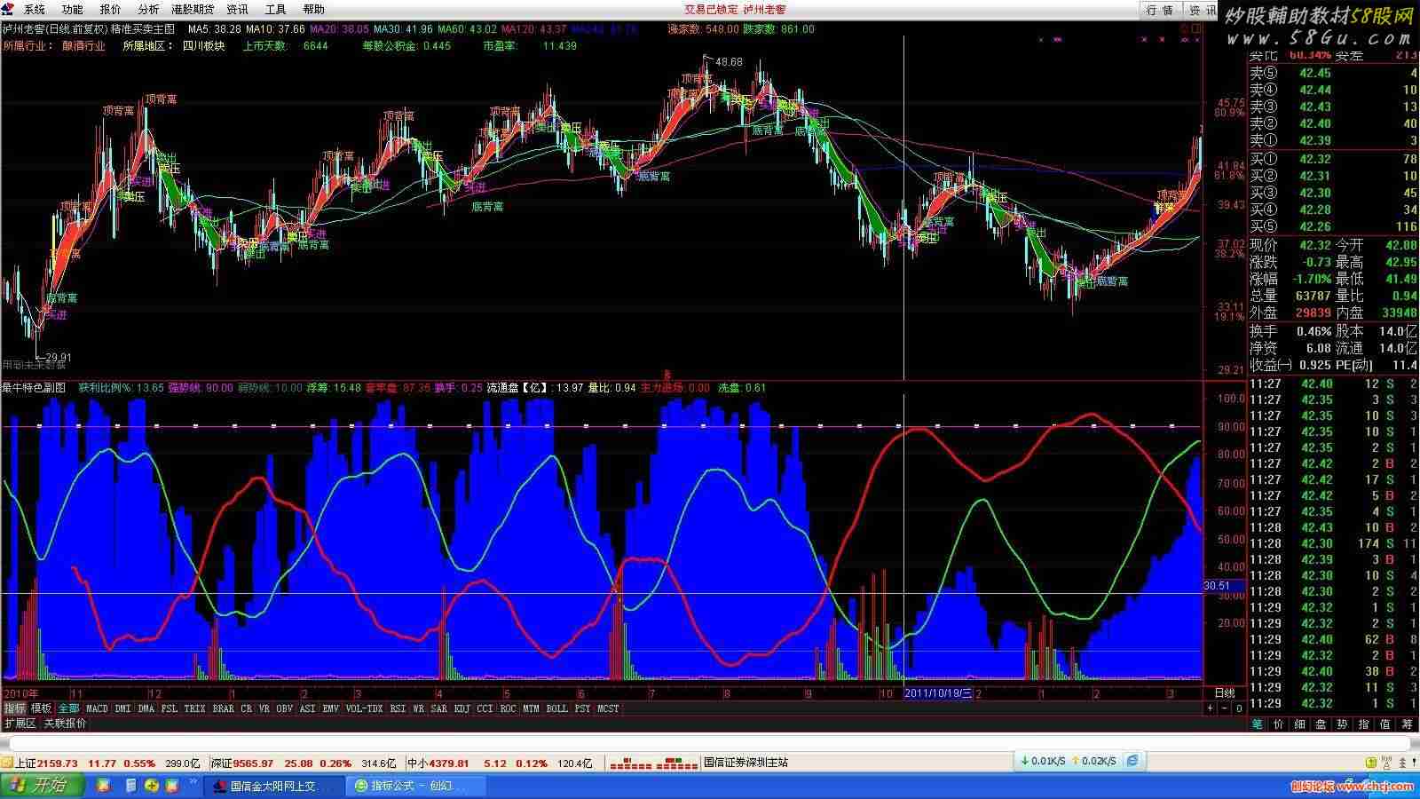用法:当绿柱逐渐变短,原则上洗盘数值为0时可入场。 STICKLINE(C AND WINNER(C)>REF(WINNER(C),1),WINNER(C)*100,0,7,0),COLORBLUE; STICKLINE(C AND WINNER(C)<REF(WINNER(C),1),WINNER(C)*100,0,7,0),COLORBLUE; 获利比例%:WINNER(C)*100,NODRAW,COLORLIBLUE; 强势线:90,COLORMAGENTA; 弱势线:10,COLORLICYAN; VAR00:=(2*CLOSE+HIGH+LOW)/4; VAR10:=(HHV(HIGH,24)-CLOSE)/(HHV(HIGH,24)-LLV(LOW,24))*100; VAR20:=(CLOSE-LLV(LOW,18))/(HHV(HIGH,18)-LLV(LOW,18))*100; B:=EMA((VAR00-LLV(LOW,26))/(HHV(HIGH,34)-LLV(LOW,26))*100,16); 浮筹:EMA(B,4),LINETHICK2,COLORGREEN; 套牢盘:MA(100*(1-WINNER(C)),20),COLORRED,LINETHICK3; 换手:(100*V/CAPITAL),LINETHICK2,COLORFF00FF; 流通盘【亿】:CAPITAL*0.000001,LINETHICK0,COLORWHITE; 量比:DYNAINFO(17),LINETHICK0; VAR1:=REF((LOW+OPEN+CLOSE+HIGH)/4,1); VAR2:=SMA(ABS(LOW-VAR1),13,1)/SMA(MAX(LOW-VAR1,0),10,1); VAR3:=EMA(VAR2,10); VAR4:=LLV(LOW,33); VAR5:=EMA(IF(LOW<=VAR4,VAR3,0),3); 主力进场:IF(VAR5>REF(VAR5,1),VAR5,0),COLORRED,NODRAW; STICKLINE(VAR5>REF(VAR5,1),0,VAR5,2,1 ),COLORRED; 洗盘:IF(VAR5<REF(VAR5,1),VAR5,0),COLORGREEN,NODRAW; STICKLINE(VAR5<REF(VAR5,1),0,VAR5,2,1),COLORGREEN; |