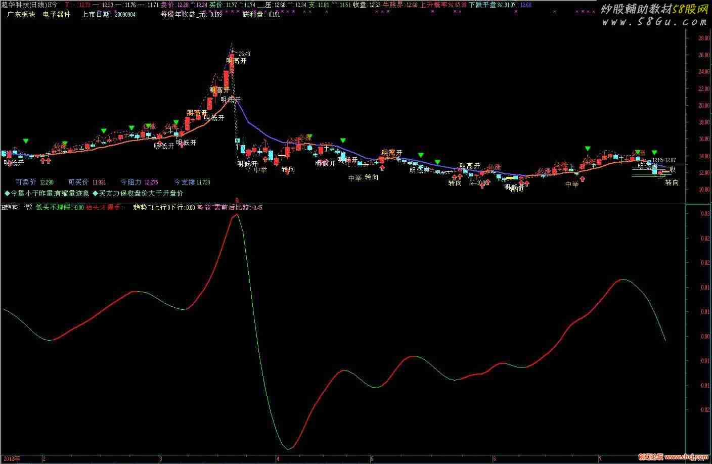 {H趋势一瞥,通达信} N0:=7; N1:=EMA(EMA(EMA(C,N0),N0),N0); N2:=(N1-REF(N1,1))/REF(N1,1); 低头不理睬:MA(N2,3),COLOR00FF00; 抬头才握手:IF(低头不理睬>REF(低头不理睬,1),低头不理睬,DRAWNULL),COLOR0000FF,LINETHICK2; MA(C,100000),COLOR000000; 趋势~1上行0下行:IF(低头不理睬>REF(低头不理睬,1),1,0),COLOR00FFFF,NODRAW; 势能~需前后比较:低头不理睬/REF(低头不理睬,1),COLORCC66FF,NODRAW;