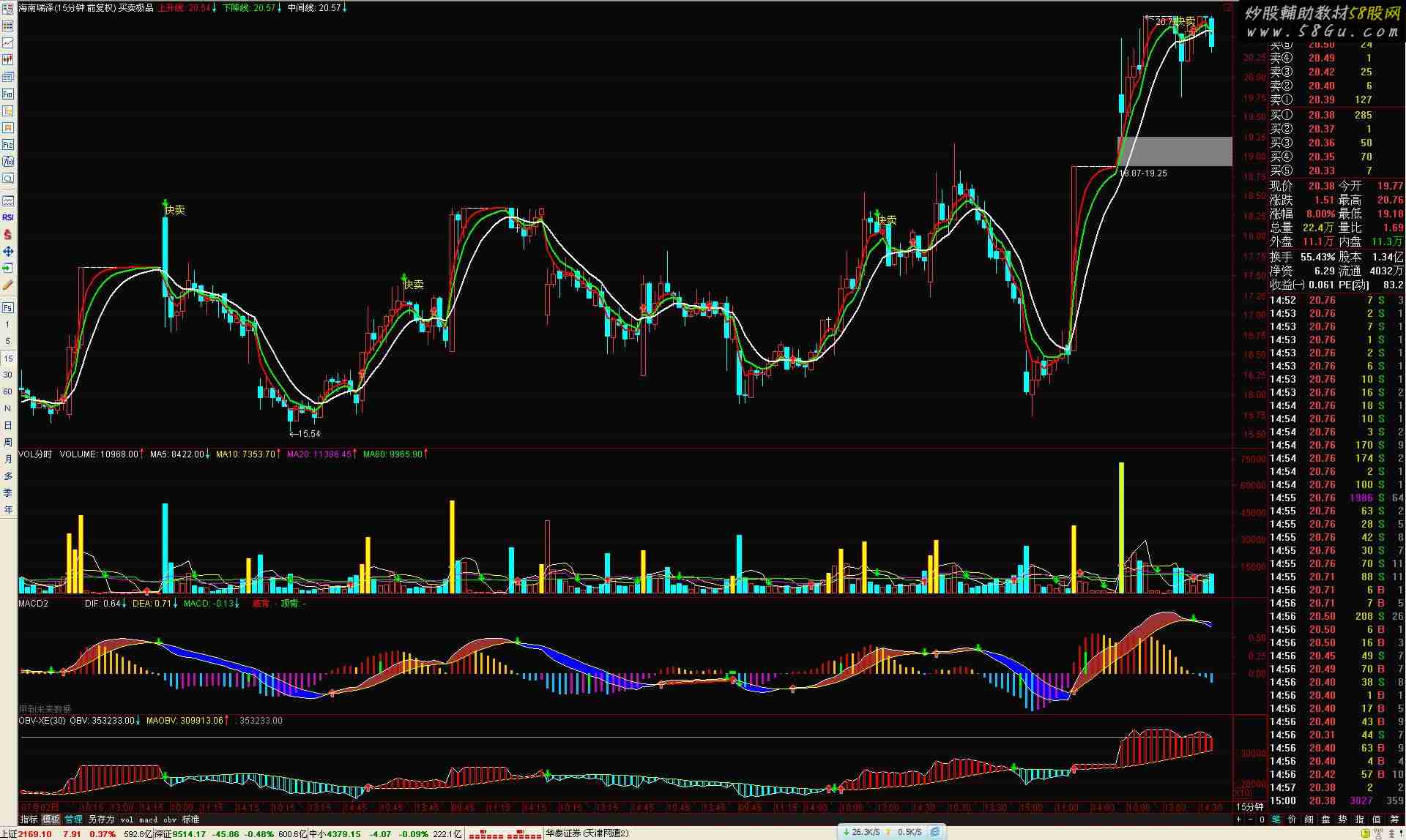 上升线:ema(c,3),colorred,linethick2;下降线:ema(c,5),color00ff00,linethick2;中间线:ema(下降线,5),colorwhite,linethick2;Var1:=(HIGH+LOW+OPEN+2*CLOSE)/5;Var2:=REF(Var1,1);Var3:=SMA((close-Var2),6,1)/SMA(ABS(close-Var2),6,1)*100;Var4:=(CLOSE-REF(OPEN,29))/REF(OPEN,29)*100;Var5:=EMA(0.667*REF(Var4,1)+0.333*Var4,5);Var6:=IF(VOL>=1.3*MA(VOL,5) AND COUNT(Var4>=Var5 and Var4<-17,3) AND REF(LOW,1)=LLV(LOW,120),1,0);Var7:=SMA(MAX(CLOSE-ref(c,1),0),6,1)/SMA(ABS(CLOSE-ref(c,1)),6,1)*100;Var8:=SMA(MAX(Var1-Var2,0),10,1)/SMA(ABS(Var1-Var2),10,1)*100;Var9:=IF(COUNT(Var8<20,5)>=1 AND COUNT(Var1=LLV(Var1,10),10)>=1 AND CLOSE>=OPEN*1.038 AND VOL>MA(VOL,5)*1.2,1,0);DRAWICON(FILTER(ref(Var3,1)>81 and Var3<80 OR CROSS(82,Var7),5),high,2);DRAWTEXT(FILTER(ref(Var3,1)>81 and Var3<80 OR CROSS(82,Var7),5),high,'快卖'),coloryellow;DRAWTEXT(FILTER(Var9 OR Var6,5),low,'注意买入'),colorred; DRAWICON(FILTER(CROSS(上升线,下降线)and 中间线>=ref(中间线,1)and Var3<50,5),上升线,1);  |
