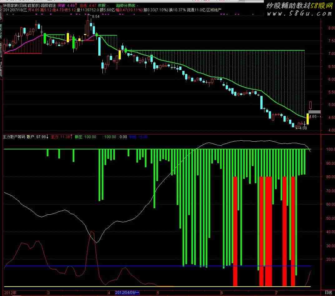 高1:=REF(HHV(H,150),3);低1:=REF(LLV(L,150),3);H1:=高1-(高1-低1)*0.191; H2:=高1-(高1-低1)*0.382; H3:=高1-(高1-低1)*0.5; H4:=高1-(高1-低1)*0.618; H5:=高1-(高1-低1)*0.809;{顶:REFDATE(高1,DATE),POINTDOT,COLORWHITE;}突破:REF(EMA(C,14),1)COLORMAGENTA,LINETHICK2;A1X:=(EMA(C,14)-突破)/突破*100;出击:IF(A1X>=0,REF(EMA(C,14),BARSLAST(CROSS(A1X,0))+1),DRAWNULL)COLORRED,LINETHICK2;休假:IF(A1X<0,REF(EMA(C,14),BARSLAST(CROSS(0,A1X))+1),DRAWNULL)COLORGREEN,LINETHICK2;STICKLINE(A1X>=0,出击,突破,0,-1)COLORRED;STICKLINE(A1X<0,休假,突破,0,-1)COLORGREEN;STICKLINE(CROSS(A1X,0),C,O,2,0)COLORYELLOW;STICKLINE(CROSS(0,A1X),C,O,2,0)COLORGREEN;趋势分界线:IF(A1X<0,突破,DRAWNULL)COLORGREEN,LINETHICK2; |