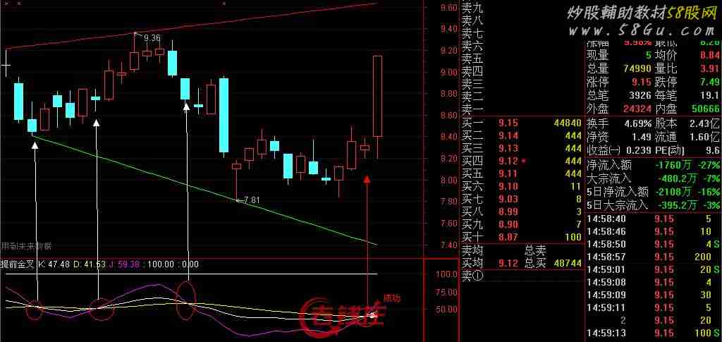 LOWV:=EMA(LLV(LOW,3),3); HIGHV:=EMA(HHV(HIGH,3),3); RSV:=EMA((CLOSE-LOWV)/(HIGHV-LOWV)*100,3); K:SMA(RSV,9,1); D:SMA(K,7,1); J:3*K-2*D; 100,COLORWHITE,LINETHICK1; 0,COLORWHITE,LINETHICK1; DRAWICON(FILTER(J<=REF(J,1) AND J>80,8), J*1.2,2); DRAWICON(CROSS(J,0),1,1);