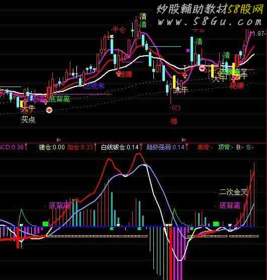 说明;主图非原创,是自己组合来成的,跌后,站稳买线上可为买点(激进派),工作线上操作....其他买卖提示几乎有未来,未来怎么用就得靠自己,不要的自己删除就可以了 参数:N1(1 300 5)N2( 1 300 10)N3(1 300 20)N4(1 300 30) P(1 5 2)M(1 60 20)N(1 500 250) M1(1 500 55) 买线:INTPART((SUM(CLOSE*VOL*100,6)/SUM(VOL*100,6))*100.17)/100,COLORFF00FF,LINETHICK2;工作线:EMA(C,13),COLOR0000FF,LINETHICK2;一线:EMA(C,25),COLORWHITE,LINETHICK2;二线:EMA(CLOSE,99),LINETHICK3,POINTDOT,COLORYELLOW; 江恩线:EMA(CLOSE,144),LINETHICK3,POINTDOT,COLORFFCC66;EMA1311:=EMA(C,13),COLOR0000FF,LINETHICK2;EMA341:=EMA(C,34),LINETHICK2,POINTDOT,COLORYELLOW;EMA551:=EMA(C,55),LINETHICK2,POINTDOT,COLORFF00FF;EMA120:=EMA(C,120),LINETHICK2,POINTDOT,COLORFFCC66;AR1:=EMA551>EMA341 AND EMA341>EMA1311;AR2:=BARSLAST((C-EMA1311)/EMA1311*100<-6);AR3:=EMA1311>=REF(EMA1311,2);AR4:=COUNT(CROSS(C,EMA1311),AR2)=1;AR5:=AR1 AND AR2 AND AR3 AND AR4;AR6:=AR5 AND FILTER(AR5,10);STICKLINE(AR6,O,C,2.5,0),LINETHICK2,COLORYELLOW;BR1:=COUNT(BETWEEN((C-REF(C,1))/REF(C,1)*100,0,5),5)=5;BR2:=ABS((EMA1311-EMA341)+(EMA341-EMA551))/C<0.2;BR3:=C>EMA551 AND (REF(C,1)<REF(EMA551,1) OR REF(C,2)<REF(EMA551,2) OR REF(C,3)<REF(EMA551,3) OR REF(C,4)<REF(EMA551,4) OR REF(C,5)<REF(EMA551,5));BR4:=BR1 AND BR2 AND BR3;STICKLINE(BR4 AND FILTER(BR4,10),O,C,2.5,0),LINETHICK2,COLOR4080FF;CR1:=(C-REF(C,1))/REF(C,1)*100>0.5;CR2:=V>MA(V,5)*0.6;CR3:=COUNT(CROSS(EMA1311,EMA551),3)=1;CR4:=ABS(EMA341-EMA551)/EMA551<0.03;CR5:=EMA551<=EMA120 AND EMA551>=REF(EMA551,1);CR6:=FILTER(CR1 AND CR2 AND CR3 AND CR4 AND CR5,2);DR1:=EMA1311>EMA341 AND EMA341<EMA551;DR2:=BARSLAST(CROSS(C,EMA551) );DR3:=H=HHV(H,DR2);DR4:=BARSLAST(DR3);DR5:=COUNT(O>C AND C<REF(C,1) AND C>EMA551 AND BETWEEN((C-EMA551)/EMA551,0,0.02),DR4)=1;DR6:=C>REF(C,1) ;DR7:= DR1 AND DR5 AND DR6 ;DR8:=DR7 AND FILTER(DR7 ,10);STICKLINE(DR8,O,C,2.5,0),LINETHICK2,COLORFF0080;ER:=BARSLAST(REF(CROSS(EMA551,EMA341),1)) AND CROSS(EMA341,EMA551);FR:=BARSLAST(REF(CROSS(EMA341,EMA1311),1)) AND CROSS(EMA1311,EMA341);GR1:=BARSLAST(BETWEEN("BIAS.BIAS2"(6,13,24),0,5) );GR2:=EMA1311>EMA341 AND EMA341>EMA551 AND EMA1311>REF(EMA1311,1);GR3:=COUNT("BIAS.BIAS2"(6,13,24)>10 AND H=HHV(H,GR1),GR1);GR4:=H=HHV(H,GR1);GR5:="MACD.MACD"(12,26,9)<REF("MACD.MACD"(12,26,9),1);GR6:=GR2 AND GR3 AND GR4;GR7:=GR2 AND GR3 AND GR4 AND GR5;DRAWTEXT(GR6 AND GR7,H+0.13,'*'),COLOR00FF00;HR2:=EMA1311>=REF(EMA1311,3) AND EMA341>=REF(EMA341,1) AND EMA551>=REF(EMA551,1) AND CROSS(C,EMA1311) AND CROSS(C,EMA341) AND CROSS(C,EMA551);STICKLINE(HR2 AND FILTER(HR2,10),O,C,3,0),LINETHICK2,COLORFF80FF;MA1:=EMA(CLOSE,N1);MA2:=EMA(CLOSE,N2);MA3:=EMA(CLOSE,N3);MA4:=EMA(CLOSE,N4);TJ1:=CROSS(MA1,MA2) AND C>O AND C>REF(C,1) AND C/REF(C,1)>=1.018OR CROSS(MA1,MA4) AND C>O AND C>REF(C,1) AND C/REF(C,1)>=1.018OR CROSS(MA2,MA3) AND C>O AND C>REF(C,1) AND C/REF(C,1)>=1.018OR CROSS(MA1,MA3) AND C>O AND C>REF(C,1) AND C/REF(C,1)>=1.018;TJ2:=(MAX(MA1,MAX(MA2,MA3))-MIN(MA1,MIN(MA2,MA3)))/MIN(MA1,MIN(MA2,MA3))*100<=P;XG:=TJ1 AND TJ2;RSV:=(CLOSE-LLV(LOW,9))/(HHV(HIGH,9)-LLV(LOW,9))*100;K:=SMA(RSV,3,1);D:=SMA(K,3,1);DIFF:= EMA(CLOSE,12) - EMA(CLOSE,26);DEA :=EMA(DIFF,9);MACD:=2*(DIFF-DEA);做多:IF(K>D AND MACD>0 AND V>1,2,0),COLORRED,NODRAW;做空:=IF(K<D AND MACD<0 AND V>1,-2,0),COLOR00FF00,NODRAW;强洗:=IF(MACD>0 AND K<D AND V>1,1,0),COLOR0099FF,NODRAW;弱升:=IF(MACD<0 AND K>D AND V>1,-1,0),COLORFFFF00,NODRAW;STICKLINE(FILTER(TJ1,3),C,O,4,0),COLOR0000FF;DRAWICON(FILTER(XG,3),L*0.97,23);GET:=ZIG(3,3),COLORYELLOW;PL5:=ZIG(3,5);EN1:=ZIG(3,5)>REF(ZIG(3,5),1) AND REF(ZIG(3,5),1)<=REF(ZIG(3,5),2) AND REF(ZIG(3,5),2)<=REF(ZIG(3,5),3);EX1:=ZIG(3,5)<REF(ZIG(3,5),1) AND REF(ZIG(3,5),1)>=REF(ZIG(3,5),2) AND REF(ZIG(3,5),2)>=REF(ZIG(3,5),3);PL10:=ZIG(3,10);EN2:=ZIG(3,10)>REF(ZIG(3,10),1) AND REF(ZIG(3,10),1)<=REF(ZIG(3,10),2) AND REF(ZIG(3,10),2)<=REF(ZIG(3,10),3);EX2:=ZIG(3,10)<REF(ZIG(3,10),1) AND REF(ZIG(3,10),1)>=REF(ZIG(3,10),2) AND REF(ZIG(3,10),2)>=REF(ZIG(3,10),3);PL20:=ZIG(3,20);EN3:=ZIG(3,20)>REF(ZIG(3,20),1) AND REF(ZIG(3,20),1)<=REF(ZIG(3,20),2) AND REF(ZIG(3,20),2)<=REF(ZIG(3,20),3);EX3:=ZIG(3,20)<REF(ZIG(3,20),1) AND REF(ZIG(3,20),1)>=REF(ZIG(3,20),2) AND REF(ZIG(3,20),2)>=REF(ZIG(3,20),3);PL40:=ZIG(3,40);走强1:=BARSLAST(PL5<REF(PL5,1));走弱1:=BARSLAST(PL5>REF(PL5,1));走强2:=BARSLAST(PL10<REF(PL10,1));走弱2:=BARSLAST(PL10>REF(PL10,1));走强3:=BARSLAST(PL20<REF(PL20,1));走弱3:=BARSLAST(PL20>REF(PL20,1));ZTJZ5:=IF(PL10>REF(PL10,1),COUNT(EN1,走强2),0);ZTJD5:=IF(PL10>REF(PL10,1),COUNT(EX1,走强2),0);DTJZ5:=IF(PL10<REF(PL10,1),COUNT(EN1,走弱2),0);DTJD5:=IF(PL10<REF(PL10,1),COUNT(EX1,走弱2),0);ZTJZ10:=IF(PL20>REF(PL20,1),COUNT(EN2,走强3),0);ZTJD10:=IF(PL20>REF(PL20,1),COUNT(EX2,走强3),0);DTJZ10:=IF(PL20<REF(PL20,1),COUNT(EN2,走弱3),0);DTJD10:=IF(PL20<REF(PL20,1),COUNT(EX2,走弱3),0);DRAWTEXT(EN1 AND DTJZ5=1,L*0.98,'(A)'),COLORFFFF00;DRAWTEXT(EX1 AND DTJD5=2,H*1.02,'(B)'),COLORFF00FF;DRAWTEXT(EN2 AND ZTJZ5=1,L*0.98,'(C)'),COLOR0000FF;DRAWTEXT(EX1 AND PL10>REF(PL10,1) AND ZTJD5=1,H*1.02,'半仓'),COLOR0000FF;DRAWTEXT(EN1 AND PL10>REF(PL10,1) AND ZTJZ5=2,L*0.98,'稳赚'),COLOR0000FF;DRAWTEXT(EX1 AND PL10>REF(PL10,1) AND ZTJZ5=2,H*1.02,'清'),COLOR0000FF;DRAWTEXT(EN1 AND PL10>REF(PL10,1) AND ZTJZ5=3,L*0.98,'有机'),COLOR0000FF;DRAWTEXT(EX2 AND PL20>REF(PL20,1) AND ZTJD10=1,H*1.02,'闪'),COLOR0000FF;DRAWTEXT(EN2 AND DTJZ10=1,L*0.93,'人'),COLORFF00FF;DRAWTEXT(EX2 AND DTJD10=2,H*1.05,'鬼'),COLORFFFF00;DRAWTEXT(EN3 AND ZTJZ10=1,L*0.93,'神'),COLOR0000FF;DRAWTEXT(EX2 AND PL20>REF(PL20,1) AND ZTJD10=1,H*1.03,'走'),LINETHICK3,COLOR00FFFF;DRAWTEXT(EN2 AND PL20>REF(PL20,1) AND ZTJZ10=2,L*0.95,'买点'),LINETHICK3,COLOR00FFFF;DRAWTEXT(EX2 AND PL20>REF(PL20,1) AND ZTJD10=2 OR (ZTJD10=0 OR ZTJD10=2) AND EX2,H*1.03,'清'),LINETHICK3,COLOR00FFFF;DRAWTEXT(EN2 AND PL20>REF(PL20,1) AND ZTJZ10=3,L*0.95,'少买'),LINETHICK3,COLOR00FFFF;HR:=HHV(HIGH,M1);HRY:=LLV(LOW,M1);HRY11:=HR*HRY;HRY33:=SQRT(HRY11),COLORGREEN,LINETHICK2;国:=I