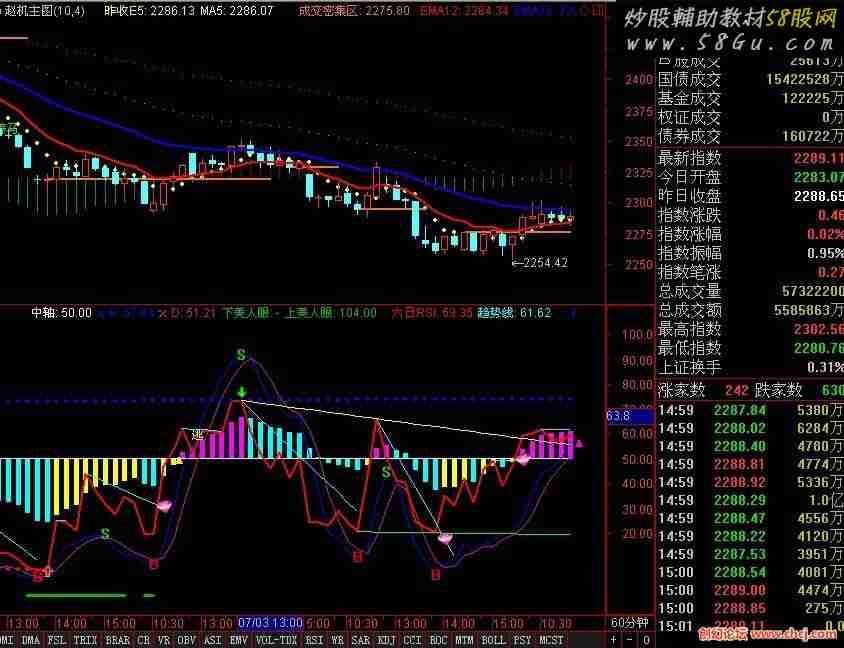 N:=18;M1:=3;M2:=3; DIFF:=(EMA(C,5)-EMA(C,26))/EMA(C,26)*1000,COLOR000000; DDEA:=EMA(DIFF,50),COLOR000000; MACD:2*(DIFF-DDEA)+50,COLOR000000; STICKLINE(MACD<REF(MACD,1)AND MACD>50,50,MACD,1,0),COLORCYAN; STICKLINE(MACD<REF(MACD,1)AND MACD<50,50,MACD,1,0),COLORCYAN; STICKLINE(MACD>REF(MACD,1)AND MACD<50,50,MACD,1,0),COLORYELLOW; STICKLINE(MACD>REF(MACD,1)AND MACD>50,50,MACD,1,0),COLORFF00FF; BIAS1:=(C-MA(C,6))/MA(C,6)*100; BIAS2:=(C-MA(C,12))/MA(C,12)*100; BIAS3:=(C-MA(C,24))/MA(C,24)*100; BIAS:=(BIAS1+2*BIAS2+3*BIAS3)/6; 乖离:=MA(BIAS,3); STICKLINE(CROSS(BIAS,乖离) AND 乖离<-9,8,0,2,0),COLORYELLOW; 中轴:50,COLORWHITE; RSV:=(CLOSE-LLV(LOW,N))/(HHV(HIGH,N)-LLV(LOW,N))*100; %K:MA(RSV,M1),COLORBLUE; %D:MA(%K,M2),COLORAA00DD; DIF:=EMA(CLOSE,12)-EMA(CLOSE,26); DEA:=EMA(DIF,9); VAR1:=HHV(DEA,53); VAR2:=LLV(DEA,55); VAR3:=DEA-(DIF-DEA); UP:=IF(DIF>VAR1 AND DEA=VAR1,MAX(LLV(VAR1,10),VAR3),VAR1); DN:=IF(DIF<VAR2 AND DEA=VAR2,MIN(HHV(VAR2,10),VAR3),VAR2); 下美人眼:IF(DIF<DN,-5,DRAWNULL),COLOR00BB00,LINETHICK3; {通达信} 上美人眼:IF(DIF>UP,104,DRAWNULL),COLOR00BB00,LINETHICK3; {通达信}; J:=3*%K-2*%D,COLORWHITE; OBV:=%K; AAA1:=REF(OBV,5)=HHV(OBV,2*5+1); BBB1:=FILTER(AAA1,5); CCC1:=BACKSET(BBB1,5+1); DDD1:=FILTER(CCC1,5);{高点} AAA2:=REF(OBV,5)=LLV(OBV,2*5+1); BBB2:=FILTER(AAA2,5); CCC2:=BACKSET(BBB2,5+1); DDD2:=FILTER(CCC2,5);{低点} DRAWICON(DDD1,OBV,8); DRAWICON(DDD2,OBV,7); 六日RSI:SMA(MAX(C-REF(C,1),0),6,1)/SMA(ABS(C-REF(C,1)),6,1)*100,LINETHICK2,COLORRED; 趋势线:DRAWLINE(六日RSI>=HHV(六日RSI,10),六日RSI,六日RSI<=LLV(六日RSI,3),HHV(六日RSI,3),1),COLORCYAN; 上穿:=CROSS(六日RSI,趋势线); DRAWICON(上穿 AND 六日RSI<75,趋势线,25);P:=5; N1:=6; HIGHN:=20; LC:=REF(CLOSE,1); AA:=REF(六日RSI,HIGHN)=HHV(六日RSI,2*HIGHN+1); QY:=BACKSET(AA,HIGHN+1); CC:=FILTER(QY,HIGHN) AND 六日RSI=HHV(六日RSI,HIGHN+1); DDD:=BARSLAST(CC); GDTS:=IF(CC,CURRBARSCOUNT,0); DINGBUTS:=IF(DDD,REF(GDTS,DDD),GDTS); GDCS1:=CONST(DINGBUTS); DINGBUTS1:=REF(DINGBUTS,DDD+1); GDCS2:=CONST(DINGBUTS1); AA1:=REF(六日RSI,HIGHN)=LLV(六日RSI,2*HIGHN+1); QY1:=BACKSET(AA1,HIGHN+1); CC1:=FILTER(QY1,HIGHN) AND 六日RSI=LLV(六日RSI,HIGHN+1); DD1:=BARSLAST(CC1); DDTS:=IF(CC1,CURRBARSCOUNT,0); DDTS1:=IF(DD1,REF(DDTS,DD1),DDTS); DDCS1:=CONST(DDTS1); DDTS2:=REF(DDTS1,DD1+1); DDCS2:=CONST(DDTS2); A1:=REF(六日RSI,P)=HHV(六日RSI,2*P+1); B1:=FILTER(A1,P); C1:=BACKSET(B1,P+1); D1:=FILTER(C1,P); A2:=REF(六日RSI,P)=LLV(六日RSI,2*P+1); B2:=FILTER(A2,P); C2:=BACKSET(B2,P+1); D2:=FILTER(C2,P); R11:=BACKSET(ISLASTBAR,BARSLAST(D1)+1); S11:=R11>REF(R11,1); T11:=BACKSET(ISLASTBAR,BARSLAST(D2)+1); U11:=T11>REF(T11,1); MID:=MA(六日RSI,20); UPPER:=MID + 2*STD(六日RSI,20); LOWER:=MID - 2*STD(六日RSI,20); 高:=REF(HHV(六日RSI,360),1); 低:=REF(LLV(六日RSI,240),1); DRAWICON(CC,六日RSI*1.03,2); DRAWICON(CC1,六日RSI*0.97,1); 高压:DRAWLINE(CURRBARSCOUNT=GDCS2,六日RSI,CURRBARSCOUNT=GDCS1,六日RSI,1) COLORBLUE,POINTDOT,LINETHICK4; 低支:DRAWLINE(CURRBARSCOUNT=DDCS2,六日RSI,CURRBARSCOUNT=DDCS1,六日RSI,1) COLORRED,POINTDOT,LINETHICK4; 阻力:DRAWLINE(D1,六日RSI,S11,六日RSI,1),COLORYELLOW; 支撑:DRAWLINE(D2,六日RSI,U11,六日RSI,1),COLOR00FF00; DRAWTEXT(CROSS(六日RSI,LOWER),LOWER,'抄'),COLOR00FF00; DRAWTEXT(CROSS(LOWER,六日RSI),LOWER,'▼'),COLOR00FF00; DRAWTEXT(CROSS(六日RSI,高),MID,'年高'),COLORYELLOW; DRAWTEXT(CROSS(低,六日RSI),MID,'年低'),COLORYELLOW; DRAWTEXT(CROSS(UPPER,六日RSI),UPPER,'逃'),COLORYELLOW; DRAWTEXT(CROSS(六日RSI,UPPER),UPPER,'▲'),COLORYELLOW; VM:MA(六日RSI,N1),COLORFF00FF,NODRAW; STICKLINE(CROSS(BIAS,乖离) AND 乖离<-9,6,0,2,0),COLORRED; DRAWTEXT(ISLASTBAR AND 六日RSI>REF(六日RSI,1),VM,' ▲'),COLORDD00FF; DRAWTEXT(ISLASTBAR AND 六日RSI<REF(六日RSI,1),VM,' ▼'),COLORCCEE00;