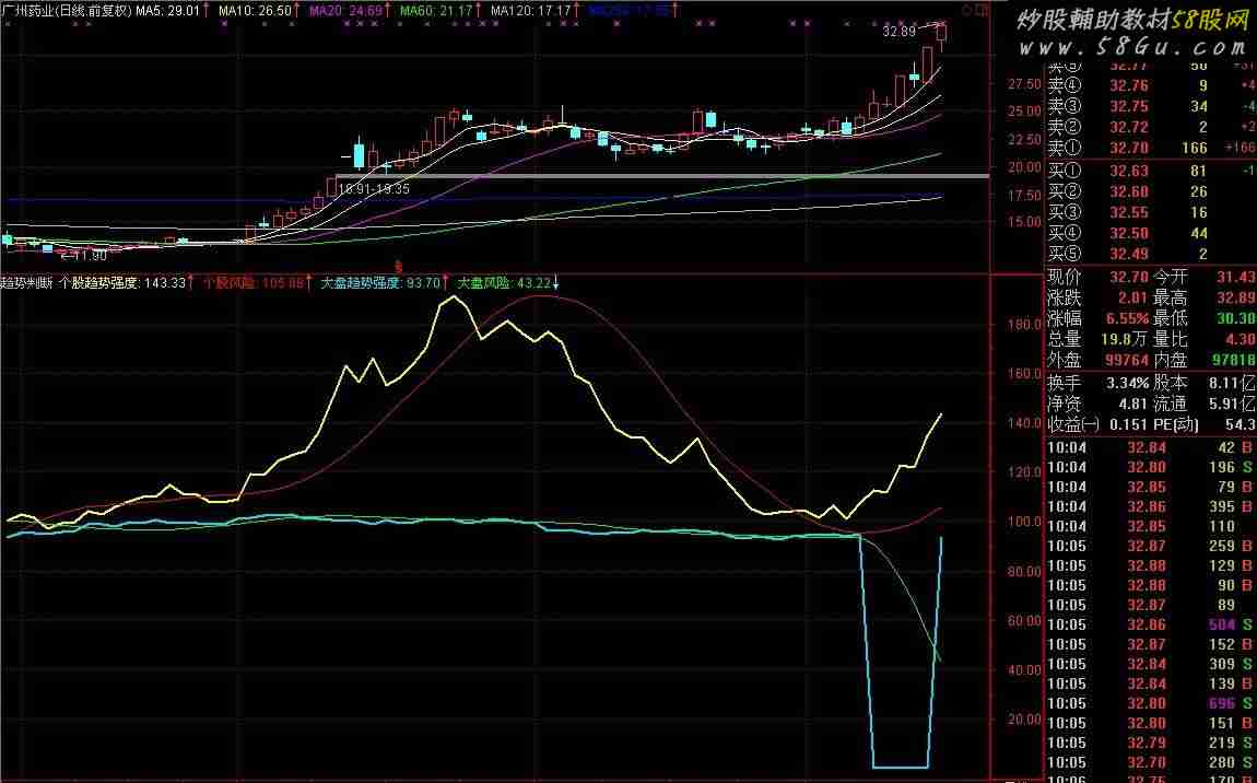 VAR1:=INDEXC;VAR2:=REF(VAR1,18);VAR3:=MA(VAR2,18);个股趋势强度:C/MA(REF(C,18),18)*100,COLOR0BFFFF,LINETHICK2;个股风险:MA(FORCAST(个股趋势强度,20),6),COLORRED;大盘趋势强度:VAR1/VAR3*100,COLORF4E202,LINETHICK2;大盘风险:MA(FORCAST(大盘趋势强度,20),6),COLORGREEN;