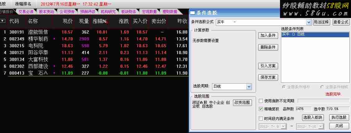 使用说明; 买入点;信则是.不过,在绿色背景下出现本信号,千万谨慎 买入操作,没有把握不要做! 卖出点;如果使用本指标作为操作指南,不信也得信,不要 犹豫和自信.原则上,红色背景区域不会出现本信号。 顺带多一句;股票都是好股票,如果输了是自己的命、及运气木好! 据此公式入市操作,一旦输了,自认倒霉! 特别说明:股票的操作,要么按照自己的感觉或者灵感实施,要么借助工具。不 要模棱两可、犹豫不决,本指标对于抱着怀疑一切的叶公们请绕行。 DRAWBAND(MA(C,2),RGB(150,10,10),MA(C,7),RGB(0,120,0)); STICKLINE(CLOSE>= REF(CLOSE,1) ,HIGH,LOW,0,1 ),COLORRED; STICKLINE(CLOSE>= REF(CLOSE,1) ,OPEN,CLOSE,3,0 ),COLOR000066; STICKLINE(CLOSE>= REF(CLOSE,1) ,OPEN,CLOSE,2.6,0 ),COLOR000099; STICKLINE(CLOSE>= REF(CLOSE,1) ,OPEN,CLOSE,2,0 ),COLOR0000CC; STICKLINE(CLOSE>= REF(CLOSE,1) ,OPEN,CLOSE,1.2,0 ),COLOR0000FF; STICKLINE(CLOSE>= REF(CLOSE,1) ,OPEN,CLOSE,0.4,0 ),COLORCC66FF; STICKLINE(CLOSE< REF(CLOSE,1) ,HIGH,LOW,0,1 ),COLORCYAN; STICKLINE(CLOSE< REF(CLOSE,1) ,OPEN,CLOSE,3,0 ),COLORCC0000; STICKLINE(CLOSE< REF(CLOSE,1) ,OPEN,CLOSE,2.6,0 ),COLORFF4400; STICKLINE(CLOSE< REF(CLOSE,1) ,OPEN,CLOSE,2,0 ),COLORFF8800; STICKLINE(CLOSE< REF(CLOSE,1) ,OPEN,CLOSE,1.2,0 ),COLORFFCC00; STICKLINE(CLOSE< REF(CLOSE,1) ,OPEN,CLOSE,0.4,0 ),COLORCYAN; TYX3:=MA(REF(HHV((C+L+O+H)/4,30),1),3); STICKLINE(CROSS(MA(C,2),MA(C,7)),H,C,0.05,0),COLOR0000FF; STICKLINE(CROSS(MA(C,2),MA(C,7)),C,O,3,0),COLORFF0099 ; STICKLINE(CROSS(MA(C,2),MA(C,7)),O,L,0.05,0), COLOR0099FF; XG1:=CROSS(MA(C,7),MA(C,2)); STICKLINE(XG1,H,L,3.5,0),LINETHICK1,COLORWHITE; STICKLINE(XG1,H,L,0.2,0),COLORGREEN; STICKLINE(XG1,O,C,3,0),LINETHICK1,COLORGREEN; STICKLINE((C-REF(C,1))*100/REF(C,1)>=(10-0.01*100/REF(C,1)),OPEN,CLOSE,3,0),COLORFF00FF; STICKLINE((REF(C,1)-C)*100/REF(C,1)>=(10-0.01*100/REF(C,1)),OPEN,CLOSE,3,0),COLORWHITE; STICKLINE(REF(COUNT(C<TYX3,5)=5,1) AND C>TYX3 AND C>O,C,O,3.5,0),COLOR00CCFF; P:=8; KE:=V*(H-L)/REF(C,1); KEP:=KE=HHV(KE,P); KUD:=BARSLAST(KEP); {红平台收:IF(IF(KUD=0,C>REF(C,1),REF(C,KUD)>REF(REF(C,1),KUD)),IF(KUD=0,C,REF(C,KUD)),DRAWNULL),POINTDOT,COLORYELLOW;} 红平台低:IF(IF(KUD=0,C>REF(C,1),REF(C,KUD)>REF(REF(C,1),KUD)),IF(KUD=0,L,REF(L,KUD)),DRAWNULL),POINTDOT,COLORWHITE; 回调警戒:IF(IF(KUD=0,C>REF(C,1),REF(C,KUD)>REF(REF(C,1),KUD)),IF(KUD=0,C-(C-REF(C,1))*0.618,REF(C-(C-REF(C,1))*0.618,KUD)),DRAWNULL),POINTDOT,COLORBLUE; 绿平台收:IF(IF(KUD=0,C<REF(C,1),REF(C,KUD)<REF(REF(C,1),KUD)),IF(KUD=0,C,REF(C,KUD)),DRAWNULL),POINTDOT,COLORGREEN; 企稳警戒:IF(IF(KUD=0,C<REF(C,1),REF(C,KUD)<REF(REF(C,1),KUD)),IF(KUD=0,C+(REF(C,1)-C)*0.618,REF(C+(REF(C,1)-C)*0.618,KUD)),DRAWNULL),POINTDOT,COLORLIRED; {STICKLINE(IF(KUD=0,C>REF(C,1),REF(C,KUD)>REF(REF(C,1),KUD)),红平台收,红平台收,6,1),COLORYELLOW;} STICKLINE(IF(KUD=0,C>REF(C,1),REF(C,KUD)>REF(REF(C,1),KUD)),红平台低,红平台低,6,1),COLORWHITE; STICKLINE(IF(KUD=0,C>REF(C,1),REF(C,KUD)>REF(REF(C,1),KUD)),回调警戒,回调警戒,6,1),COLORBLUE; STICKLINE(IF(KUD=0,C<REF(C,1),REF(C,KUD)<REF(REF(C,1),KUD)),绿平台收,绿平台收,6,1),COLORGREEN; STICKLINE(IF(KUD=0,C<REF(C,1),REF(C,KUD)<REF(REF(C,1),KUD)),企稳警戒,企稳警戒,6,1),COLORLIRED;