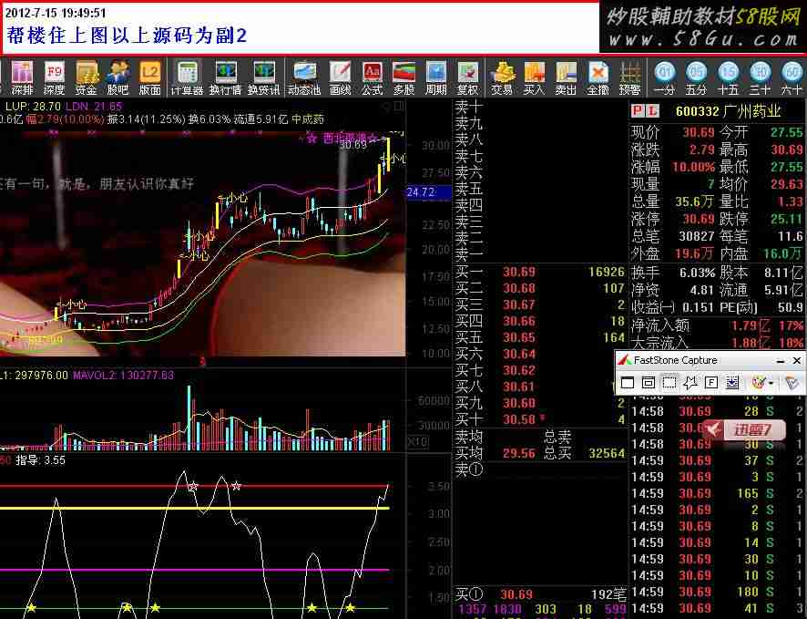 强势:2,LINETHICK2,COLORFF00FF;准强:1.3,LINETHICK1,COLOR00FF00;低吸:0.3,LINETHICK1,COLORWHITE;UP:=( C > O OR C > REF(C,1)) AND V > REF(V,1);AA:=COUNT(UP,3)=3;BB:=LLV(L,5)=LLV(L,120);CC:=C > MA(C,3);LLT:=AA AND BB AND CC;{头部}V1:=LLV(LOW,10);V2:=HHV(H,25);警戒:3.1,LINETHICK3,COLOR00FFFF;高抛:3.5,LINETHICK2,COLOR0000FF;指导:EMA((C-V1)/(V2-V1)*4,4),COLORWHITE;M5:=MA(指导,5);VAR2:=IF(EMA(CLOSE,5)/EMA(EMA(CLOSE,9),16)<=0.85 AND CLOSE/REF(CLOSE,1)>0.905 AND CLOSE/REF(CLOSE,1)<1.05 AND VOL/CAPITAL*100<5,50,0);VAR3:=(-100)*(HHV(HIGH,34)-CLOSE)/(HHV(HIGH,34)-LLV(LOW,34))+100;VAR4:=(-100)*(HHV(HIGH,50)-CLOSE)/(HHV(HIGH,50)-LLV(LOW,50))+100;VAR5:=(-100)*(HHV(HIGH,70)-CLOSE)/(HHV(HIGH,70)-LLV(LOW,70))+100;VAR6:=((CLOSE-MA(CLOSE,34))/MA(CLOSE,34)*100+10)*5;VAR7:=((CLOSE-MA(CLOSE,50))/MA(CLOSE,50)*100+10)*5;VAR8:=((CLOSE-MA(CLOSE,70))/MA(CLOSE,70)*100+10)*5;VAR9:=(VAR3+VAR4+VAR5+VAR6+VAR7+VAR8)/6;VARA:=EMA(VAR9,3);VARB:=ABS(VAR6-VAR8);VARC:=(VAR9+VARB)/2;VARD:=(-1)*(EMA(100*(1-WINNER(CLOSE)),1)-50)+50;VARE:=VARD+VARC;VARF:=IF(VAR2>0 AND VARE<0,200,0);VAR10:=IF(VARC<0 AND CLOSE=LLV(CLOSE,5) AND CLOSE/REF(CLOSE,1)>0.905 AND CLOSE/REF(CLOSE,1)<1.05 AND VOL/CAPITAL*100<5,-50,0);VAR11:=IF(VARE<0 AND VAR10=-50,100,0);VAR12:=MA(CLOSE,3);VAR13:=REF(CLOSE,2)*0.865;VAR14:=REF(CLOSE,13)*0.772;VAR15:=MIN(VAR13,VAR14);VAR16:=100*VOL/CAPITAL;VAR17:=MA(CLOSE,13);VAR18:=IF((CLOSE-VAR15)/CLOSE<0.03 AND SUM(VAR16,5)/5<1.8,1,0);VAR19:=IF(VAR18>0 AND (VAR10<0 OR VAR2>0),100,0);VAR1A:=VAR19;VAR1B:=IF(VARF>0 AND VAR11>0 AND SUM(VOL/CAPITAL*100,5)/5<1 OR VAR18>0 AND REF(CLOSE,1)/REF(CLOSE,2)>0.902 OR (VARF>0 AND VAR11>0 AND SUM(VOL/CAPITAL*100,5)/5<1 OR VAR18>0) AND (VAR10<0 OR VAR2>0) AND VAR19<10,50,0);VAR1C:=(VARF>0 AND VAR11>0 AND SUM(VOL/CAPITAL*100,5)/5<1 OR VAR18>0) AND (VAR10<0 OR VAR2>0);VAR1D:=VARF>0 AND VAR11>0 AND SUM(VOL/CAPITAL*100,5)/5<1 OR VAR18>0 AND REF(CLOSE,1)/REF(CLOSE,2)>0.902;DRAWTEXT(CROSS(指导,准强),准强,'★'),COLORYELLOW;DRAWTEXT(CROSS(高抛,指导),高抛,'☆'); |