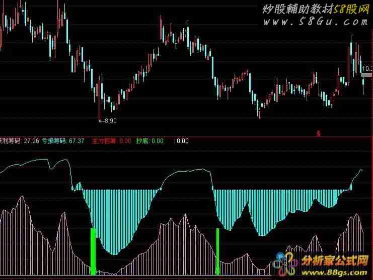 获利筹码:EMA(WINNER(C)*70,5),COLORD98EF1; 亏损筹码:EMA((WINNER(C*1.1)-WINNER(C*0.9))*80,5),COLORF3FF00; STICKLINE(获利筹码<亏损筹码 AND 亏损筹码<60,亏损筹码,55,1,0),COLORF3FF00; STICKLINE(获利筹码>亏损筹码,亏损筹码,50,1,0),COLORRED; 主力控筹:IF(获利筹码>亏损筹码,获利筹码, 0),POINTDOT,COLORRED; STICKLINE(获利筹码<亏损筹码,获利筹码,0,0,0),COLORD98EF1; AI:=AMOUNT/VOL/100; C0:=REF(C,2)*0.865; C1:=REF(C,13)*0.772; DSY:=100*VOL/CAPITAL; 抄底:IF((C-MIN(C0,C1))/C<0.1 AND SUM(DSY,5)/5<1.8,10, 0),COLOR00FF00; 灾区:STICKLINE(获利筹码<10,亏损筹码,亏损筹码+5,2,0),POINTDOT,COLORFF009D; 重灾区:STICKLINE(获利筹码<5,亏损筹码,亏损筹码+8,2,0),POINTDOT,COLOR970000; STICKLINE(抄底,0,30,4,0),COLOR00FF00; 0,COLORFFFFFF; 指标注释:粉红色代表获利筹码,蓝色代表亏损筹码。出现红色代表主力控筹,出现绿色柱子代表抄底信号。