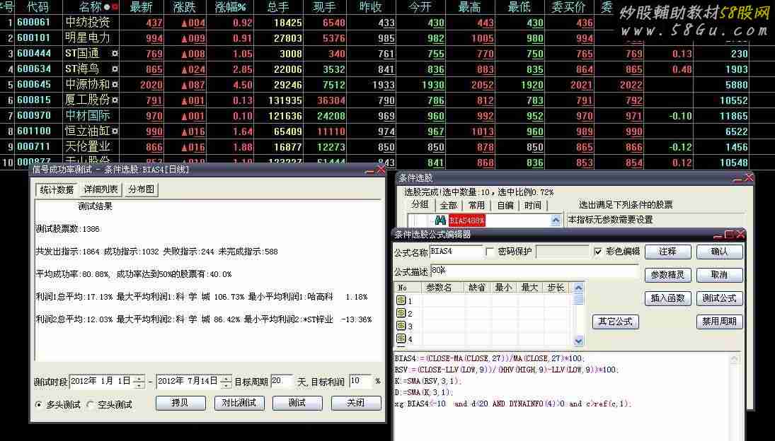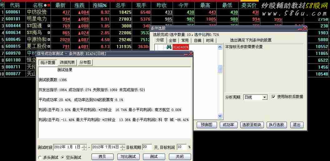 把BIAS搭配kd选股发出指示1864个信号选出10个股票【20天获利10%】成功率81%失败率20%. 【xg:BIAS4<-10and d<20 】其中-10和20根据走势可调.目标【1】成功率要大于75%【2】发出指示多于500.【3】选出股票不多于20个.当然选股必须【兼听则明偏信则暗】看看K线其他指标如何才能最后确定你要买入的股票那叫【百里挑一】吗.买入时还要分批次.还要看大盘.还要看分时高低.当然是越便宜愈好.---------不用啰嗦谁也不会和钱较劲的.不是吗.图上1386是深沪A股股票数.不包括200.和300字头