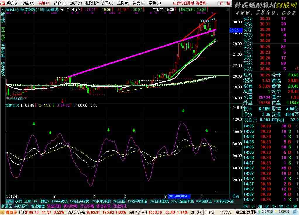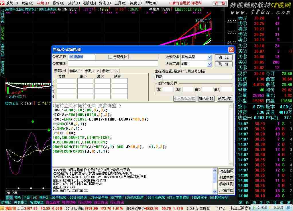 改一下让提前金叉和提前死叉 更准确些{提前金叉和提前死叉 更准确些 } LOWV:=EMA(LLV(LOW,3),3); HIGHV:=EMA(HHV(HIGH,3),3); RSV:=EMA((CLOSE-LOWV)/(HIGHV-LOWV)*100,3); K:SMA(RSV,9,1); D:SMA(K,7,1); J:3*K-2*D; 100,COLORWHITE,LINETHICK1; 0,COLORWHITE,LINETHICK1; DRAWICON(FILTER(J<=REF(J,1) AND J>80,8), J*1.2,2); DRAWICON(CROSS(J,0),1,1);  |