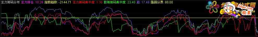 主力持仓:EMA(100*(CLOSE-LLV(LOW,34))/(HHV(HIGH,34)-LLV(LOW,34)),3),COLORFF00FF; 指数趋势:EMA(1250*(INDEXC-LLV(INDEXL,34))/HHV(INDEXH,34)-LLV(INDEXL,34),3),COLORYELLOW,NODRAW; 主力筹码集中度:WINNER(C)*100,COLORRED; 散筹筹码集中度: (WINNER(C*1.1)-WINNER(C*0.9))*100,COLORGREEN; 启:(主力持仓+主力筹码集中度+散筹筹码集中度)/2,COLORFF6699; 强弱分界:80,COLOR00FFFF;