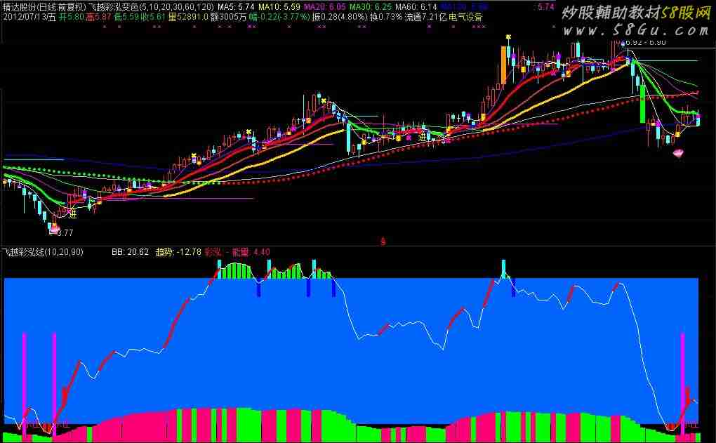 飞越彩泓线个人认为,任何一种股票指标,也只是如一种物体划过之后的一种抛物线的轨迹而已,追其研究意义也不过是一种“马后炮”的一种游戏。飞越彩泓线,也是如此。而且,也是站在别人的肩膀上学走路。其源码就是网络搜集的整合而已。望有侵权之友,见谅!关于其演绎的思路,想过许久,还是保留其一,其二。其一是,隐藏趋势线只留有趋势值;其二,显示其趋势线的真面目,但有一个问题得忍受,就是画面有一个被压扁的感受。还有就是关于其选股的思路,至今还是无法定夺。开始的“飞越彩泓选股”的思路是:量+价+资金+均线+飞越彩泓线(庄家多空或倍量图+变色均线或飞越彩泓变色+主力资金动向)其理论基础是唐能通股票大师的均量、均价与资金的关系等。但这个选股,速度极慢,达到了让人无法忍受的程度,甚至较占用内存与CPU。所以选股思路待续,也期望大家给一些好的建议。 飞越彩泓线源码1