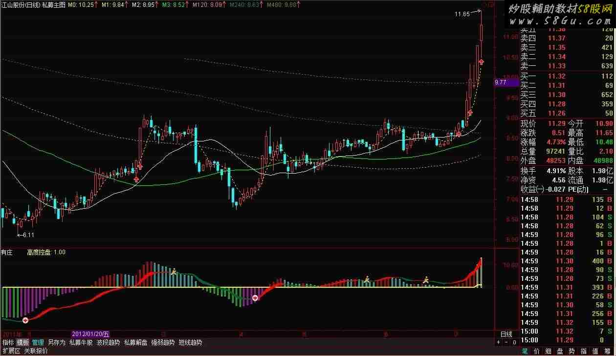 VAR1:=EMA(EMA(CLOSE,13),13);控盘:=(VAR1-REF(VAR1,1))/REF(VAR1,1)*1000;STICKLINE(控盘<0,控盘,0,1,1),COLOR00FF00;STICKLINE(控盘>REF(控盘,1) AND 控盘<0,控盘,0,1,1),COLORFF00FF;无庄控盘:=控盘<0;STICKLINE(控盘>REF(控盘,1) AND 控盘>0,控盘,0,1,1),COLOR0000FF;有庄控盘:=控盘>REF(控盘,1) AND 控盘>0;VAR2:=100*WINNER(CLOSE*0.95);STICKLINE(控盘<REF(控盘,1) AND 控盘>0,控盘,0,1,1),COLORFFFF00;主力出货:=控盘<REF(控盘,1) AND 控盘>0;STICKLINE(VAR2>50 AND COST(85)<CLOSE AND 控盘>0,控盘,0,1,1),COLOR00FFFF;高度控盘: VAR2>50 AND COST(85)<CLOSE AND 控盘>0,COLOR00FFFF,LINETHICK2;A10:=CROSS(控盘,0);控盘B:=FILTER(IF(A10,1,0),5);{分时价格原码}JJ:=DYNAINFO(11);{波段买卖原码}P:=55;S:=8;M1:=3;财:=(EMA(CLOSE,S)-EMA(CLOSE,P))*10,COLORRED,LINETHICK2;神:=EMA(财,M1),COLORGREEN,LINETHICK1;DRAWBAND(财,RGB(255,0,0),神,RGB(0,100,50));{股价与均线偏离买卖条件}BTJ1:=(C-JJ)/JJ<-0.005;BTJ11:=(C-JJ)/JJ<-0.03;BTJ12:=LAST(JJ>=REF(JJ,1),5,1) AND (C-JJ)/JJ<0.005;STJ1:=(C-JJ)/JJ>0.005;{控盘买卖条件}STJ01:=控盘<REF(控盘,1) AND 控盘>0.5;STJ02:=控盘>0;BTJ2:=控盘>REF(控盘,1) AND 控盘<-0.2;BTJ22:=控盘>REF(控盘,1) AND 控盘<0 ;{波段买卖条件}BTJ3:=CROSS(财,神) AND 财<-0.3;BTJ32:=CROSS(财,神) AND 财<-0.1;STJ31:=CROSS(神,财);STJ32:=CROSS(神,财) AND 财>1.618;{以下为信号};BTJ81:=FILTER(BTJ1 AND BTJ2 AND BTJ3,13);BTJ811:=FILTER(BTJ11 AND BTJ2 AND BTJ3,13);BTJ82:=FILTER(BTJ12 AND BTJ22 AND BTJ32,13);DRAWICON(BTJ82,神,23);{追买};DRAWICON(BTJ81 AND TIME>10,神,27);{};DRAWICON(BTJ811 AND TIME>10,神,26);{有庄};DRAWTEXT(BTJ81,神,''),COLORRED;DRAWTEXT(BTJ811,神*1.2,'有庄'),COLORWHITE;STJ81:=FILTER(STJ1 AND STJ01 AND STJ31,13);DRAWICON(STJ81,神,19);STJ82:=FILTER(STJ02 AND STJ32 ,13);DRAWICON(STJ82,神,15);STJ83:=STJ81 AND STJ82;DRAWTEXT(STJ83,神,'必卖'),COLOR00FF00; |