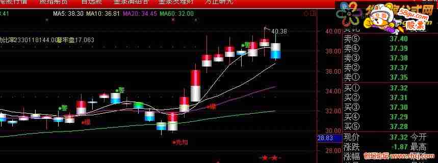 VAR1:=((CLOSE-MA(CLOSE,6))/MA(CLOSE,6)*100+(CLOSE-MA(CLOSE,24))/MA(CLOSE,24)*100+(CLOSE-MA(CLOSE,32))/MA(CLOSE,32)*100)/3; VARB:=(((MA(CLOSE,5) > MA(CLOSE,10)) AND (MA(CLOSE,10) > MA(CLOSE,30))) AND (MA(CLOSE,30) > MA(CLOSE,60))); 短线:=MA(CLOSE,13),COLORRED,LINETHICK3; VAR12:=(HIGH - LOW); VAR3:=ABS((OPEN - CLOSE)); VAR4:=(HIGH - IF((CLOSE > OPEN),CLOSE,OPEN)); VAR5:=(IF((CLOSE > OPEN),OPEN,CLOSE) - LOW); VAR6:=((VAR3 / VAR12) * VOL); VAR7:=((VAR4 / VAR12) * VOL); VAR8:=((VAR5 / VAR12) * VOL); DRAWTEXT((((((VAR6 > (MA(VOL,5) * 2)) AND 短线>REF(短线 ,1) AND (VAR6 >= VAR7)) AND (VAR6 >= VAR8)) AND (CLOSE > OPEN)) OR ((VOL >(MA(VOL,5) * 3)) AND VARB)) ,L*0.97,'●狙击'),COLOR00FFFF; STICKLINE(CLOSE>REF(CLOSE,1)*1.0985 AND CLOSE=HIGH,CLOSE,OPEN,4,-1),COLOR00FFFF; STICKLINE(CLOSE<REF(CLOSE,1)*0.9015 AND CLOSE=LOW,CLOSE,OPEN,4,-1),COLORGREEN; DRAWTEXT_FIX(1,0.88,5,0,'~★~★~'),COLORRED; V1:=ABS((2*CLOSE+HIGH+LOW)/4-MA(CLOSE,20))/MA(CLOSE,20); V2:=(1-7/100)*(DMA(CLOSE,V1)); V3:=(1+7/100)*(DMA(CLOSE,V1)); 支撑:REFDATE(V2,DATE),POINTDOT,LINETHICK3,COLORCC66FF; 阻力:REFDATE(V3,DATE),POINTDOT,LINETHICK3,COLORGREEN;STICKLINE(OPEN>=CLOSE,CLOSE,OPEN,3,0),COLORFF7700; STICKLINE(OPEN>=CLOSE,CLOSE,OPEN,2.2,0),COLORFF9900; STICKLINE(OPEN>=CLOSE,CLOSE,OPEN,1.5,0),COLORFFBB00; STICKLINE(OPEN>=CLOSE,CLOSE,OPEN,0.5,0),COLORCYAN; STICKLINE(CLOSE>OPEN,CLOSE,OPEN,3,0),COLOR000099; STICKLINE(CLOSE>OPEN,CLOSE,OPEN,2.2,0),COLOR0000CC; STICKLINE(CLOSE>OPEN,CLOSE,OPEN,1.5,0),COLOR0000FF; STICKLINE(CLOSE>OPEN,CLOSE,OPEN,0.5,0),COLORCC66FF; STICKLINE(VAR3,OPEN,(OPEN+CLOSE)/2,3,0),COLOR009900; STICKLINE(VAR3,OPEN,(OPEN+CLOSE)/2,2.2,0),COLOR00BB00; STICKLINE(VAR3,OPEN,(OPEN+CLOSE)/2,1.5,0),COLOR00DD00; STICKLINE(VAR3,OPEN,(OPEN+CLOSE)/2,0.5,0),COLOR00FF00; STICKLINE(VAR4,OPEN,(OPEN+CLOSE)/2,3,0),COLOR999999; STICKLINE(VAR4,OPEN,(OPEN+CLOSE)/2,2.2,0),COLORBBBBBB; STICKLINE(VAR4,OPEN,(OPEN+CLOSE)/2,1.5,0),COLORDDDDDD; STICKLINE(VAR4,OPEN,(OPEN+CLOSE)/2,0.5,0),COLORFFFFFF; MA5:MA(CLOSE,5),COLORWHITE; MA10:MA(CLOSE,10),COLORYELLOW; MA20:MA(CLOSE,20),COLORMAGENTA; MA60:MA(CLOSE,60),COLORGREEN; 爆点:=CROSS(MA5,MA10); DRAWTEXT(爆点,MA10*0.99,'●爆'),COLORRED; BIAS1:=(C-MA(C,6))/MA(C,6)*100; BIAS2:=(C-MA(C,12))/MA(C,12)*100; BIAS3:=(C-MA(C,24))/MA(C,24)*100; BIAS:=(BIAS1+2*BIAS2+3*BIAS3)/6; 乖离:=MA(BIAS,3); DRAWTEXT(CROSS(BIAS,乖离) AND 乖离<-9.5,L*0.99,'●底'),COLORRED; K:=(C+H+L)/3; D:=MA(K,4); DRAWTEXT(REF(C,1)>D AND C<D AND D>REF(D,1),H*1.02,'●警'),COLORGREEN; DRAWTEXT(REF(C,1)<D AND C>D AND D<REF(D,1) AND C>REF(C,1)*1.045,L*0.98, '●先知'),COLORRED; {以下含未来函数,不影响以上参数,不喜欢可删除} DRAWTEXT_FIX(1,0.00,0,0,'所属行业:')COLORRED; DRAWTEXT_FIX(1,0.07,0,0,HYBLOCK)COLORRED; DRAWTEXT_FIX(1,0.14,0,0,'所属地区:')COLORLIBLUE; DRAWTEXT_FIX(1,0.21,0,0,DYBLOCK)COLOR00FFFF; DRAWTEXT_FIX(1,0.00,0.12,0,'财务分折:')COLORMAGENTA; DRAWTEXT_FIX(1,0.07,0.06,0,EXTERNSTR(0,1))COLOR0000FF; DRAWTEXT_FIX(1,0.05,0.12,0,'现金流:'),COLOR00CCCC; DRAWNUMBER_FIX(1,0.086,0.12,0,CONST(FINANCE(25)/1000000000)),COLOR00CCCC; DRAWTEXT_FIX(1,0.125,0.12,0,'应收款:'),COLOR00CCCC; DRAWNUMBER_FIX(1,0.159,0.12,0,CONST(FINANCE(22)/100000000)),COLOR00CCCC; DRAWTEXT_FIX(1,0.193,0.12,0,'存货:'),COLOR00CCCC; DRAWNUMBER_FIX(1,0.218,0.12,0,CONST(FINANCE(27)/100000000)),COLOR00CCCC; DRAWTEXT_FIX(1,0.253,0.12,0,'流动比率:'),COLOR00CCCC;{流动比率值>1.5<2.5较为合理,低于1说明偿债能力欠佳。} DRAWNUMBER_FIX(1,0.299,0.12,0,CONST(FINANCE(11)/FINANCE(15))),COLOR00CCCC; DRAWTEXT_FIX(1,0.336,0.12,0,'速动比率:'),COLOR00CCCC; DRAWNUMBER_FIX(1,0.383,0.12,0,CONST(FINANCE(11)-FINANCE(27)/FINANCE(15))),COLOR00CCCC; DRAWTEXT_FIX(1,0.47,0.12,0,'套牢盘%:'),COLOR00CCCC; DRAWNUMBER_FIX(1,0.507,0.12,0,CONST(100-WINNER(CLOSE)*100)),COLOR00CCCC;  |