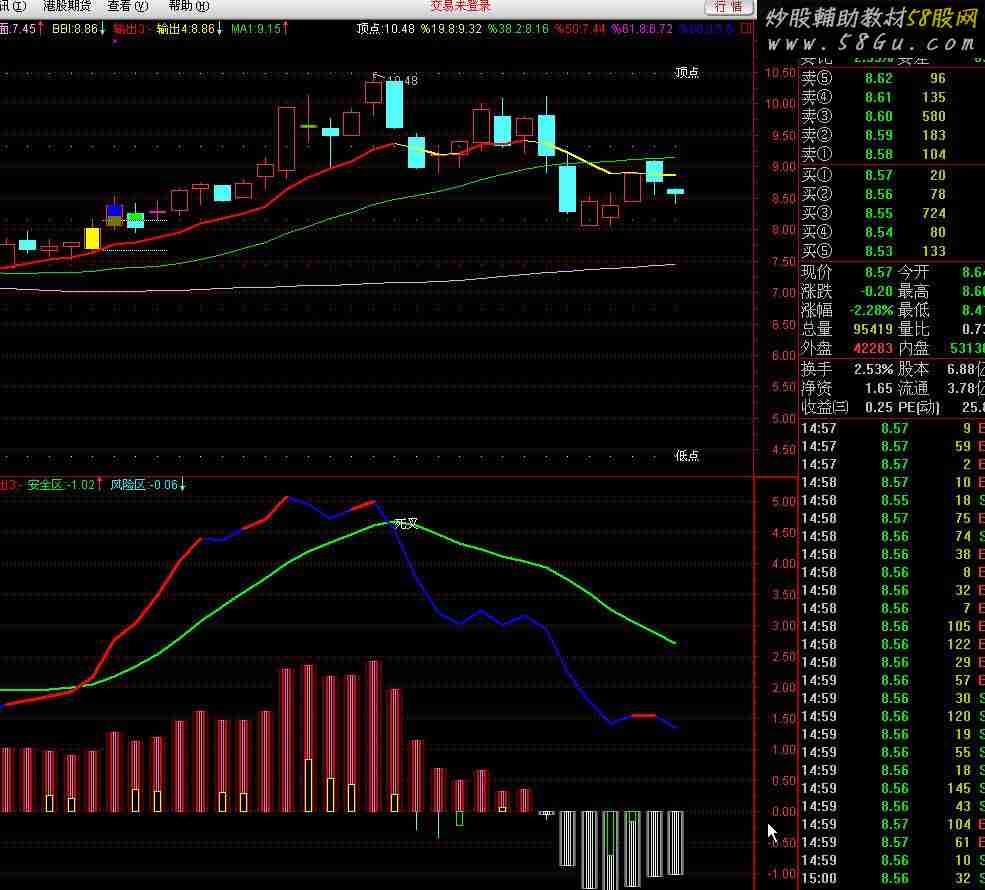 {附图} 拉升力:=(CLOSE-LLV(LOW,28))/(HHV(HIGH,30)-LLV(LOW,36))*0.6*CLOSE; 拉升力A:=SMA(拉升力,6.3,1); 波段线:SMA(拉升力A,3,1),COLORGREEN,LINETHICK2; 拉升力B:=3*拉升力A-2.1*波段线; 空方:=3*波段线-1* 拉升力A; 顶底探测线:IF(空方>拉升力B,拉升力B,空方),LINETHICK2,COLORBLUE; {PARTLINE(顶底探测线,顶底探测线>=REF(顶底探测线,1),RGB(255,0,0),顶底探测线<REF(顶底探测线,1),RGB(0,250,0)),LINETHICK3;} IF(顶底探测线>=REF(顶底探测线,1),顶底探测线,DRAWNULL),LINETHICK3,COLORRED; 短线:=(CLOSE-MA(CLOSE,13))/MA(CLOSE,13)*20,LINETHICK0,COLORYELLOW; 中线:=(CLOSE-MA(CLOSE,4))/MA(CLOSE,4)*20,LINETHICK0,COLORWHITE; 安全区:SMA(短线,3,1),LINETHICK0,COLOR0000FF; 风险区:SMA(中线,3,1),COLORSTICK,COLORFFFF00; {安全区} STICKLINE(安全区<REF(安全区,0.5)AND 安全区>0,0,安全区,0,1 ),COLOR0000FF; STICKLINE(安全区<REF(安全区,1)AND 安全区>0,0,安全区,3,1 ),COLOR000033; STICKLINE(安全区<REF(安全区,1)AND 安全区>0,0,安全区,2.7,1 ),COLOR000066; STICKLINE(安全区<REF(安全区,0.5)AND 安全区>0,0,安全区,2.1,1 ),COLOR000099; STICKLINE(安全区<REF(安全区,1)AND 安全区>0,0,安全区,1.5,1 ),COLOR0000CC; STICKLINE(安全区<REF(安全区,1)AND 安全区>0,0,安全区,0.9,1 ),COLOR0000FF; STICKLINE(安全区<REF(安全区,1)AND 安全区>0,0,安全区,0.3,1 ),COLORCC66FF; STICKLINE(安全区>REF(安全区,0.5)AND 安全区>0,0,安全区,0,1 ),COLOR0000FF; STICKLINE(安全区>REF(安全区,1)AND 安全区>0,0,安全区,3,1 ),COLOR000033; STICKLINE(安全区>REF(安全区,1)AND 安全区>0,0,安全区,2.7,1 ),COLOR000066; STICKLINE(安全区>REF(安全区,0.5)AND 安全区>0,0,安全区,2.1,1 ),COLOR000099; STICKLINE(安全区>REF(安全区,1)AND 安全区>0,0,安全区,1.5,1 ),COLOR0000CC; STICKLINE(安全区>REF(安全区,1)AND 安全区>0,0,安全区,0.9,1 ),COLOR0000FF; STICKLINE(安全区>REF(安全区,1)AND 安全区>0,0,安全区,0.3,1 )COLORCC66FF; STICKLINE(风险区<REF(风险区,1) AND 风险区>0,0,风险区,1,1),COLOR00FFFF; {风险区} STICKLINE(安全区>REF(安全区,1)AND 安全区<0,0,安全区,0,1 ),COLORWHITE; STICKLINE(安全区>REF(安全区,1)AND 安全区<0,0,安全区,3,1 ),COLOR555555; STICKLINE(安全区>REF(安全区,1)AND 安全区<0,0,安全区,2.7,1 ),COLOR777777; STICKLINE(安全区>REF(安全区,1)AND 安全区<0,0,安全区,2.1,1 ),COLOR999999; STICKLINE(安全区>REF(安全区,0)AND 安全区<0,0,安全区,1.5,1 ),COLORBBBBBB; STICKLINE(安全区>REF(安全区,1)AND 安全区<0,0,安全区,0.9,1 ),COLORDDDDDD; STICKLINE(安全区>REF(安全区,1)AND 安全区<0,0,安全区,0.3,1 ),COLORFFFFFF; STICKLINE(安全区<REF(安全区,1)AND 安全区<0,0,安全区,0,1 ),COLORWHITE; STICKLINE(安全区<REF(安全区,1)AND 安全区<0,0,安全区,3,1 ),COLOR555555; STICKLINE(安全区<REF(安全区,1)AND 安全区<0,0,安全区,2.7,1 ),COLOR777777; STICKLINE(安全区<REF(安全区,1)AND 安全区<0,0,安全区,2.1,1 ),COLOR999999; STICKLINE(安全区<REF(安全区,0)AND 安全区<0,0,安全区,1.5,1 ),COLORBBBBBB; STICKLINE(安全区<REF(安全区,1)AND 安全区<0,0,安全区,0.9,1 ),COLORDDDDDD; STICKLINE(安全区<REF(安全区,1)AND 安全区<0,0,安全区,0.3,1 ),COLORFFFFFF; STICKLINE(风险区>REF(风险区,1)AND 风险区<0,0,风险区,1,1),COLORGREEN; DRAWTEXT(CROSS(波段线,顶底探测线),(波段线*0.99),'死叉'),COLORWHITE; (主图) A1:=EMA(C,14)COLORWHITE,LINETHICK1; A1X:=(A1-REF(A1,1))/REF(A1,1)*100,NODRAW; 突破:REF(EMA(C,14),1),NODRAW; 距离:(C-突破)/突破*100,NODRAW; 出击:IF(A1X>=0,REF(EMA(C,14),BARSLAST(CROSS(A1X,0))+1),DRAWNULL)COLORRED,LINETHICK1; 休假:IF(A1X<0,REF(EMA(C,14),BARSLAST(CROSS(0,A1X))+1),DRAWNULL)COLORGREEN,LINETHICK1; 涨幅:IF(A1X>=0,(C-出击)/出击*100,DRAWNULL)NODRAW; 跌幅:IF(A1X<0,(C-休假)/休假*100,DRAWNULL)NODRAW; STICKLINE(CROSS(A1X,0),C,O,2,0)COLORYELLOW; STICKLINE(CROSS(0,A1X),C,O,2,0)COLORGREEN; STICKLINE(CROSS(A1X,0)OR CROSS(0,A1X),REF(EMA(C,14),1),REF(EMA(C,14),1)*0.998,2,0)COLORWHITE; STICKLINE(ISLASTBAR,REF(EMA(C,14),1),REF(EMA(C,14),1)*0.998,5,0)COLORWHITE; 买线:=EMA(CLOSE,2); 卖线:=EMA(((SLOPE(CLOSE,21) * 20) + CLOSE),42); BBUY:=CROSS(买线,卖线); SEL:=CROSS(卖线,买线); STICKLINE((买线 >= 卖线),LOW,HIGH,0.1,0),COLOR0000FF; STICKLINE((买线 >= 卖线),CLOSE,OPEN,3,0),COLOR000077; STICKLINE((买线 >= 卖线),CLOSE,OPEN,2.6,0),COLOR000099; STICKLINE((买线 >= 卖线),CLOSE,OPEN,2,0),COLOR0000BB; STICKLINE((买线 >= 卖线),CLOSE,OPEN,1.3,0),COLOR0000DD; STICKLINE((买线 >= 卖线),CLOSE,OPEN,0.4,0),COLOR0000FF; STICKLINE((买线 < 卖线),LOW,HIGH,0.1,0),COLORFFFF00; STICKLINE((买线 < 卖线),CLOSE,OPEN,3,0),COLOR777700; STICKLINE((买线 < 卖线),CLOSE,OPEN,2.6,0),COLOR999900; STICKLINE((买线 < 卖线),CLOSE,OPEN,2,0),COLORBBBB00; STICKLINE((买线 < 卖线),CLOSE,OPEN,1.3,0),COLORDDDD00; STICKLINE((买线 < 卖线),CLOSE,OPEN,0.4,0),COLORFFFF00; STICKLINE((CROSS(买线,卖线) OR CROSS(卖线,买线)),OPEN,CLOSE,0.1,0),COLOR0055FF; STICKLINE((CROSS(买线,卖线) OR CROSS(卖线,买线)),OPEN,CLOSE,3,0),COLOR0077FF; STICKLINE((CROSS(买线,卖线) OR CROSS(卖线,买线)),OPEN,CLOSE,2.6,0),COLOR0099FF; STICKLINE((CROSS(买线,卖线) OR CROSS(卖线,买线)),OPEN,CLOSE,2,0),COLOR00BBFF; STICKLINE((CROSS(买线,卖线) OR CROSS(卖线,买线)),OPEN,CLOSE,1.3,0),COLOR00DDFF; STICKLINE((CROSS(买线,卖线) OR CROSS(卖线,买线)),OPEN,CLOSE,0.4,0),COLOR00FFFF; 日:=150;昨前:=3; 高1:=REF(HHV(H,日),昨前); 低1:=REF(LLV(L,日),昨前); H1:=高1-(高1-低1)*0.191; H2:=高1-(高1-低1)*0.382; H3:=高1-(高1-低1)*0.5; H4:=高1-(高1-低1)*0.618; H5:=高1-(高1-低1)*0.809; 顶:REFDATE(高1,DATE),COLORRED,POINTDOT; 一0.809:REFDATE(H1,DATE),COLORYELLOW,POINTDOT; 二0.618:REFDATE(H2,DATE),COLORMAGENTA,POINTDOT; 三0.500:REFDATE(H3,DATE),COLORWHITE,POINTDOT; 四0.382:REFDATE(H4,DATE),COLORGREEN,POINTDOT; 五0.191:REFDATE(H5,DATE),COLORYELLOW,POINTDOT; 低:REFDATE(低1,DATE),