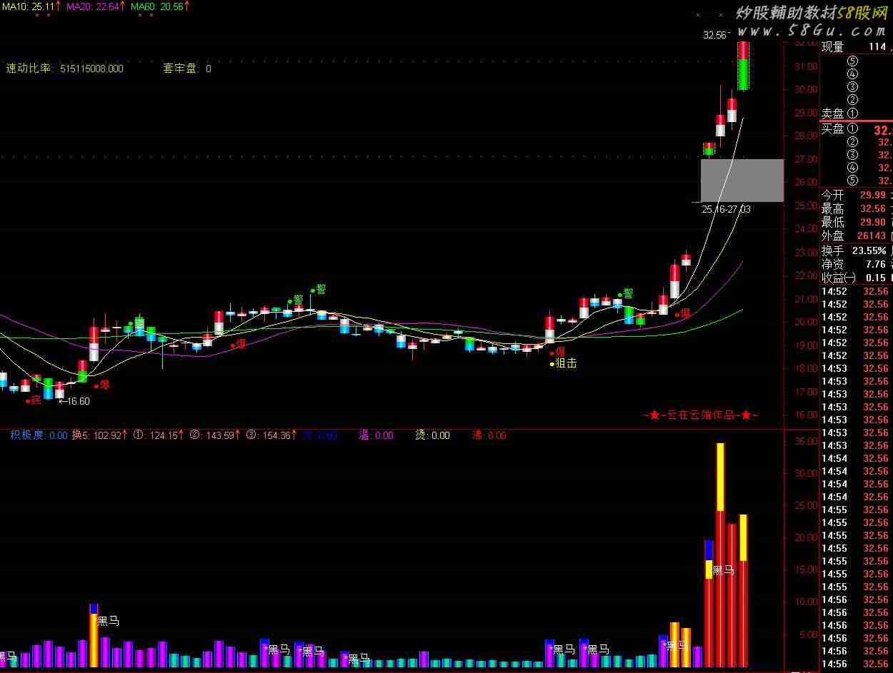 VAR1:=((CLOSE-MA(CLOSE,6))/MA(CLOSE,6)*100+(CLOSE-MA(CLOSE,24))/MA(CLOSE,24)*100+(CLOSE-MA(CLOSE,32))/MA(CLOSE,32)*100)/3; VARB:=(((MA(CLOSE,5) > MA(CLOSE,10)) AND (MA(CLOSE,10) > MA(CLOSE,30))) AND (MA(CLOSE,30) > MA(CLOSE,60))); 短线:=MA(CLOSE,13),COLORRED,LINETHICK3; VAR12:=(HIGH - LOW); VAR3:=ABS((OPEN - CLOSE)); VAR4:=(HIGH - IF((CLOSE > OPEN),CLOSE,OPEN)); VAR5:=(IF((CLOSE > OPEN),OPEN,CLOSE) - LOW); VAR6:=((VAR3 / VAR12) * VOL); VAR7:=((VAR4 / VAR12) * VOL); VAR8:=((VAR5 / VAR12) * VOL); DRAWTEXT((((((VAR6 > (MA(VOL,5) * 2)) AND 短线>REF(短线 ,1) AND (VAR6 >= VAR7)) AND (VAR6 >= VAR8)) AND (CLOSE > OPEN)) OR ((VOL >(MA(VOL,5) * 3)) AND VARB)) ,L*0.97,'●狙击'),COLOR00FFFF; STICKLINE(CLOSE>REF(CLOSE,1)*1.0985 AND CLOSE=HIGH,CLOSE,OPEN,4,-1),COLOR00FFFF; STICKLINE(CLOSE<REF(CLOSE,1)*0.9015 AND CLOSE=LOW,CLOSE,OPEN,4,-1),COLORGREEN; DRAWTEXT_FIX(1,0.88,5,0,'~★~云在云端作品~★~'),COLORRED; V1:=ABS((2*CLOSE+HIGH+LOW)/4-MA(CLOSE,20))/MA(CLOSE,20); V2:=(1-7/100)*(DMA(CLOSE,V1)); V3:=(1+7/100)*(DMA(CLOSE,V1)); 支撑:REFDATE(V2,DATE),POINTDOT,LINETHICK3,COLORCC66FF; 阻力:REFDATE(V3,DATE),POINTDOT,LINETHICK3,COLORGREEN;STICKLINE(OPEN>=CLOSE,CLOSE,OPEN,3,0),COLORFF7700; STICKLINE(OPEN>=CLOSE,CLOSE,OPEN,2.2,0),COLORFF9900; STICKLINE(OPEN>=CLOSE,CLOSE,OPEN,1.5,0),COLORFFBB00; STICKLINE(OPEN>=CLOSE,CLOSE,OPEN,0.5,0),COLORCYAN;